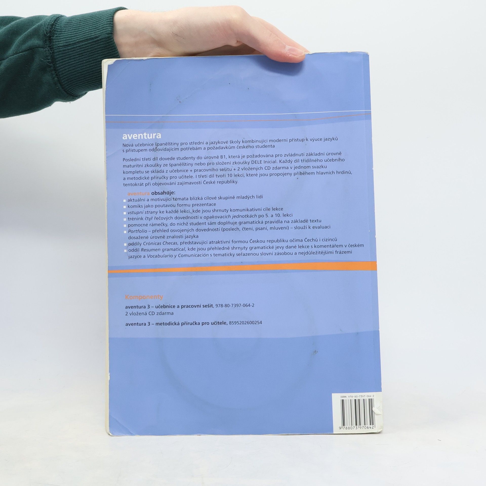 Nová učebnice španělštiny Aventura 3 je určená pro střední a jazykové školy kombinující moderní přístup k výuce jazyků s přístupem odpovídajícím potřebám a požadavkům českého studenta. Poslední, třetí díl dovede studenty do úrovně B1, která je požadována pro zvládnutí základní úrovně maturitní zkoušky ze španělštiny nebo pro složení zkoušky DELE Inicial. I třetí díl tvoří 10 lekcí, které jsou propojeny příběhem hlavních hrdinů, tentokrát při objevování zajímavostí České republiky.