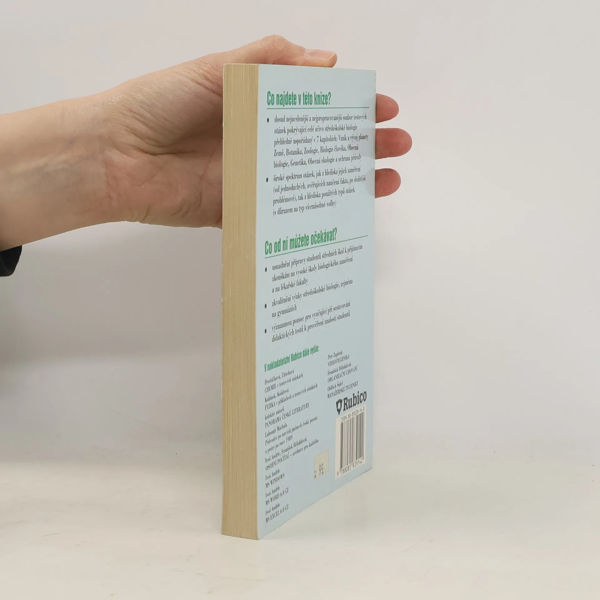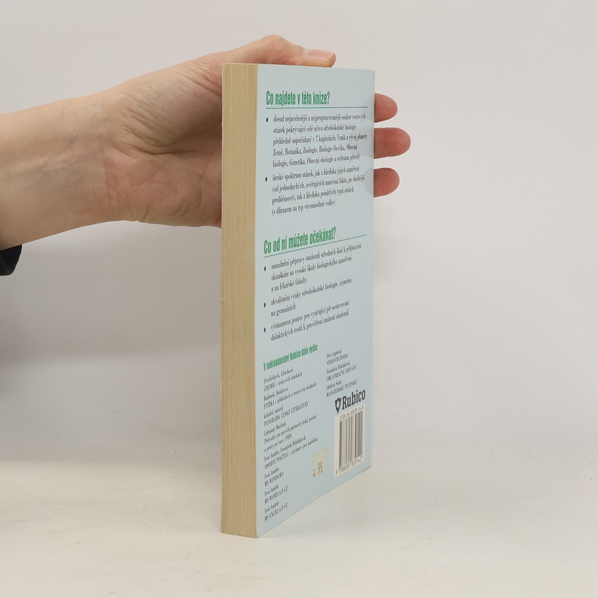 V této knize najdete dosud nejucelenější a nejpropracovanější soubor testových otázek pokrývající celé učivo středoškolské biologie přehledně uspořádaný v 7 kapitolách: Vznik a vývoj planety Země, Botanika, Zoologie, Biologie člověka, Obecná biologie, Genetika, Obecná ekologie a ochrana přírody.