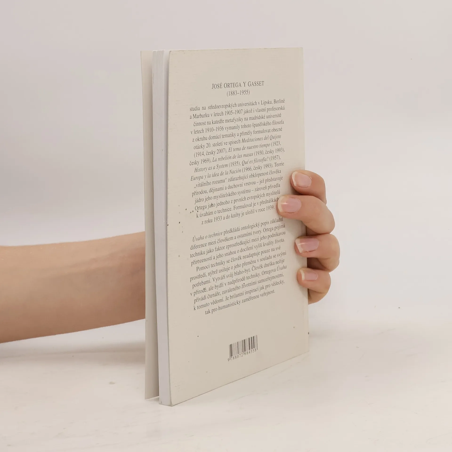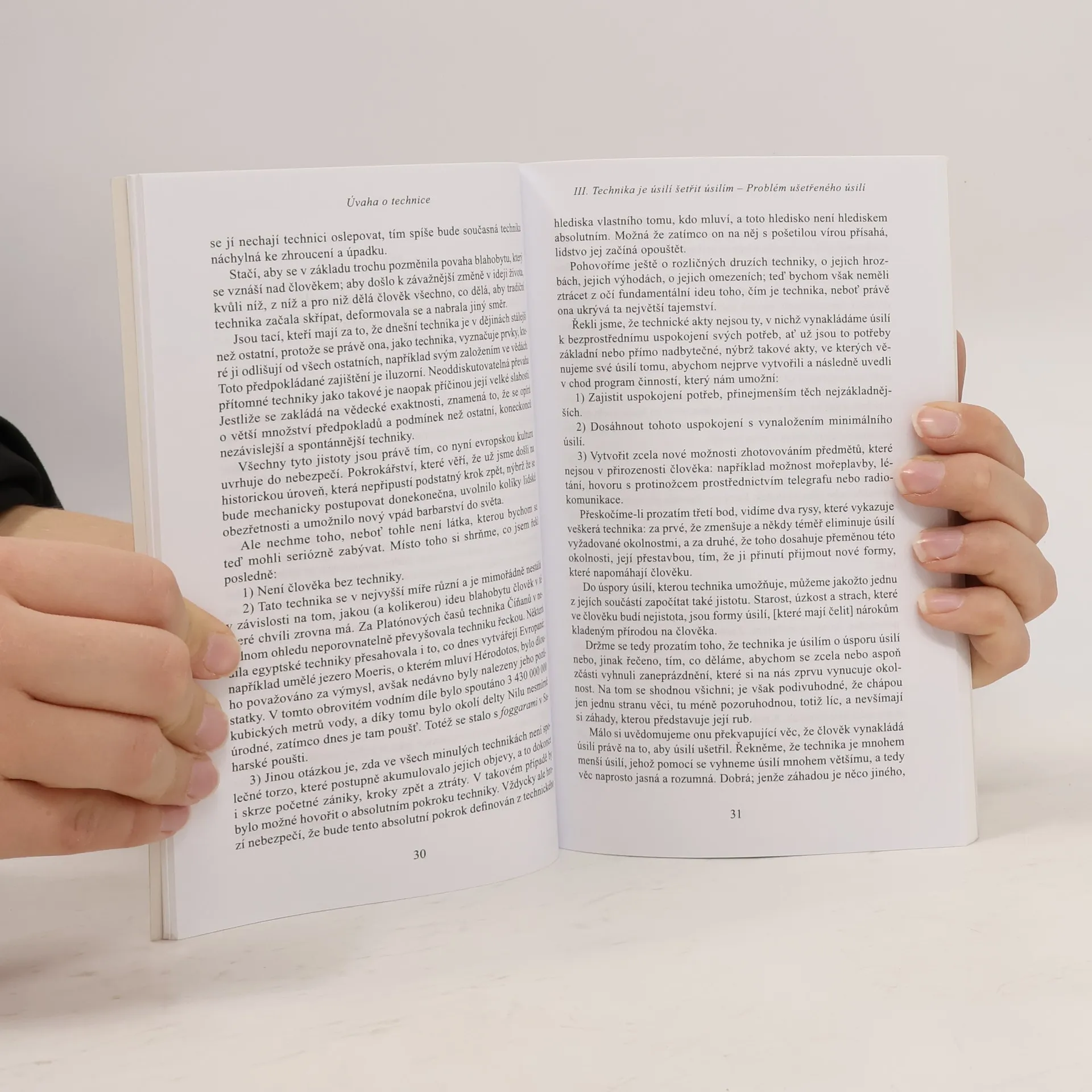Těžištěm svazku je přednáškový cyklus z roku 1933, ve kterém španělský filosof podnikl jeden z vůbec prvních pokusů o teoretické uchopení techniky a jejího vztahu k člověku. V dalších esejích se Ortega y Gasset vyjadřuje k pozdnímu Heideggerovi, s nímž se setkal na kolokviu v Darmstadtu, k filosofickému stylu, k architektuře či k teoretickým problémům fyziky. Přeložil M. Špína.