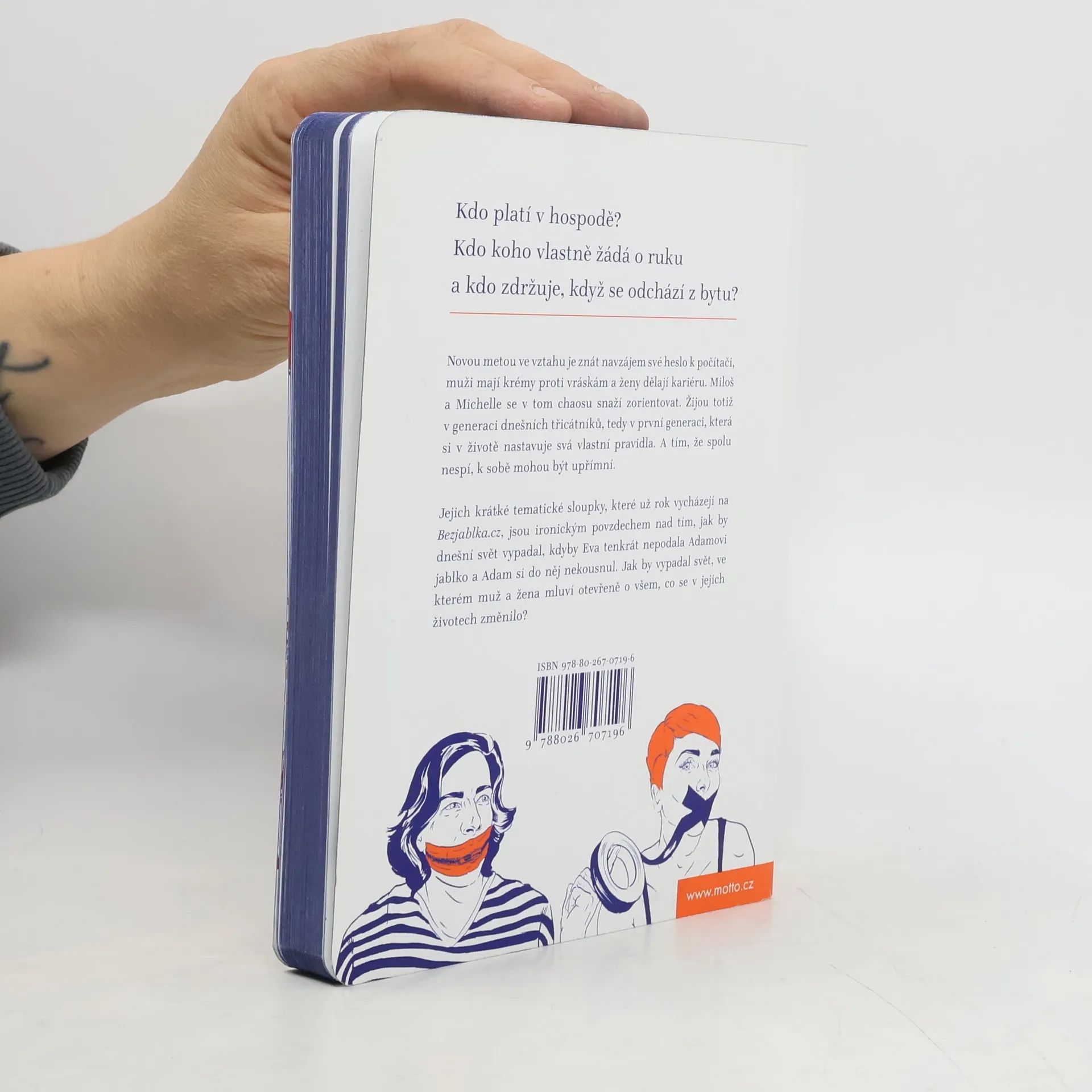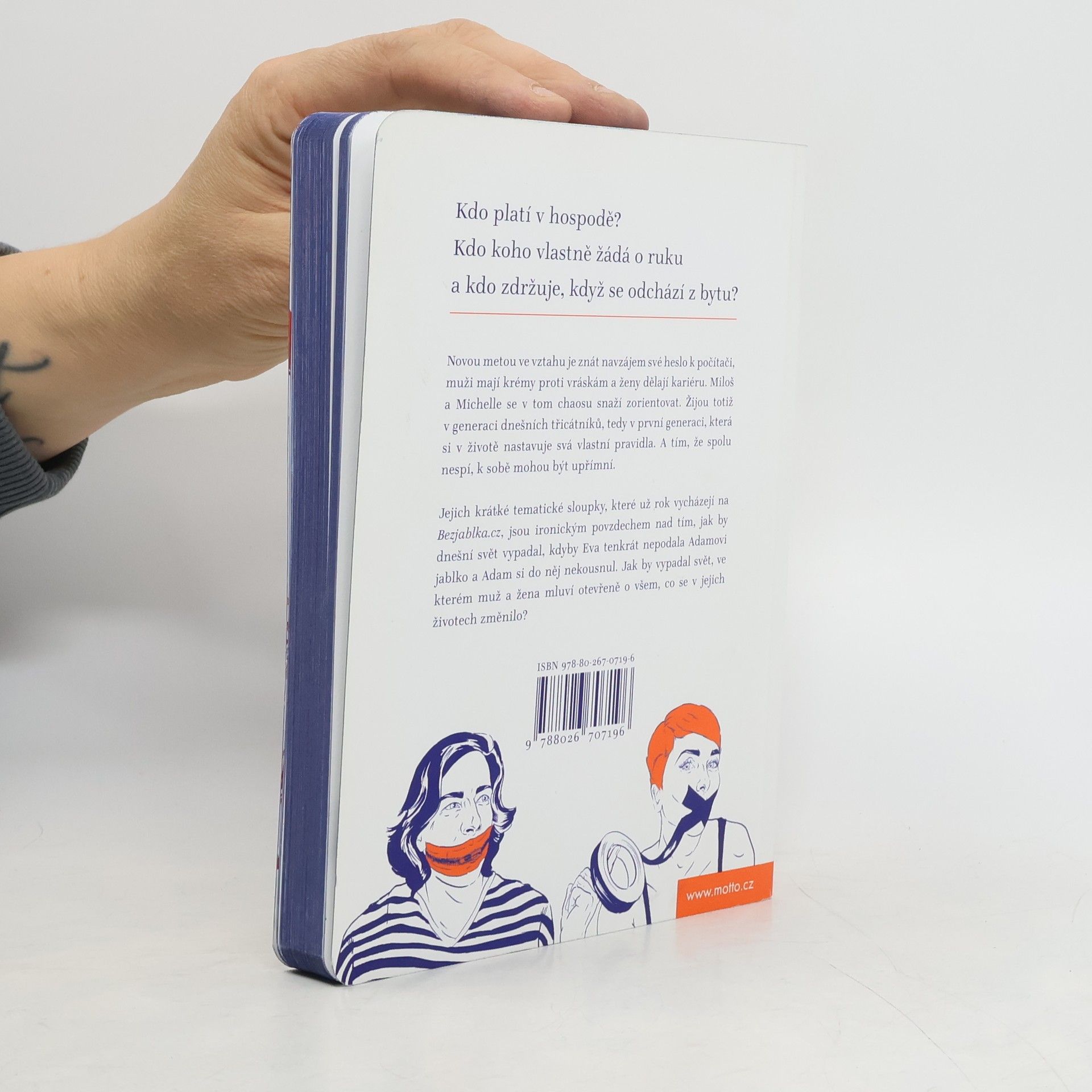 Kdo platí v hospodě? Kdo koho vlastně žádá o ruku a kdo zdržuje, když se odchází z bytu? Žijeme ve světě, který se rychle mění. Tak rychle, že se na některé změny nejsme schopní adaptovat. Novou metou ve vztahu je znát navzájem své heslo k počítači, muži mají krémy proti vráskám a ženy dělají kariéru. Miloš a Michelle se v tom chaosu snaží zorientovat. Žijou totiž v generaci dnešních třicátníků, tedy v první generaci, která si v životě nastavuje svá vlastní pravidla. Pohledem muže a ženy se dotýkají různých situací, pro které v dnešních zběsilých časech najednou není žádný návod. Zkoumají místa, která jsou zanesena stereotypy a u kterých žena zdvihá obočí a muž se kouká jinam. A tím, že spolu nespí, k tobě mohou být upřímní. Jejich krátké tematické sloupky, které už rok vycházejí na Bezjablka.cz, jsou ironickým povzdechem nad tím, jak by dnešní svět vypadal, kdyby Eva tenkrát nepodala Adamovi jablko a Adam si do něj nekousnul. Jak by vypadal svět, ve kterém se žena a muž před sebou nestydí a mluví otevřeně o všem, co se v jejich životech změnilo?