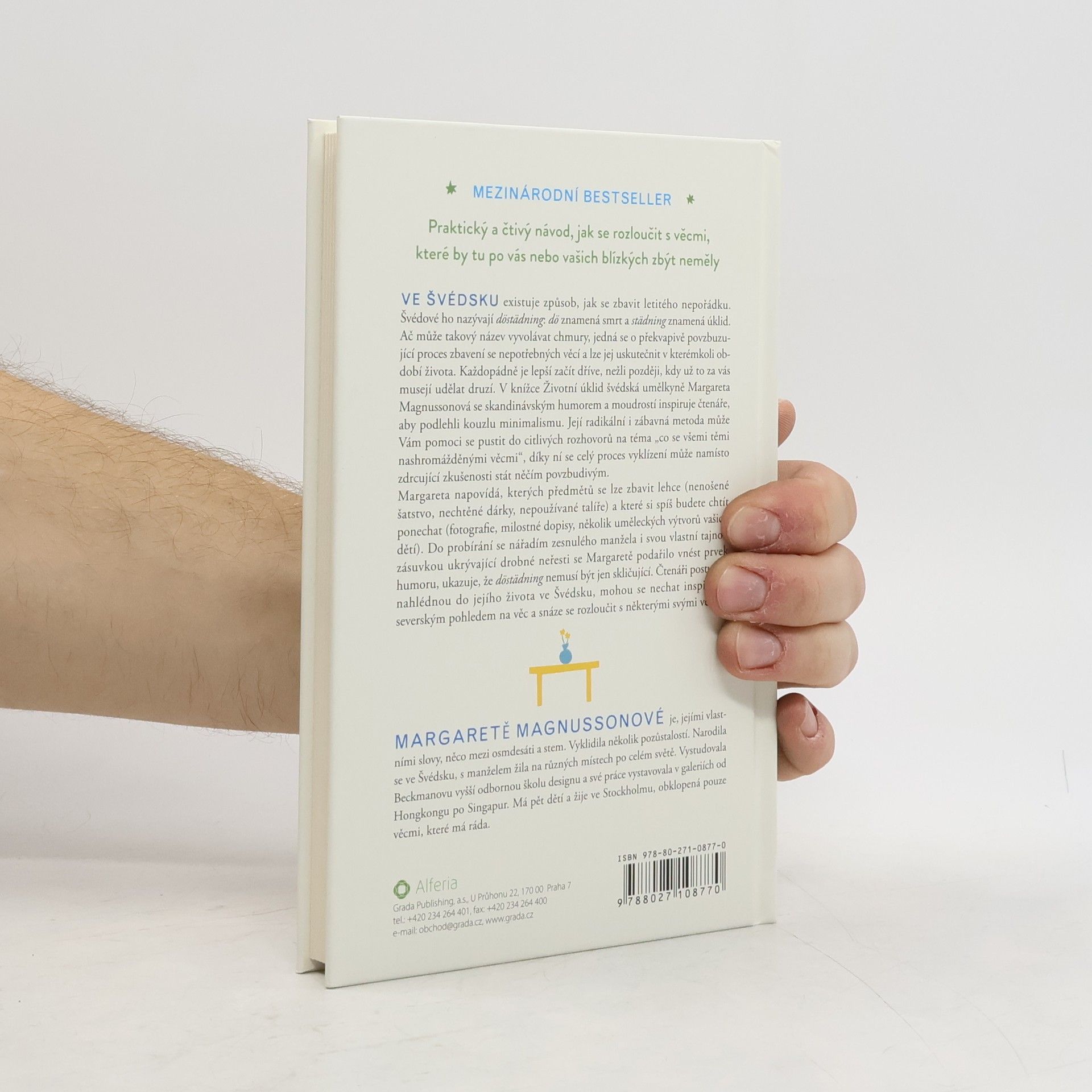 Do hrobu si ten nepořádek přece nevezmete. Ve Švédsku existuje způsob, jak se zbavit letitého nepořádku. Švédové ho nazývají döstädning: dö znamená smrt a städning znamená úklid. Ač může takový název vyvolávat chmury, jedná se o překvapivě povzbuzující proces zbavení se nepotřebných věcí a lze jej uskutečnit v kterémkoli období života. Každopádně je lepší začít dříve, nežli později, kdy už to za vás musejí udělat druzí. V knížce Životní úklid švédská umělkyně Margareta Magnussonová se skandinávským humorem a moudrostí inspiruje čtenáře, aby podlehli kouzlu minimalismu. Její radikální i zábavná metoda může Vám pomoci se pustit do citlivých rozhovorů na téma „co se všemi těmi nashromážděnými věcmi“, díky ní se celý proces vyklízení může namísto zdrcující zkušenosti stát něčím povzbudivým. Margareta napovídá, kterých předmětů se lze zbavit lehce (nenošené šatstvo, nechtěné dárky, nepoužívané talíře) a které si spíš budete chtít ponechat (fotografie, milostné dopisy, několik uměleckých výtvorů vašich dětí). Do probírání se nářadím zesnulého manžela i svou vlastní tajnou zásuvkou ukrývající drobné neřesti se Margaretě podařilo vnést prvek humoru, ukazuje, že döstädning nemusí být jen skličující. Čtenáři postupně nahlédnou do jejího života ve Švédsku, mohou se nechat inspirovat severským pohledem na věc a snáze se rozloučit s některými svými věcmi.