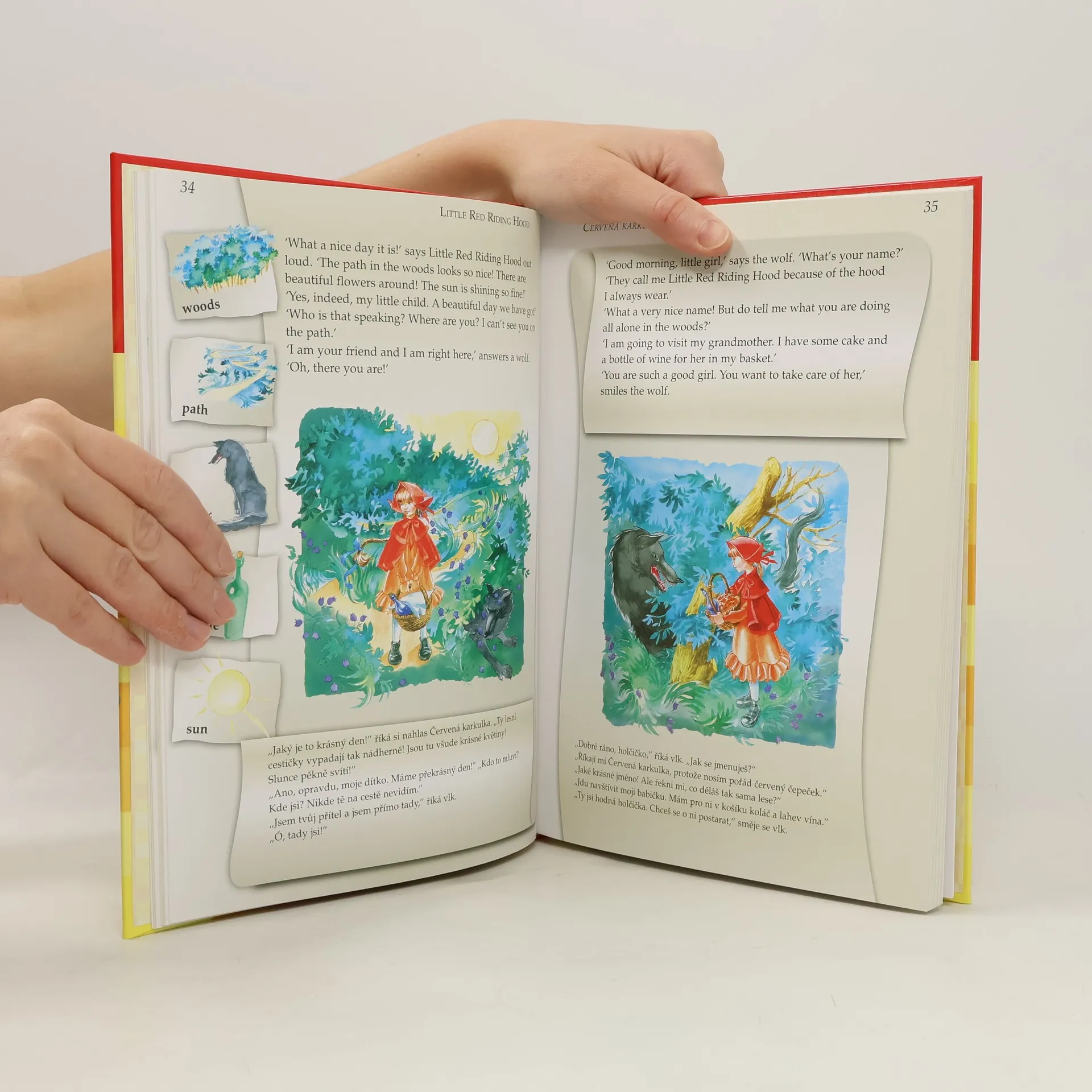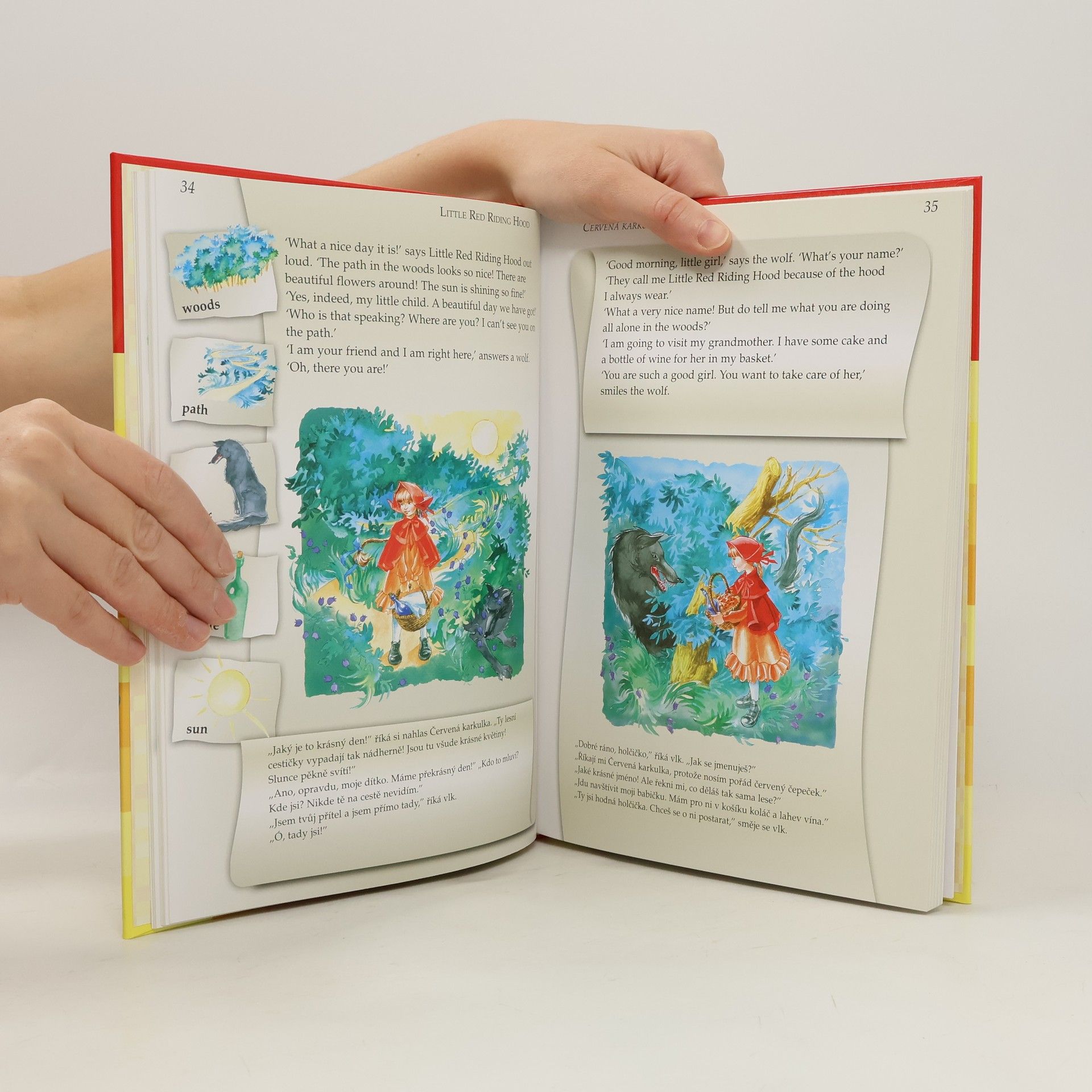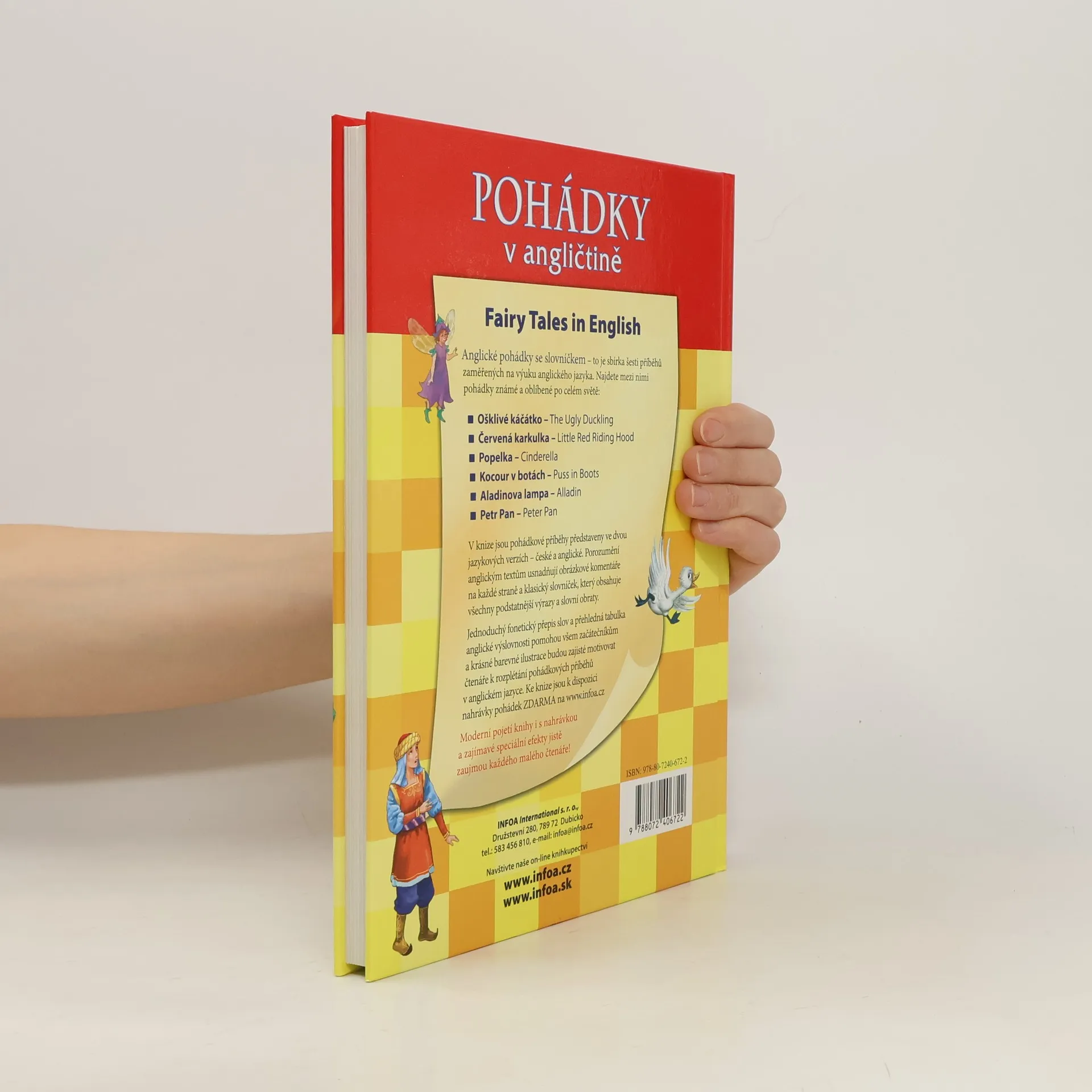 Bohatě ilustrovaná knížka pohádek v dvojjazyčné verzi - anglicko-české. Obsahuje následující pohádky: O Popelce, Červená karkulka, Aladinova lampa, Kocour v botách, Petr Pan, Ošklivé káčátko. Knížka je doplněna souhrným anglicko-českým slovníčkem s fonetickým přepisem a tabulkou výslovnosti a nahrávkou, která je zdarma ke stažení na www.infoa.cz/zbozi/pohadky-v-anglictine/