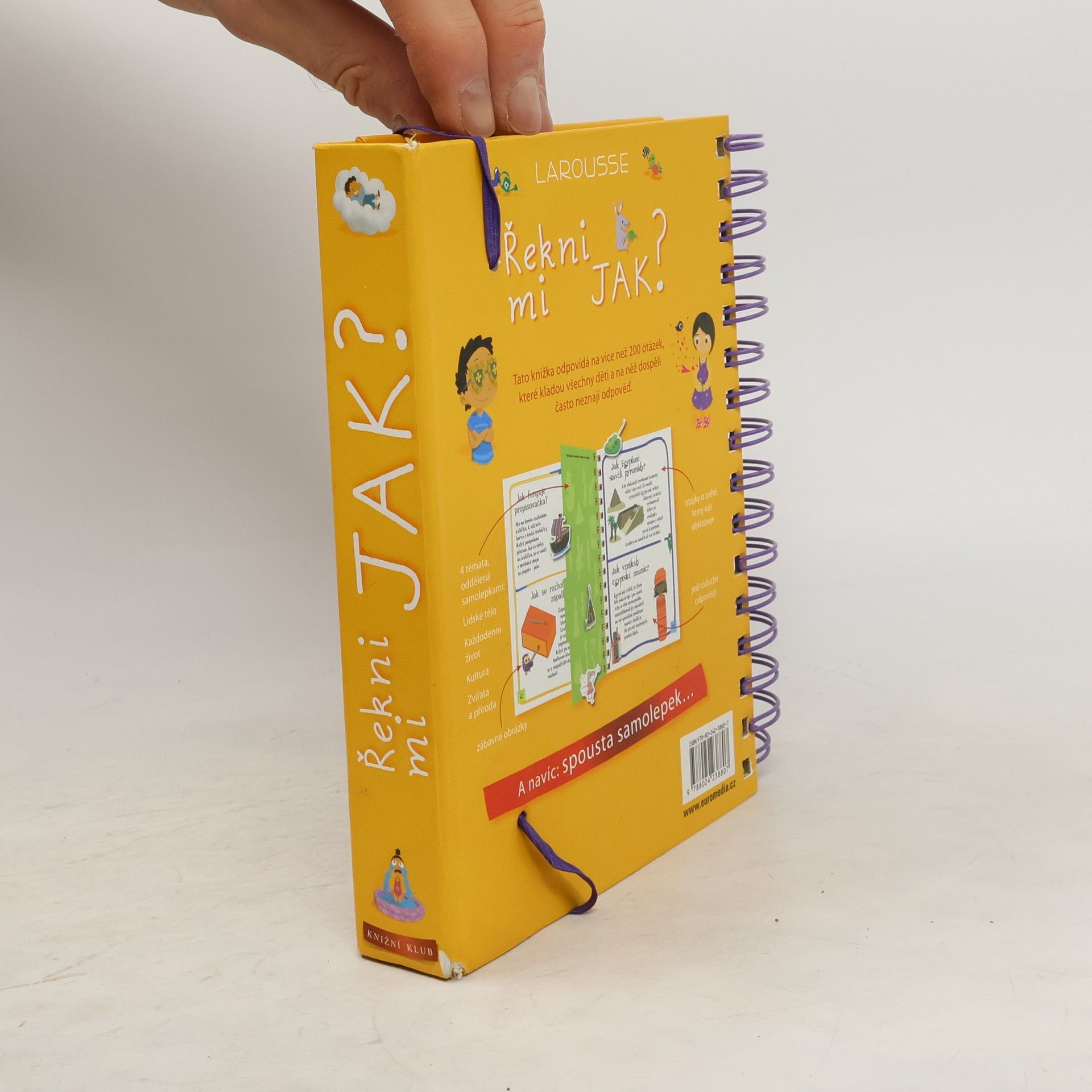 Další z úspěšných encyklopedií pro nejmenší obsahuje odpovědi na více než 200 běžných dětských otázek. Jsou seřazené podle témat do čtyř velkých oblastí: lidské tělo, každodenní život, kultura, zvířata a příroda. Dozvíte se například, jak dýchají rostliny, jak funguje klavír, jak se léčí zubní kazy, jak se dělá čokoláda, jak se jedlo ve středověku a spoustu, spoustu dalšího. Každou tematickou kapitolu doplňují samolepky a veselé obrázky.