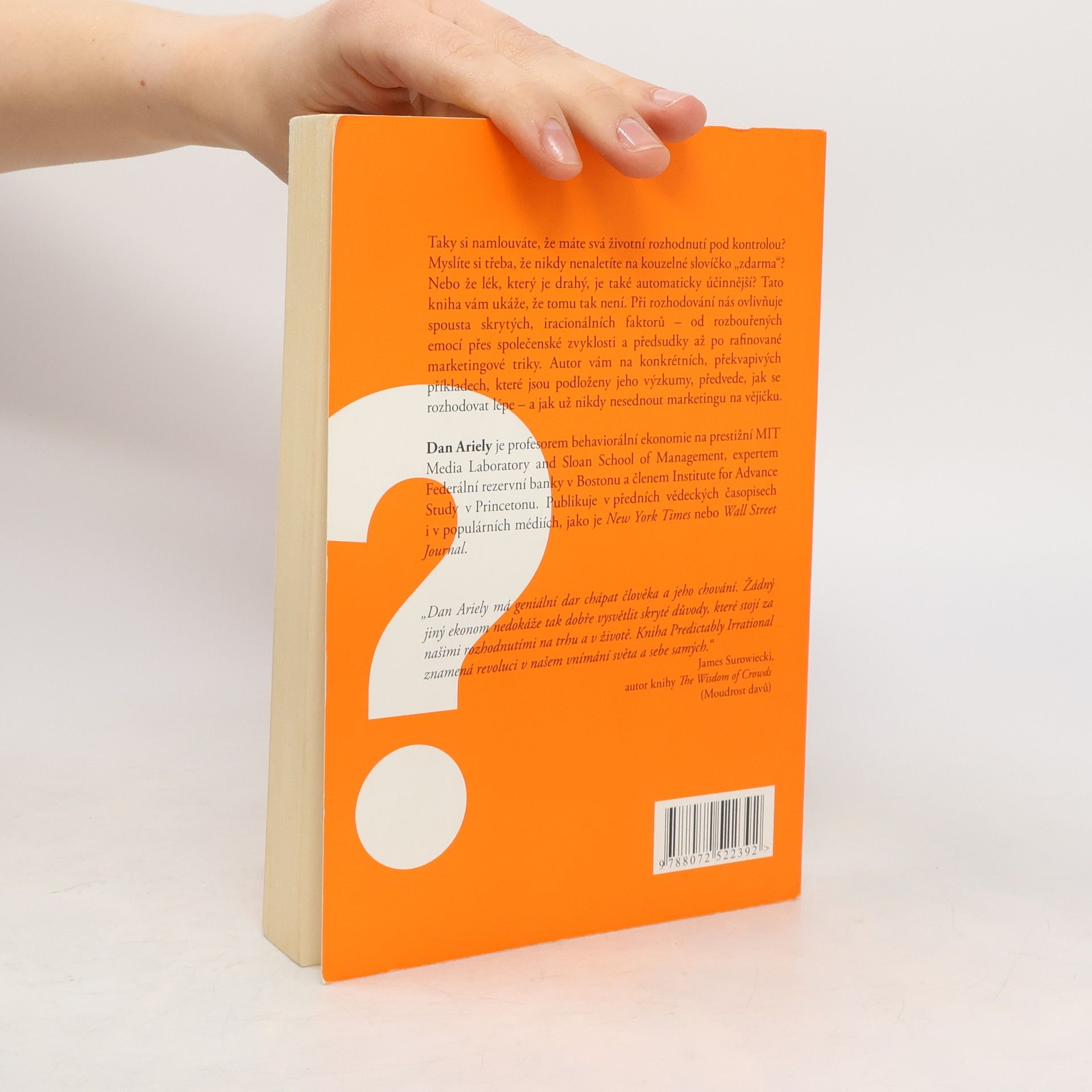 Iracionální faktory v ekonomice i v životě Taky si namlouváte, že máte svá životní rozhodnutí pod kontrolou? Myslíte si třeba, že nikdy nenaletíte na kouzelné slovíčko „zdarma“? Nebo že lék, který je drahý, je také automaticky účinnější? Tato kniha vám ukáže, že tomu tak není. Při rozhodování nás ovlivňuje spousta skrytých, iracionálních faktorů – od rozbouřených emocí přes společenské zvyklosti a předsudky až po rafinované marketingové triky. Autor této vysoce ceněné knihy vám na konkrétních, překvapivých příkladech, které jsou podloženy jeho výzkumy, předvede, jak se rozhodovat lépe – a jak už nikdy nesednout marketingu na vějičku.