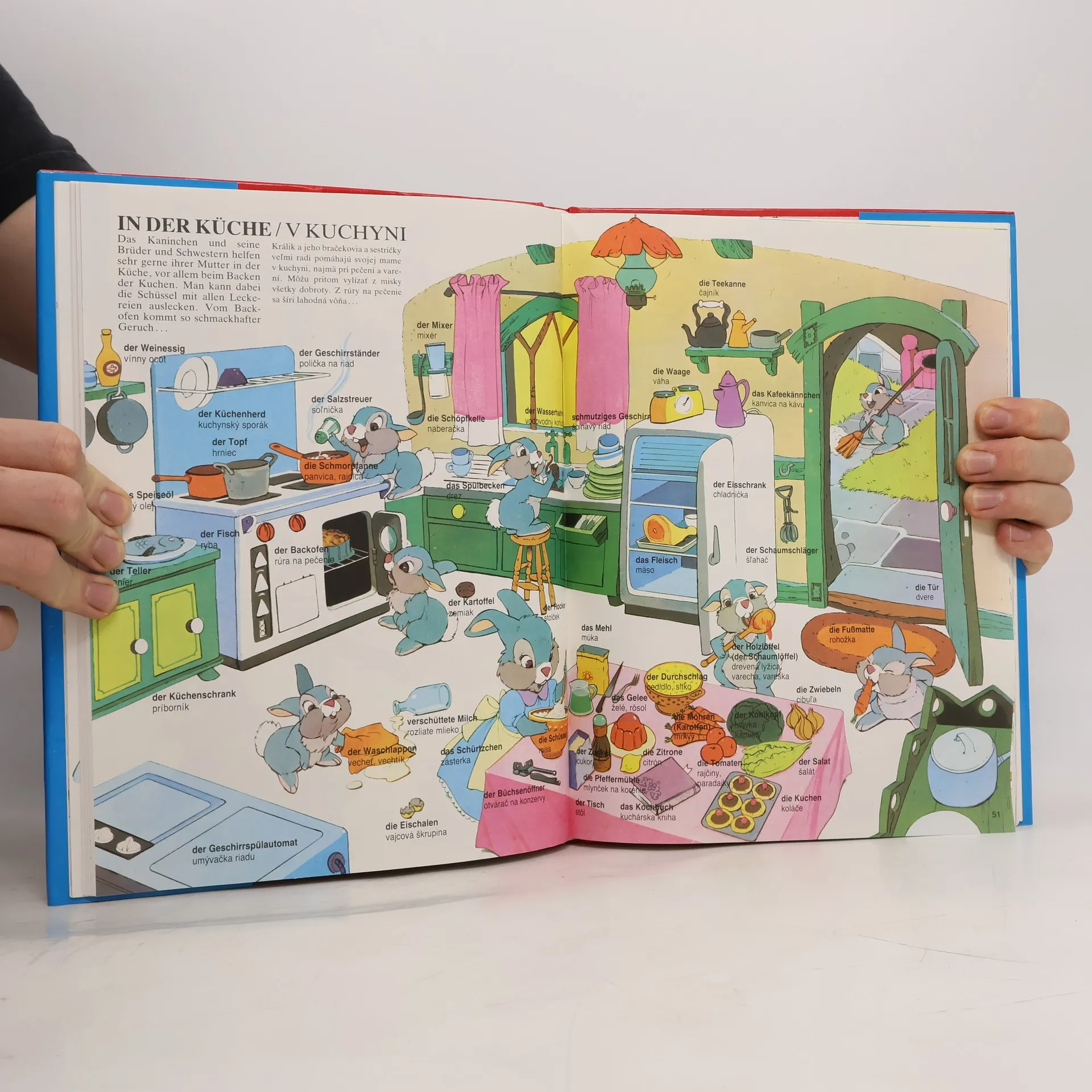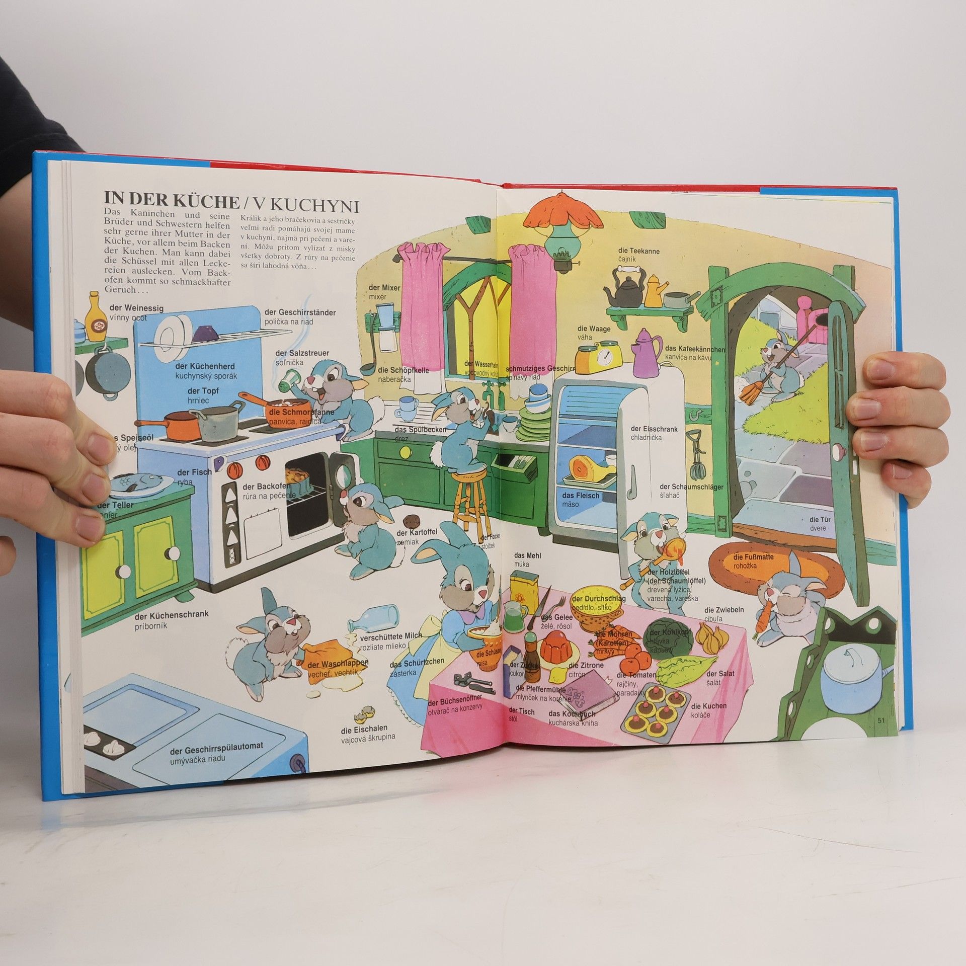 Nemecko-slovenský ilustrovaný slovník pre deti a mládež na témy: Zavčas rána, Na ulici, Na pošte, Forma a tvar, Farby, Zvuky, Meranie a váženie, Učíme sa počítať, Jar, leto, jeseň, zima, Mesiace v roku, Športové preteky, Hodina hudby, V ustavičnom pohybe, Veľkosti, Užitočné veci, Domáce práce, Veľké pranie, V záhrade, V autoservise, Keď budeme dospelí, Naša rodina, Mamy a deti, Naši najmladší, Časti tela, V kuchyni, Na trhu, Hračky pre deti, V obchodnom dome, Kupujeme oblečenie, Čo sa dá robiť, keď svieti slnko ?, Naše pocity, Čo si môžeme urobiť sami ?, Čo sa dá robiť, keď prší, Keď ochorieme, Na stanici, V lone prírody, Na dedine, Zvieracie príbytky, Na morskej pláži, V reštaurácii, Riečna plavba, Pod vodou, Čo lieta vo vzduchu ?, Na letisku, Na palube kozmickej lode, Čo behá na kolesách, Zaujímavosti zo sveta, V lunaparku, Čas na hranie, V zoologickej záhrade, V televíznom štúdiu, Požiarny zbor, V divadle, Budovy, Stavba domu, Nábytok, V cirkuse, Kúpanie, Pred spaním.