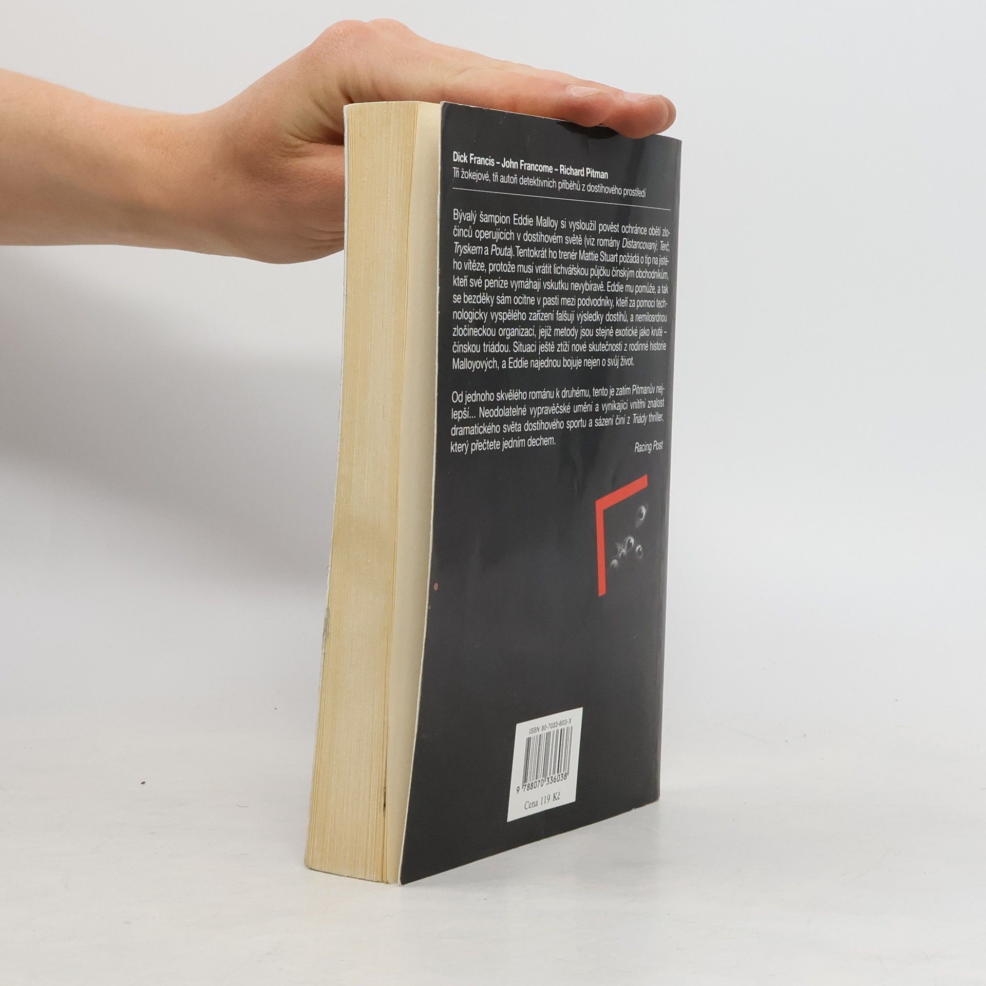 Bývalý šampion Eddie Malloy si vysloužil pověst ochránce obětí zločinců operujících v dostihovém světě (viz romány Distancovaný, Terč, Tryskem a Pouta). Tentokrát ho trenér Mattie Stuart požádá o tip na jistého vítěze, protože musí vrátit lichvářskou půjčku čínským obchodníkům, kteří své peníze vymáhají vskutku nevybíravě. Eddie mu pomůže, a tak se bezděky sám ocitne v pasti mezi podvodníky, kteří mu za pomoci technologicky vyspělého zařízení falšují výsledky dostihů a nemilosrdnou zločineckou organizací, jejíž metody jsou stejně exotické jako kruté - čínskou triádou.