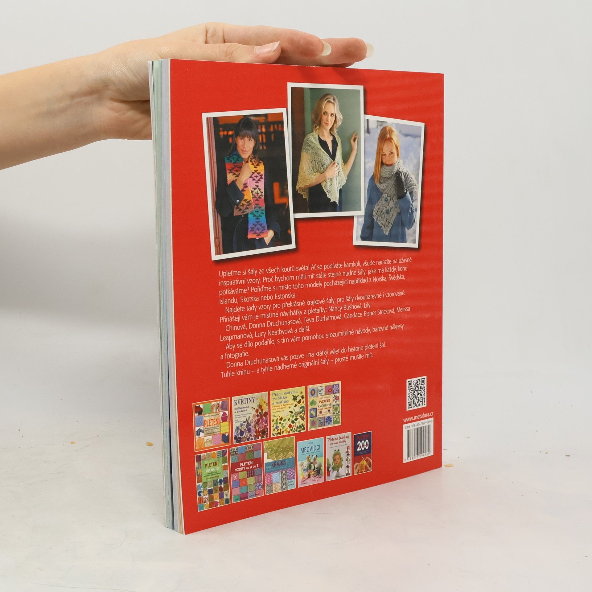 Různorové vzory, techniky, styly a provedené pletených šál Upleťme si šály ze všech koutů světa! Ať se podíváte kamkoli, všude narazíte na úžasné inspirativní vzory. Proč bychom měli mít stále stejné nudné šály, jaké má každý, koho potkáváme? Pořiďme si místo toho modely pocházející například z Norska, Švédska, Islandu, Skotska nebo Estonska. Najdete tady vzory pro překrásné krajkové šály, pro šály dvoubarevné i vzorované. Přinášejí vám je mistrné návrhářky a pletařky: Nancy Bushová, Lily Chinová, Donna Druchunasová, Teva Durhamová, Candace Eisner Stricková, Melissa Leapmanová, Lucy Neatbyová a další. Donna Druchunasová vás pozve i na krátký výlet do historie pletení šál. Aby se dílo podařilo, s tím vám pomohou srozumitelné návody, barevné nákresy a fotografie. Tuhle knihu – a tyhle nádherné originální šály – prostě musíte mít.