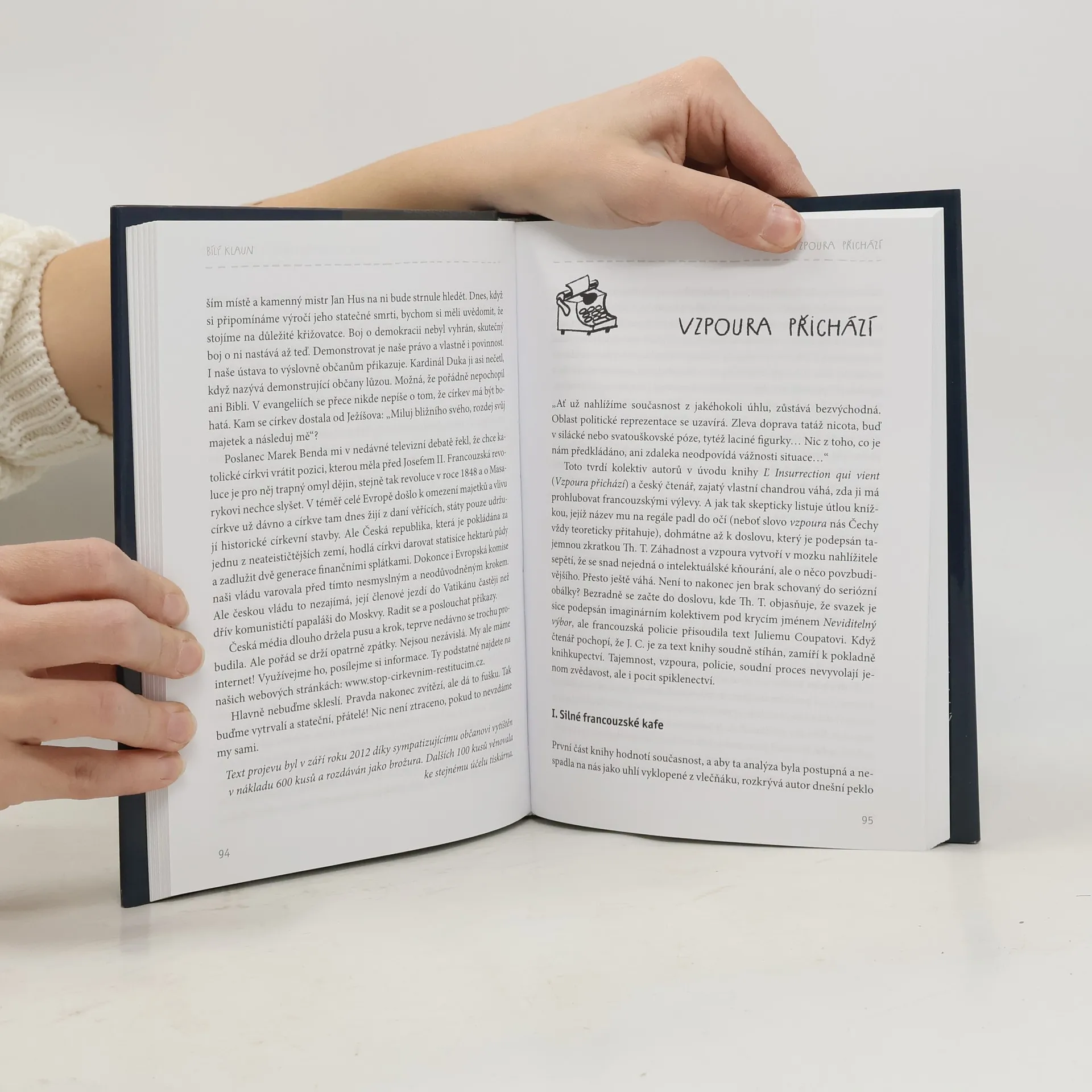 Bílý klaun je sbírka fejetonů a jiných krátkých textů, z nichž mnohé spisovatelka Lenka Procházková (dcera prozaika a scénáristy Jana Procházky) publikovala v novinách a časopisech. Některé texty však vycházejí v tištěné podobě poprvé. Od chvíle, kdy se autorčiným zásadním tématem staly takzvané církevní restituce, se totiž její kritické články objevují už jen na internetových serverech. Snadno zapamatovatelná tvář a hluboký hlas Lenky Procházkové zmizely i z veřejnoprávní televize. Také natáčení filmu o Janu Masarykovi, k němuž zpracovala scénář, bylo Českou televizí odloženo. Spisovatelka hodnotí situaci lapidárně: „Já jsem začínala v samizdatu, takže jsem si odpočátku zvykla psát svobodně, bez cizí nápovědy. A pokud je dnes upřímnost opět vnímána jako hřích, není to pro mě žádná nová zkušenost a ani nová křižovatka. Zkrátka v tom ‚hříchu‘ setrvám.” Texty obsažené ve sbírce Bílý klaun jsou důkazem toho, že jejich autorka převzala otcovo krédo, že politika má být pro každého a že: Nic není ztraceno, dokud to nevzdáme my sami… Kniha obsahuje mimo jiné i znění archivních dokumentů (trestní oznámení na členy vlády Petra Nečase i na kardinála Dominika Duku) včetně dopisů odeslaných papeži Benediktovi a papeži Františkovi.