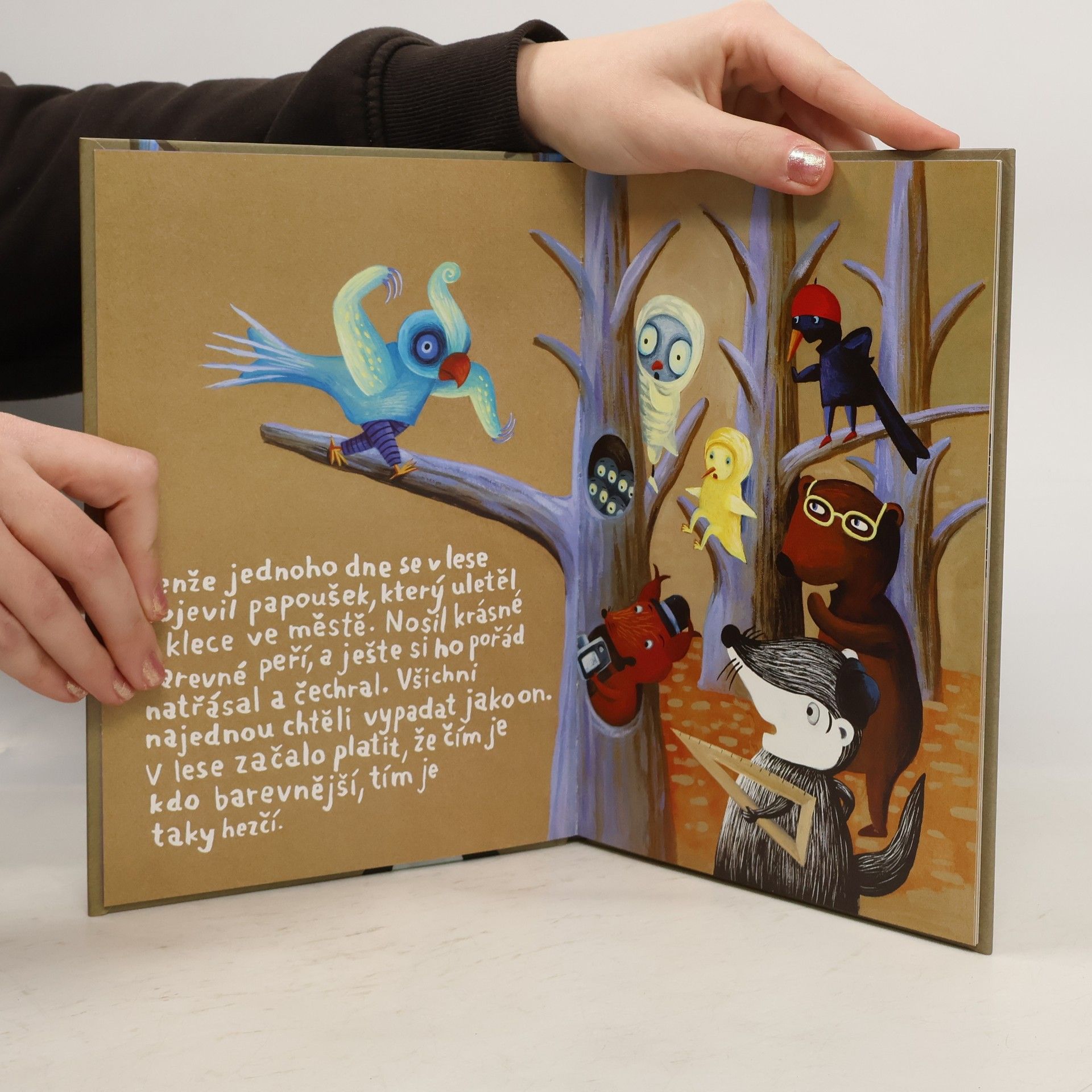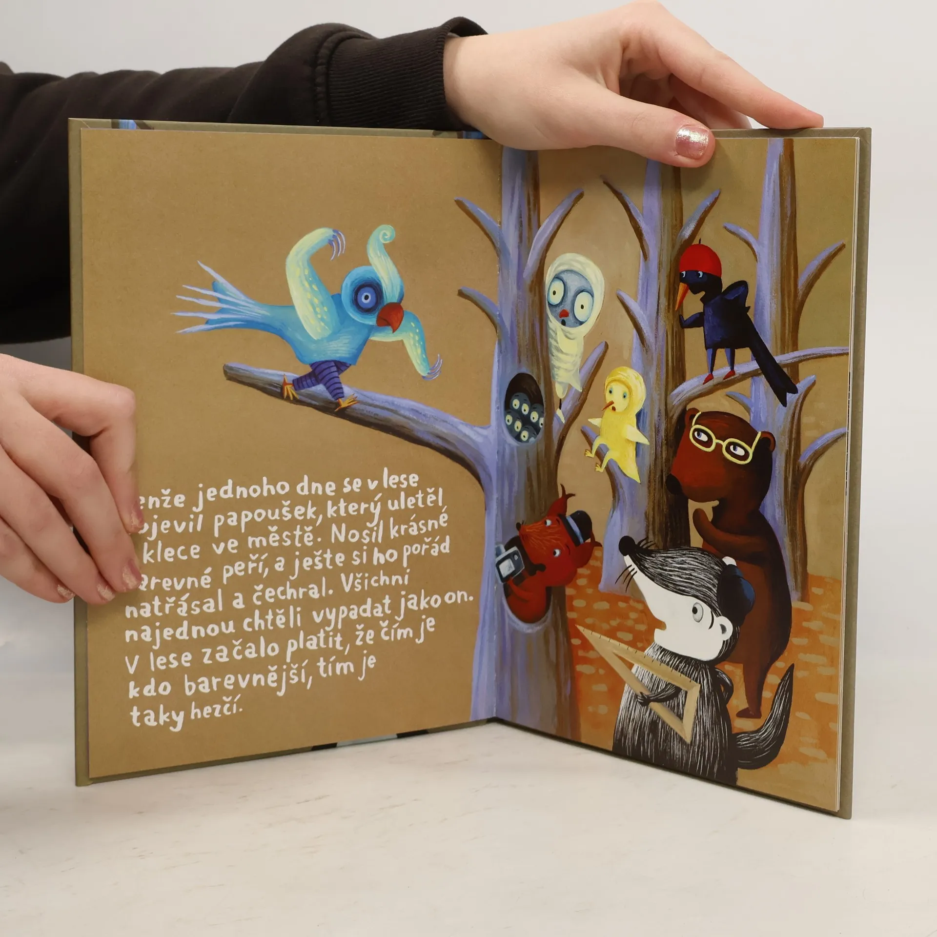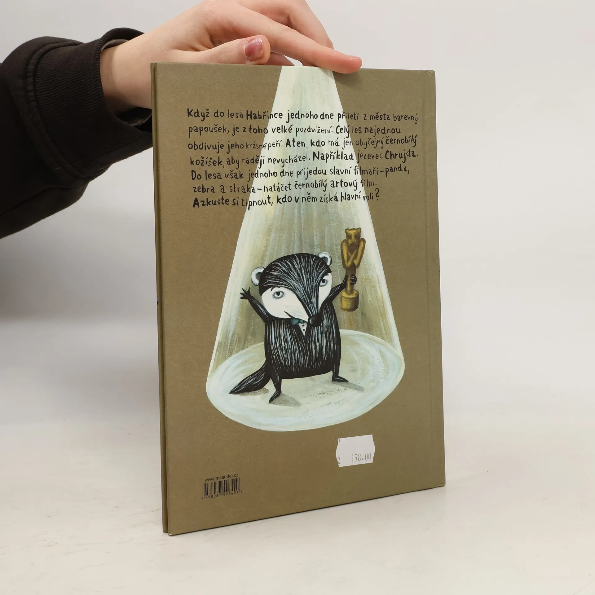 Když do lesa Habřince jednoho dne přiletí z města papoušek, je z toho velké pozdvižení. Všechna zvířátka najednou obdivují jeho krásně pestrobarevné peří, zatímco ten, kdo má jen černobílý kožíšek, upadá v přezíravé přehlížení. Například jezevec Chrujda. Pak ale do lesa přijedou tři černobílí filmaři – panda, zebra a straka – natáčet černobílý film. A kdo v něm získá hlavní roli? No přece náš jezevec... Příběh malé čtenáře hravou formou vede k poznání, že to podstatné u lidí, stejně jako u zvířátek, nemají hledat na povrchu, ale v nitru. A že móda se rychle mění, kdežto opravdové přátelství zůstává stále.