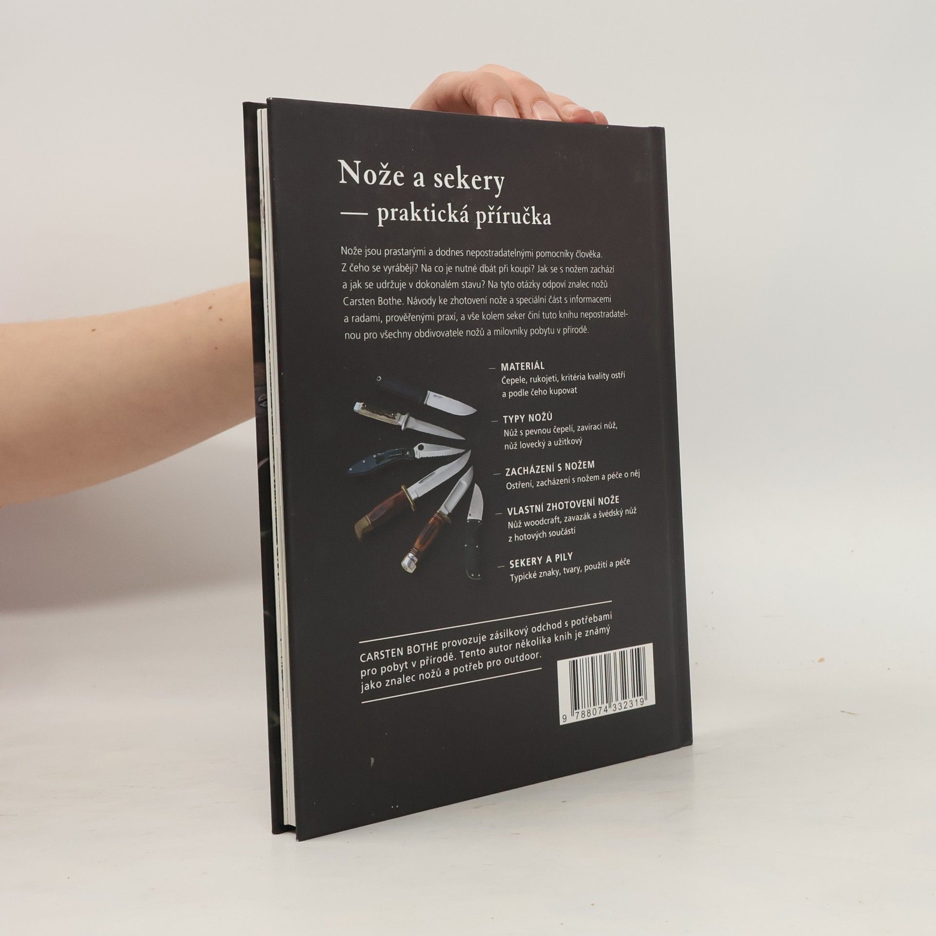 Nože a sekery - praktická příručka Nože jsou prastarými a dodnes nepostradatelnými pomocníky člověka. Z čeho se vyrábějí? Na co je nutné dbát při koupi? Jak se s nožem zachází a jak se udržuje v dokonalém stavu? Na tyto otázky odpoví znalec nožů Carsten Bothe. Návody ke zhotovení nože a speciální část s informacemi a radami, prověřenými praxí, a vše kolem seker činí tuto knihu nepostradatelnou pro všechny obdivovatele nožů a milovníky pobytu v přírodě. • MATERIÁL – Čepele, rukojeti, kritéria kvality ostří a podle čeho kupovat • TYPY NOŽŮ – Nůž s pevnou čepelí, zavírací nůž, nůž lovecký a užitkový • ZACHÁZENÍ S NOŽEM – Ostření, zacházení s nožem a péče o něj • VLASTNÍ ZHOTOVENÍ NŮŽE – Můž woodcraft, zavazák a švédský nůž z hotových součástí • SEKERY A PILY – Typické znaky, tvary, použití a péče CARSTEN BOTHE provozuje zásilkový odchod s potřebami pro pobyt v přírodě. Tento autor několika knih je známý jako znalec nožů a potřeb pro outdoor.