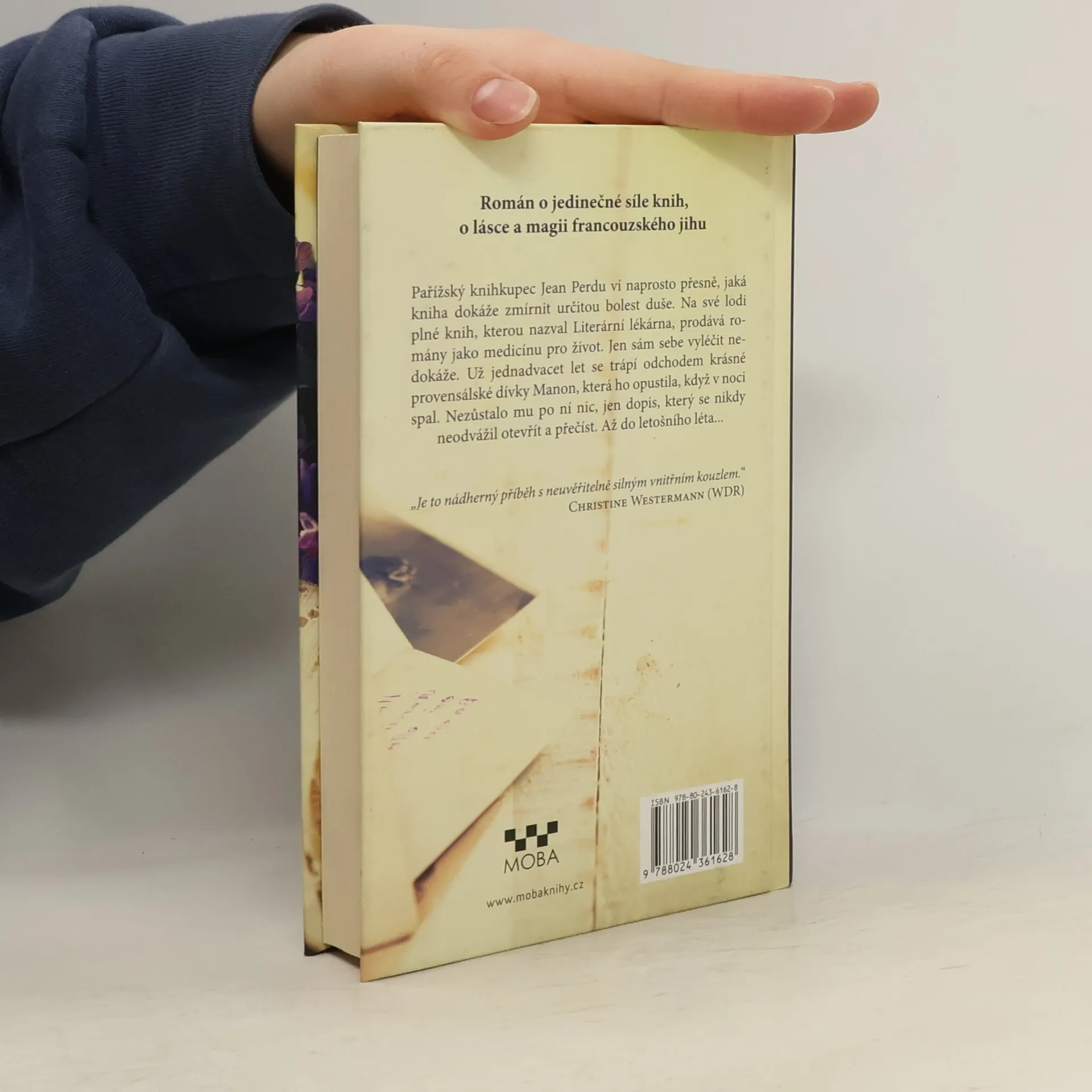 Pařížský knihkupec Jean Perdu ví naprosto přesně, jaká kniha dokáže zmírnit určitou bolest duše. Na své lodi plné knih, kterou nazval Literární lékárna, prodává romány jako medicínu pro život. Jen sám sebe nedokáže vyléčit. Už jednadvacet let se trápí odchodem krásné provensálské dívky Manon, která ho opustila, když v noci spal. Nezůstalo mu po ní nic, jen dopis, který se nikdy neodvážil otevřít a přečíst. Až do letošního léta…