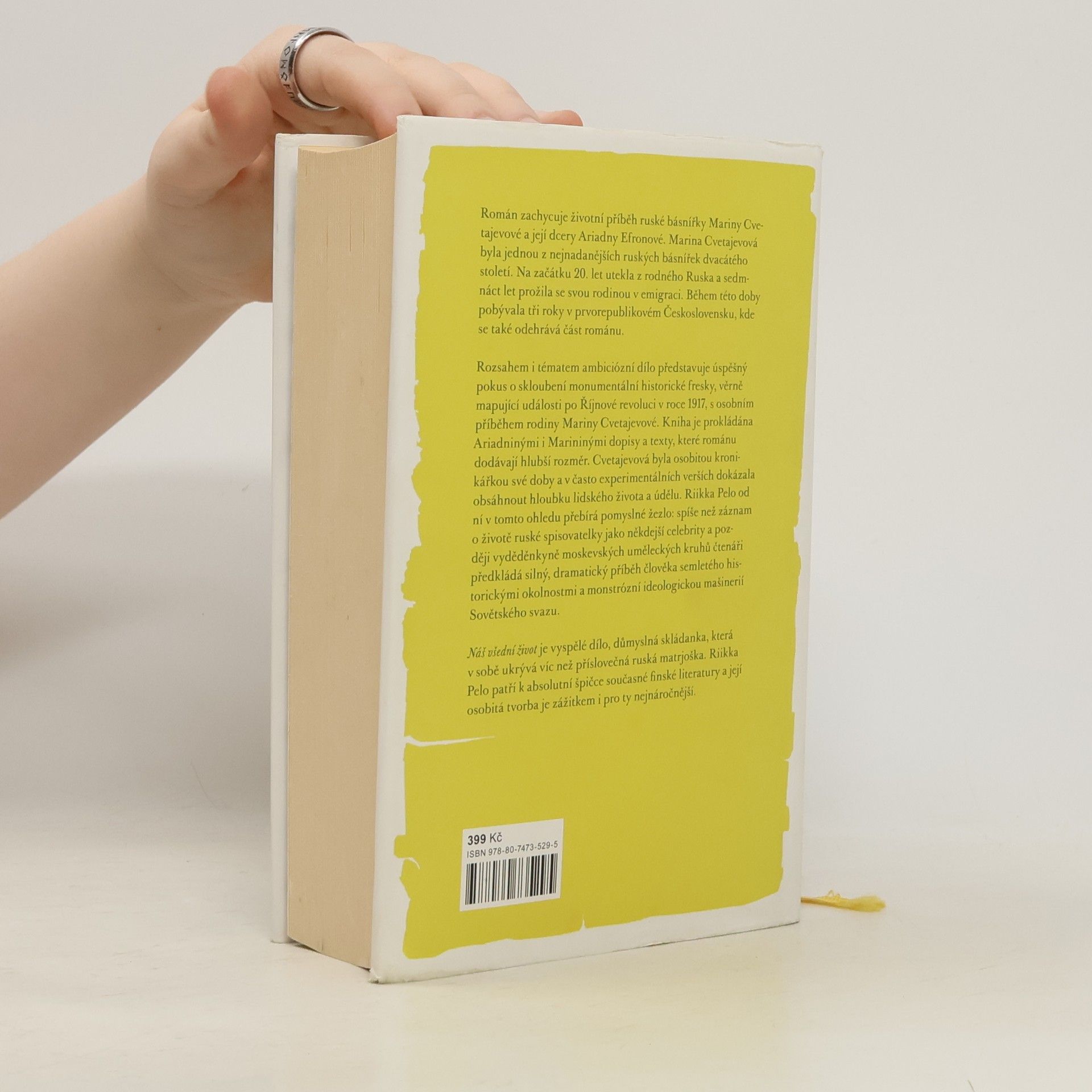 Životní drama ruské básnířky Mariny Cvetajevové na pozadí ideologické mašinérie Sovětského svazu. Román zachycuje životní příběh ruské básnířky Mariny Cvetajevové a její dcery Ariadny Efronové. Rozsahem i tématem ambiciózní dílo, za které autorka v roce 2013 obdržela prestižní literární cenu Finlandia, představuje úspěšný pokus o skloubení monumentální historické fresky, věrně mapující události po říjnové revoluci v roce 1917, s osobním příběhem jedné z největších osobností ruské literatury 20. století. Kniha je prokládána Adriadninými a Marininými dopisy a texty, které románu dodávají hlubší rozměr. Cvetajevová byla osobitou kronikářkou své doby a v často experimentálních verších dokázala obsáhnout hloubku lidského života a údělu. Riikka Pelo od ní v tomto ohledu přebírá pomyslné žezlo: spíše než záznam o životě ruské spisovatelky jako někdejší celebrity a později vyděděnkyně moskevských uměleckých kruhů čtenáři předkládá silný, dramatický příběh člověka semletého historickými okolnostmi a monstrózní ideologickou mašinerií Sovětského svazu. Naše všední životy je vyspělé dílo, důmyslná skládanka, která v sobě ukrývá víc než příslovečná ruská matrjoška. Riikka Pelo patří k absolutní špičce současné finské literatury a její osobitá tvorba je zážitkem i pro ty nejnáročnější.