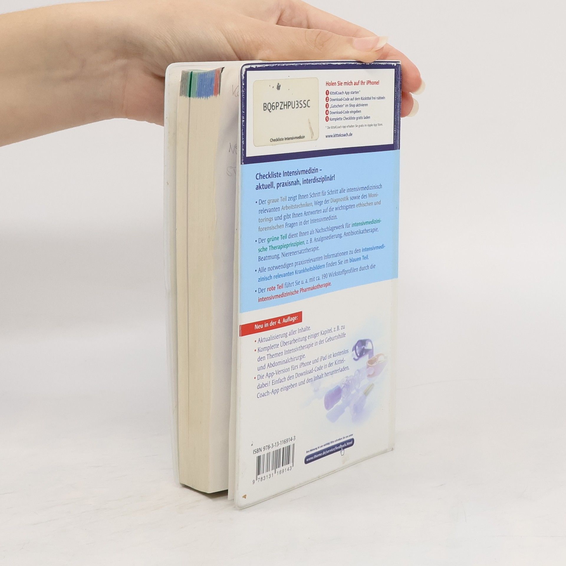 Diese Checkliste besteht aus Buch und App mit allen Inhalten. Beide zusammen gibt es zum einmaligen Preis. Der Download-Code für die App liegt bei. Der KittelCoach ist Basis für die Nutzung dieses Angebots. So funktioniert's: 1. Lade Dir die KittelCoach App im AppStore gratis auf Dein iPhone oder iPad 2. Melde Dich in der App an 3. Wähle die Checkliste aus und lade sie herunter 4. Los gehts! Komplett und übersichtlich Sicherheit bei der Versorgung lebensbedrohlich erkrankter Patienten Alles zu Monitoring, Scoringsystemen, Arbeitstechniken Spezielle Aspekte der Intensivmedizin nach operativen Eingriffen und Transplantationen Step by step Anleitungen und konkrete Therapieempfehlungen Neu - Vollständig überarbeitet und aktualisiert (Medikamente, Therapieschemata, Diagnostikrichtlinien) - Praxisnähere Darstellung der Inhalte, einige Kapitel neu geschrieben - Neue Hinweise zu themenrelevanten Webadressen (inkl. Bewertung) Inhalt Grauer Teil: Grundlagen # körperliche Untersuchung, Monitoring, Diagnostik, ethische und forensische Aspekte Grüner Teil: Therapieprinzipien Blauer Teil: Intensivmedizinisch relevante Erkrankungen # Einteilung nach Leitsyndrom Roter Teil: Medikamente # intensivmedizinisch relevante Wirkstoffe von A-Z Anhang: Formeln und Normwerte