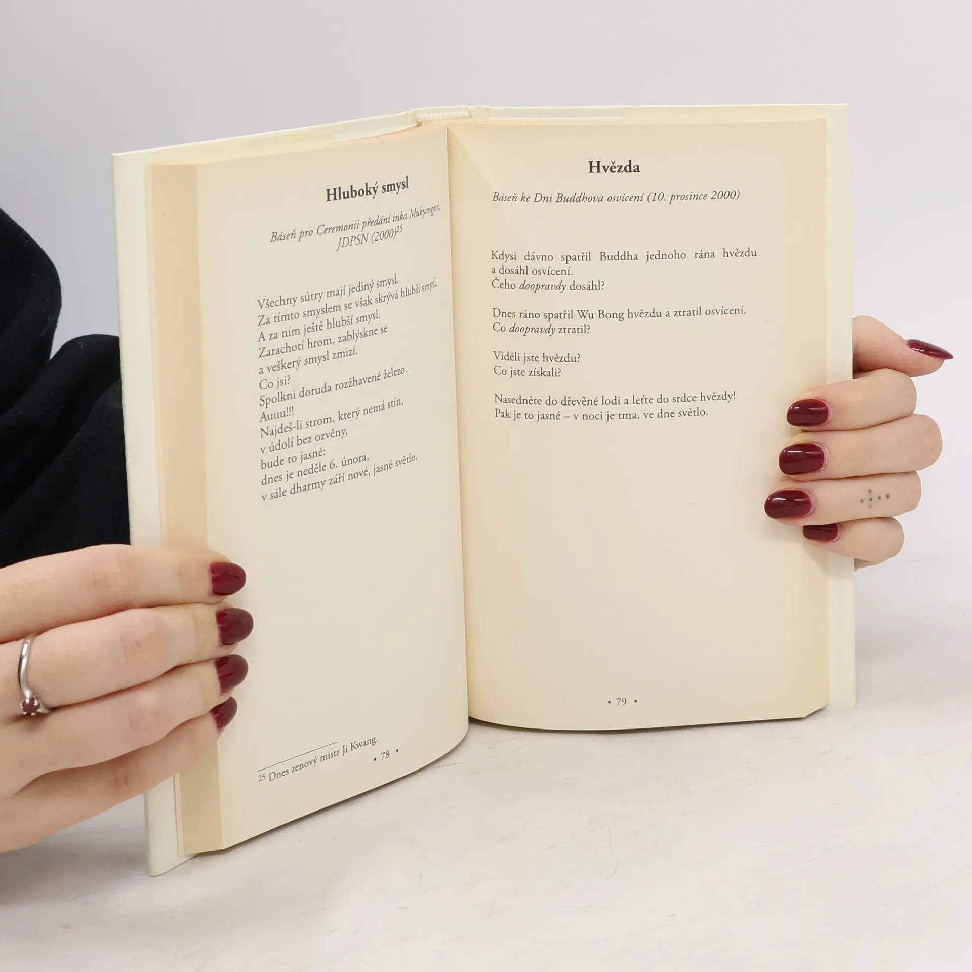 Učení zenového mistra Wu Bonga s poděkováním od studentů. V první z pěti částí této knížky najdete upřímné osobní příběhy a milé anekdoty od učitelů a studentů školy Kwan Um – jak se poprvé setkali se zenovým mistrem Wu Bongem a co s ním zažili. Druhá část přináší vynikající formální řeči dharmy, pronesené při různých příležitostech, ale i běžné proslovy, které zazněly například během meditačních ústraní. Ve třetí části najdete břitké, jasné, humorné a moudré odpovědi zenového mistra Wu Bonga na otázky studentů, čtvrtá část je rozhovor, v němž se dozvíte mnoho zajímavého o mistrově pozoruhodném životě. Skutečnou perlou je pak poslední oddíl nazvaný „Střípky moudrosti“, obsahující řeči dharmy, které vás zasáhnou v srdci.