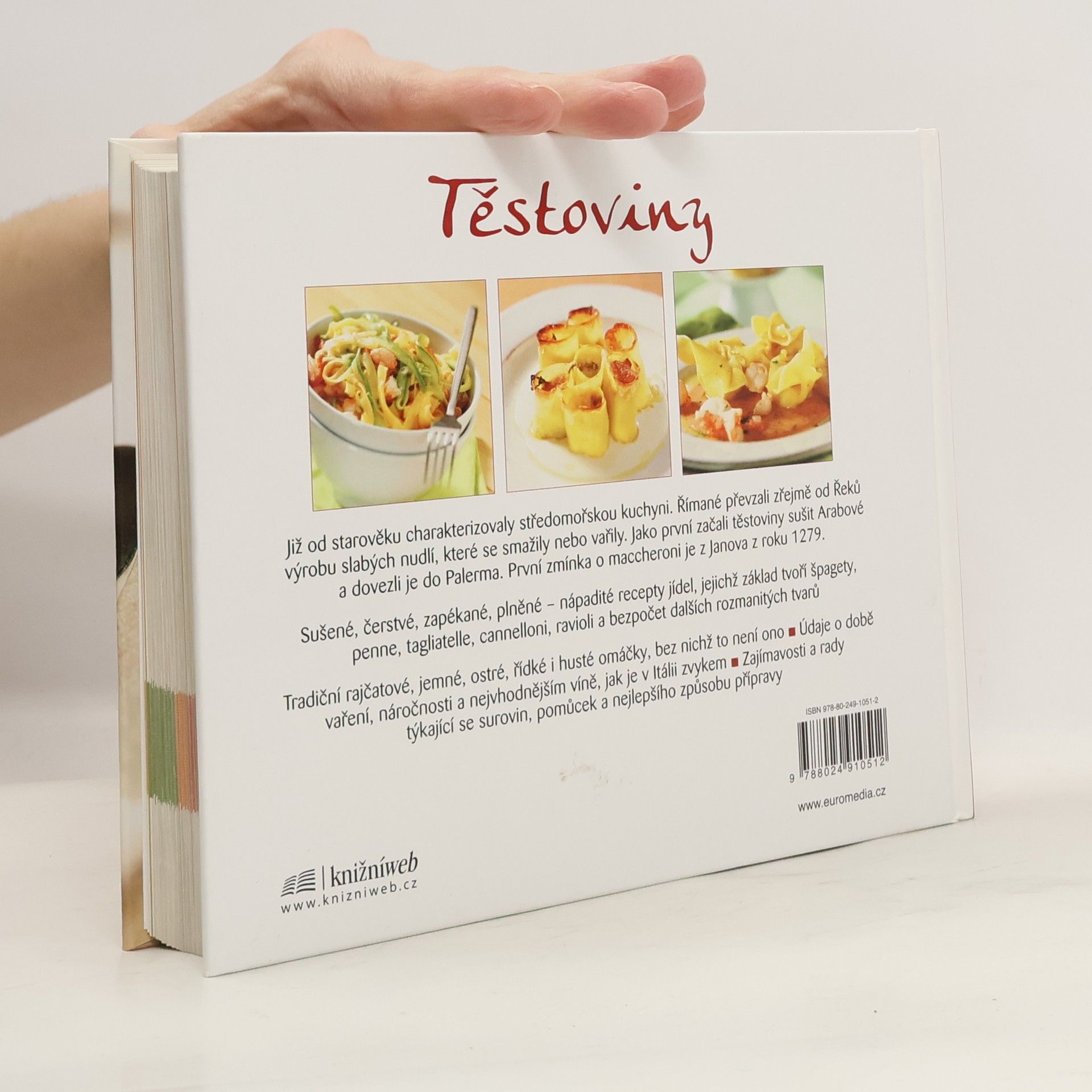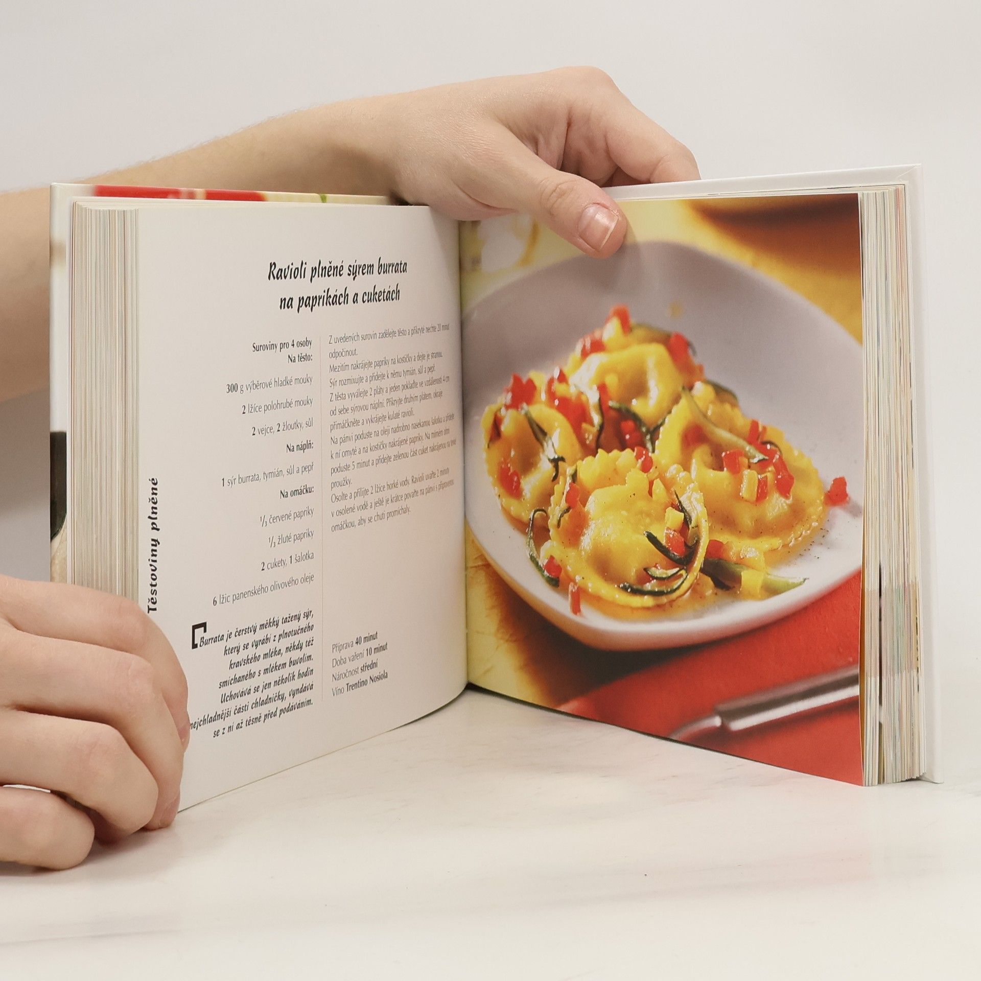 Základ nápaditých receptů jídel tvoří špagety, penne, tagliatelle, cannelloni, ravioli a bezpočet dalších rozmanitých tvarů. Tradiční rajčatové, jemné, ostré, řídké i husté omáčky a pesto, bez nichž to není ono, zpestří chuť i vůni podávaných pokrmů. Údaje o době vaření, náročnosti a nejvhodnějším víně, jak je v Itálii zvykem, pomohou při výběru i přípravě. Lákavé fotografie Vás přesvědčí, že bez těstovin to v současné kuchyni nejde.