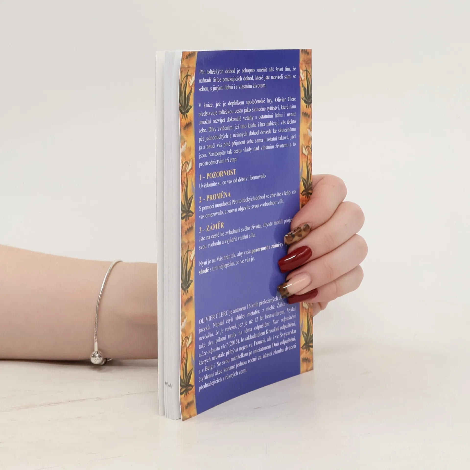 Pět toltéckých dohod je schopno změnit náš život tím, že nahradí tisíce omezujících dohod, které jste uzavřeli se sebou samými, s jinými lidmi i se životem. V knize provázející tuto hru Olivier Clerc představuje toltéckou cestu jako skutečné vztahové rytířství, jež nám umožní rozvíjet dokonalé vztahy s jinými i se sebou samými. Díky cvičením, jež tato kniha a hra zároveň nabízí, vás těchto pět jednoduchých a účinných dohod dovede k tomu, čím skutečně jste, a naučí vás plně přijmout sebe sama i ostatní. Nastoupíte tak cestu vlády nad sebou samými, a to prostřednictvím tří níže uvedených etap: 1 – POZORNOST Uvědomíte si, co vás od dětství formovalo. 2 – PROMĚNA S pomocí moudrosti Pěti toltéckých dohod se zbavíte všeho, co vás omezovalo, a znovu objevíte svou svobodnou vůli. 3 – ZÁMĚR Jste na cestě ke zvládnutí svého života, abyste mohli projevit svou svobodu a vyjádřit svou vnitřní sílu. Je nyní na Vás hrát tak, aby vaše pozornost a váš záměr byly ve shodě s tím nejlepším ve vás.