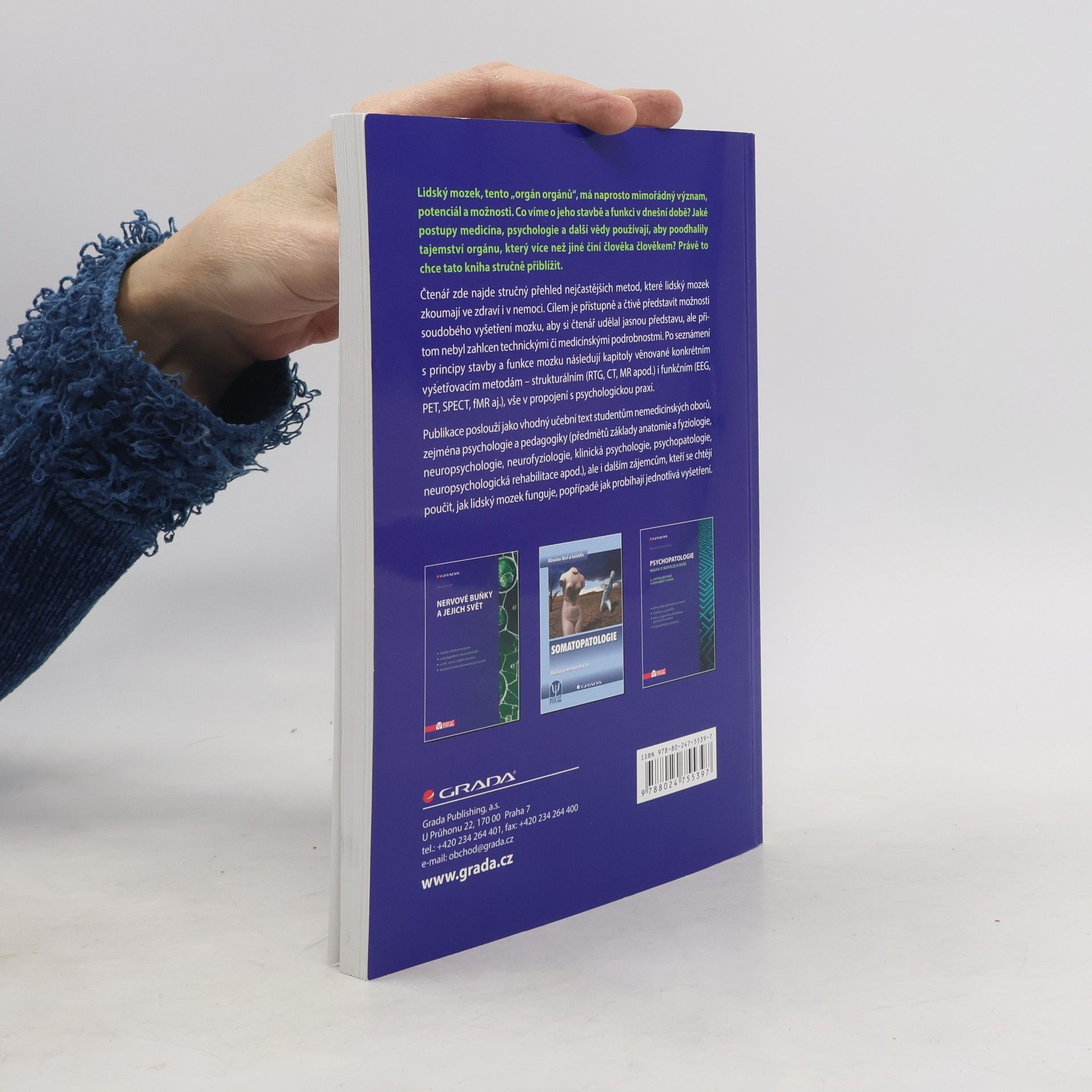 Čtenář v této publikaci najde stručný přehled nejčastějších metod, které lidský mozek zkoumají ve zdraví i v nemoci. Cílem je přístupně a čtivě představit možnosti soudobého vyšetření mozku, aby si čtenář udělal jasnou představu, ale přitom nebyl zahlcen technickými či medicínskými podrobnostmi. Po seznámení s principy stavby a funkce mozku následují kapitoly věnované konkrétním vyšetřovacím metodám – strukturálním (RTG, CT, MR apod.) i funkčním (EEG, PET, SPECT, fMR aj.), vše v propojení s psychologickou praxí. Publikace poslouží jako vhodný učební text studentům nemedicínských oborů, zejména psychologie a pedagogiky (předmětů základy anatomie a fyziologie, neuropsychologie, neurofyziologie, klinická psychologie, psychopatologie, neuropsychologická rehabilitace apod.), ale i dalším zájemcům, kteří se chtějí poučit, jak lidský mozek funguje, popřípadě jak probíhají jednotlivá vyšetření.