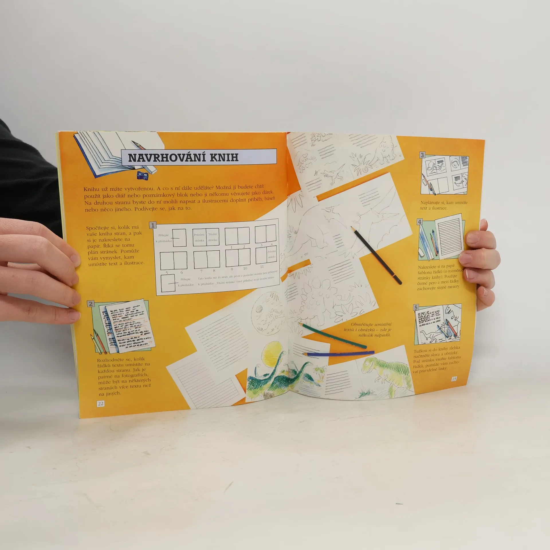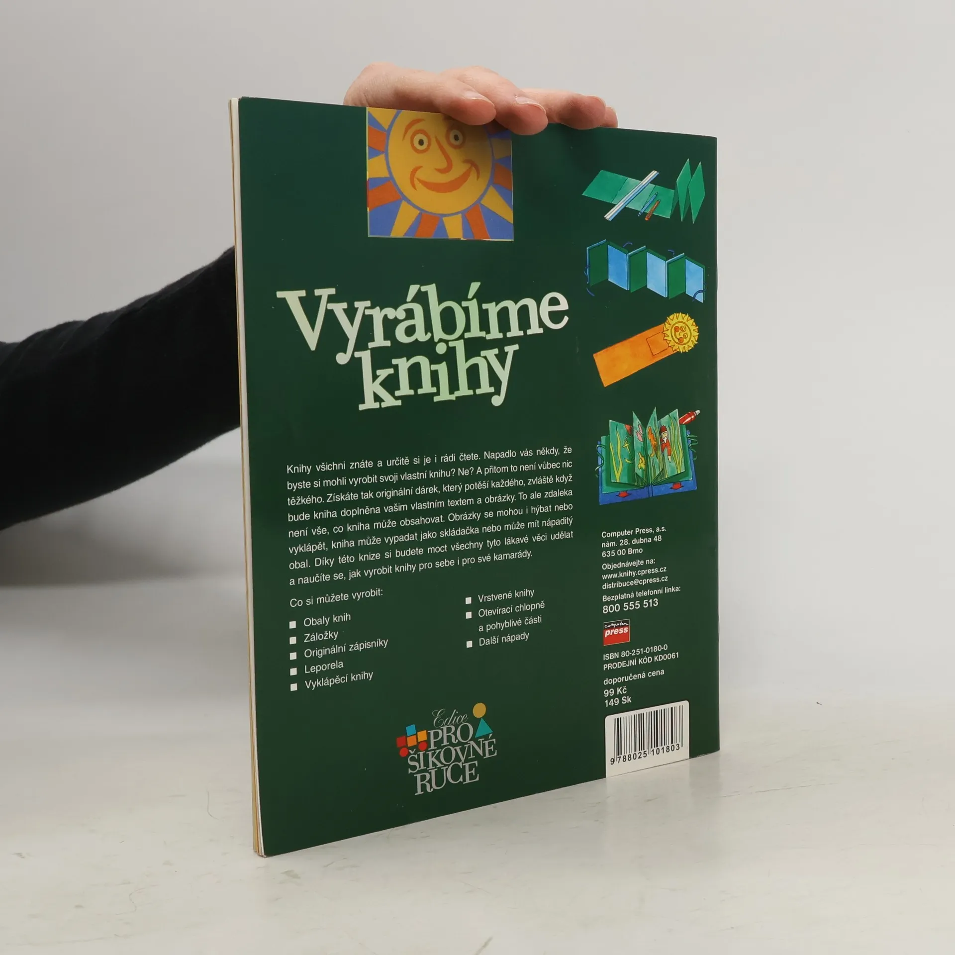 Brožurka z edice "Pro šikovné ruce", která nabízí řadu nápadů, jak si vyrobit svoji vlastní knihu. Podle návodů v brožurce si můžeme vyrobit např. leporelo, vyklápěcí knihu nebo knihu vrstvenou. Kromě toho zde najdeme tipy na to, jak udělat záložku, originální zápisník či obal na knihu. Tvorba knihy nevyžaduje příliš náročné pomůcky a materiály. Brožurka je určena šikovným dětem, které si poradí i bez šablon a budou schopny pochopit pracovní postup z poměrně strohého textu, který doprovází názorné ilustrace.