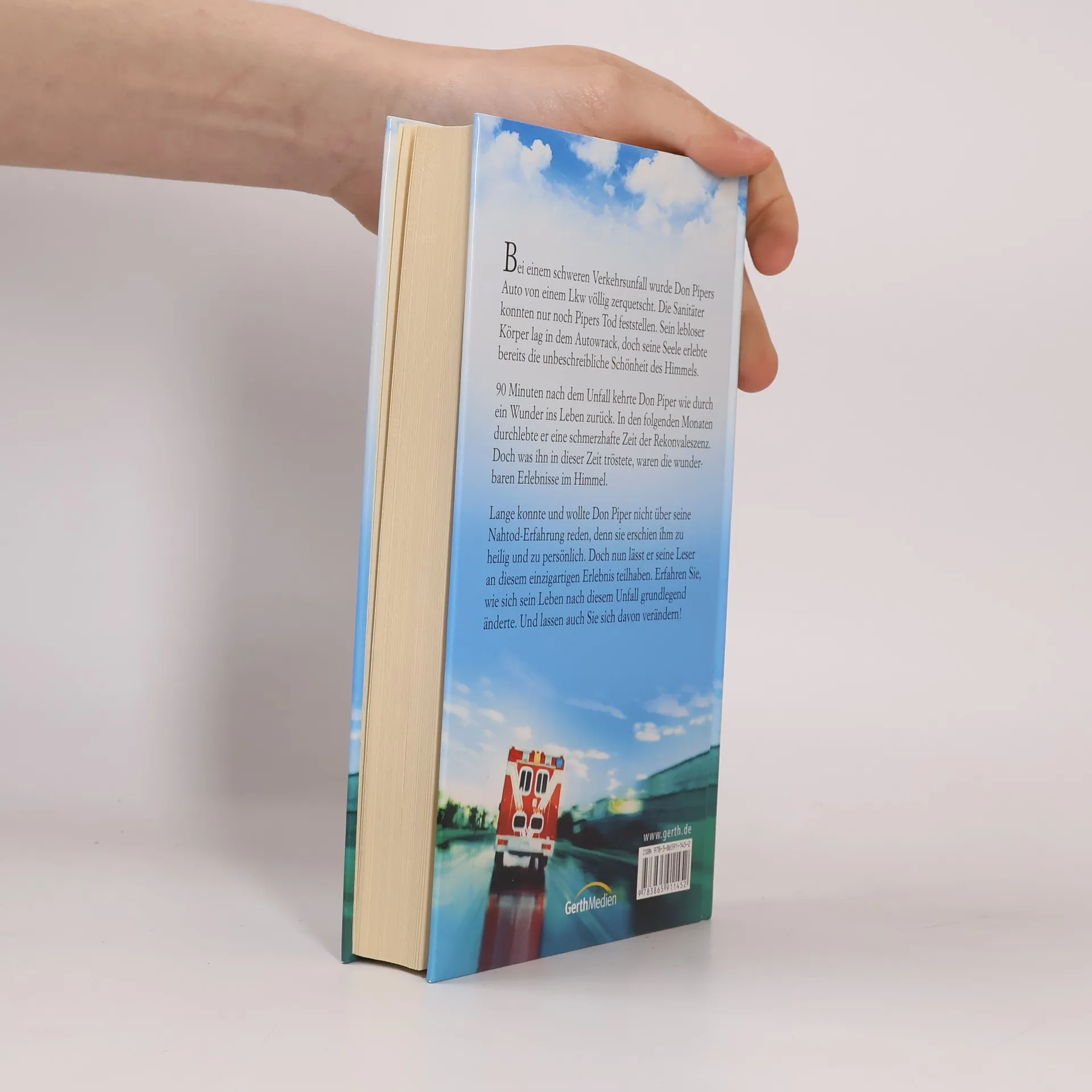 Bei einem schweren Verkehrsunfall wurde Don Pipers Auto von einem Lkw völlig zerquetscht. Die Sanitäter konnten nur noch Pipers Tod feststellen. Sein lebloser Körper lag in dem Autowrack, doch seine Seele erlebte bereits die unbeschreibliche Schönheit des Himmels. 90 Minuten nach dem Unfall kehrte Don Piper wie durch ein Wunder ins Leben zurück. In den folgenden Monaten durchlebte er eine schmerzhafte Zeit der Rekonvaleszenz. Doch was ihn in dieser Zeit tröstete, waren die wunderbaren Erlebnisse im Himmel. Lange konnte und wollte Don Piper nicht über seine Nahtod-Erfahrungen reden, denn sie erschienen ihm zu heilig und zu persönlich. Doch nun lässt er seine Leser an diesem einzigartigen Erlebnis teilhaben. Erfahren Sie, wie sich sein Leben nach diesem Unfall grundlegend änderte. Und lassen auch Sie sich davon verändern!