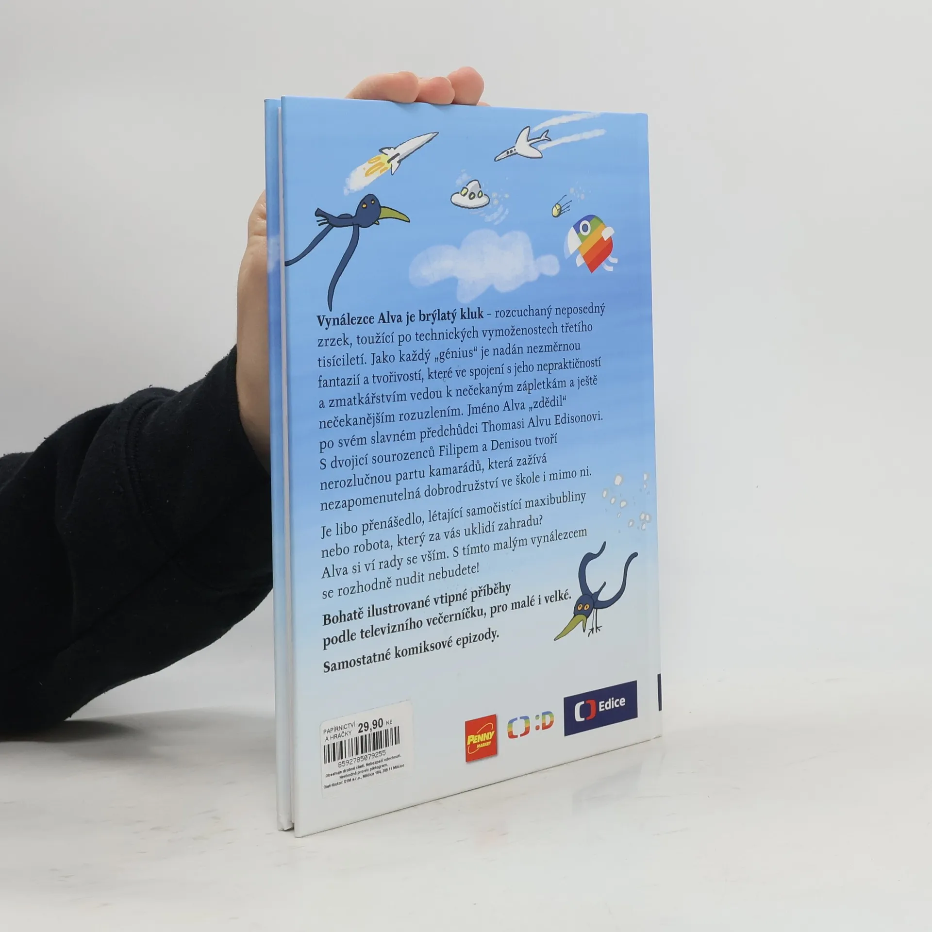 Je libo raketobrusle, přenášedlo, létající samočistící maxibubliny nebo robota, který za vás uklidí zahradu? Alva si ví rady se vším. S tímto vynálezcem se rozhodně nudit nebudete! Vynálezce Alva je brýlatý kluk – rozcuchaný neposedný zrzek, toužící po technických vymoženostech třetího tisíciletí. Jméno Alva „zdědil“ po svém slavném předchůdci T. A. Edisonovi. Jako každý génius je nadán nezměrnou fantazií a tvořivostí, které ve spojení s jeho nepraktičností a zmatkářstvím vedou k nečekaným zápletkám a ještě nečekanějším rozuzlením. S dvojicí sourozenců Filipem a Denisou tvoří nerozlučnou partu kamarádů, která zažívá neuvěřitelná dobrodružství ve škole i mimo ni. Náš příběh začíná první školní den… Bohatě ilustrované vtipné příběhy podle televizního večerníčku, pro malé i velké. 2.,upravené vydání.