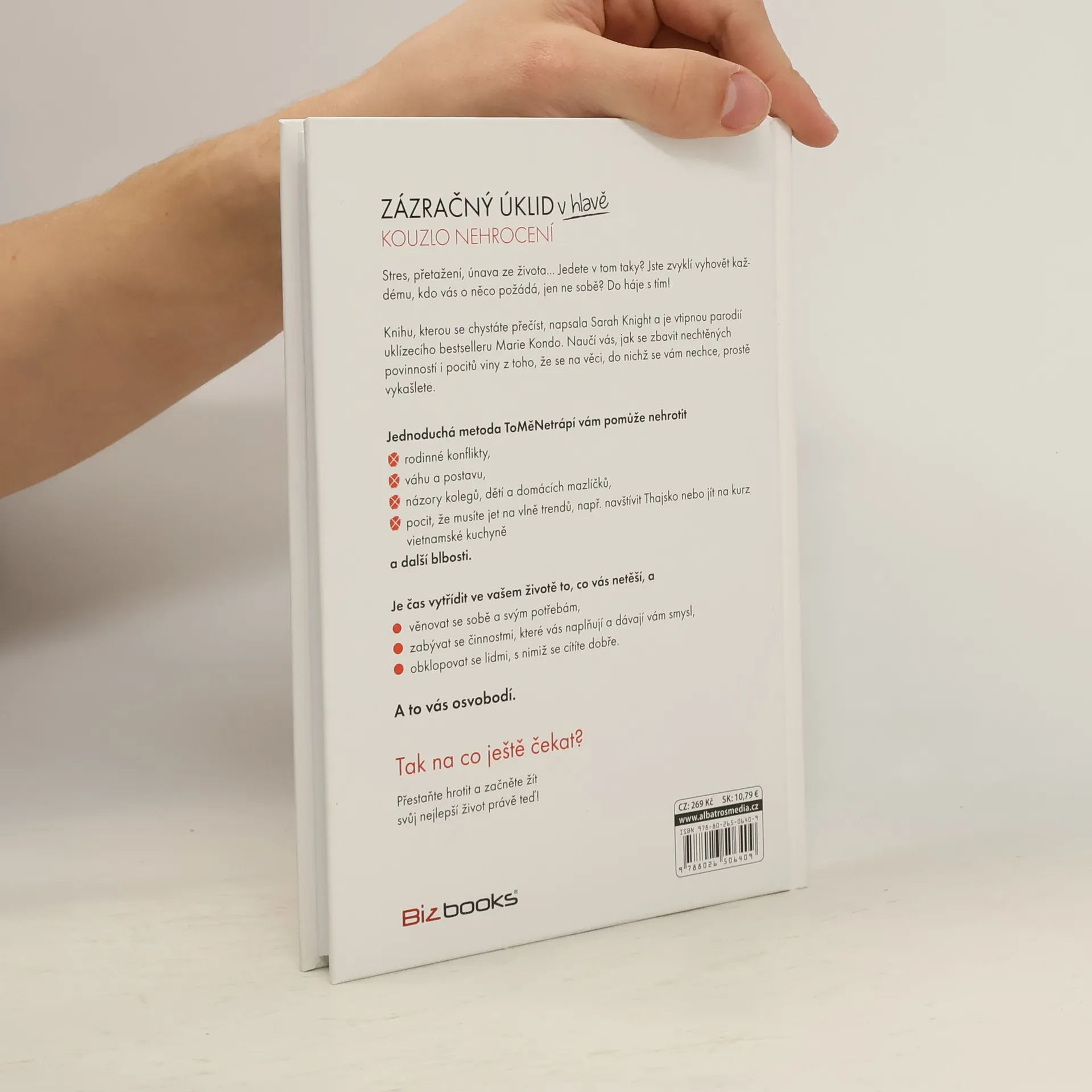 Stres, přetažení, únava ze života… Jedete v tom taky? Jste zvyklí vyhovět každému, kdo vás o něco požádá, jen ne sobě? Jste zvyklí vyhovět každému, kdo vás o něco požádá, jen ne sobě? Do háje s tím! Knihu, kterou se chystáte přečíst, napsala Sarah Knight a je vtipnou parodií uklízecího bestselleru Marie Kondo. Naučí vás, jak se zbavit nechtěných povinností i pocitů viny z toho, že se na věci, do nichž se vám nechce, prostě vykašlete. Jednoduchá metoda ToMěNetrápí vám pomůže nehrotit: rodinné konflikty; váhu a postavu; názory kolegů, dětí a domácích mazlíčků; dovolené do zemí, které jsou právě v kurzu, ale kam třeba ani nechcete, a další blbosti. Je čas vytřídit v životě, co vás netěší a věnovat se sobě a svým potřebám; zabývat se činnostmi, které vás naplňují a dávají vám smysl; obklopovat se lidmi, s nimiž se cítíte dobře. A to vás osvobodí. Tak na co ještě čekat?