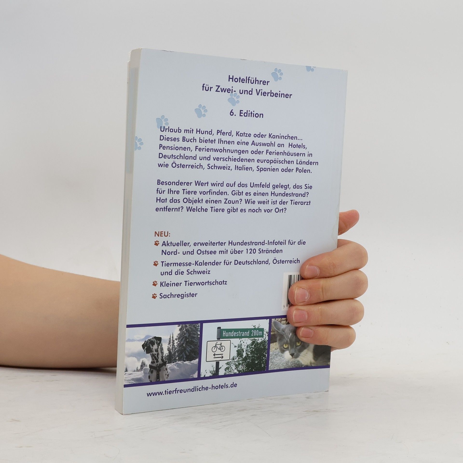 In diesem Hotelführer erwartet Sie nicht das karge Hundesymbol! Auf das Umfeld für einen tierfreundlichen Urlaub mit Hund, Katze, Kaninchen oder Pferd. wird hier besonderen Wert gelegt. Die Entfernung zum Hundestrand, dem nächsten Tierarzt, andere Tiere vor Ort, Wald und Wiese in der Nähe? Hier finden Sie die Antwort. Es bietet Ihnen eine Auswahl an Hotels, Ferienwohnungen, Ferienhäusern in Deutschland u. a. europäischen Ländern (A, CH, I, F, E, PL, CZ, H), nach Postleitzahlen geordnet, mit Tipps zu Freizeitangeboten, einem Verzeichnis von über 120 Hundestränden an Nord- und Ostsee, einem Tiermessekalender und vielen Tierfotos.