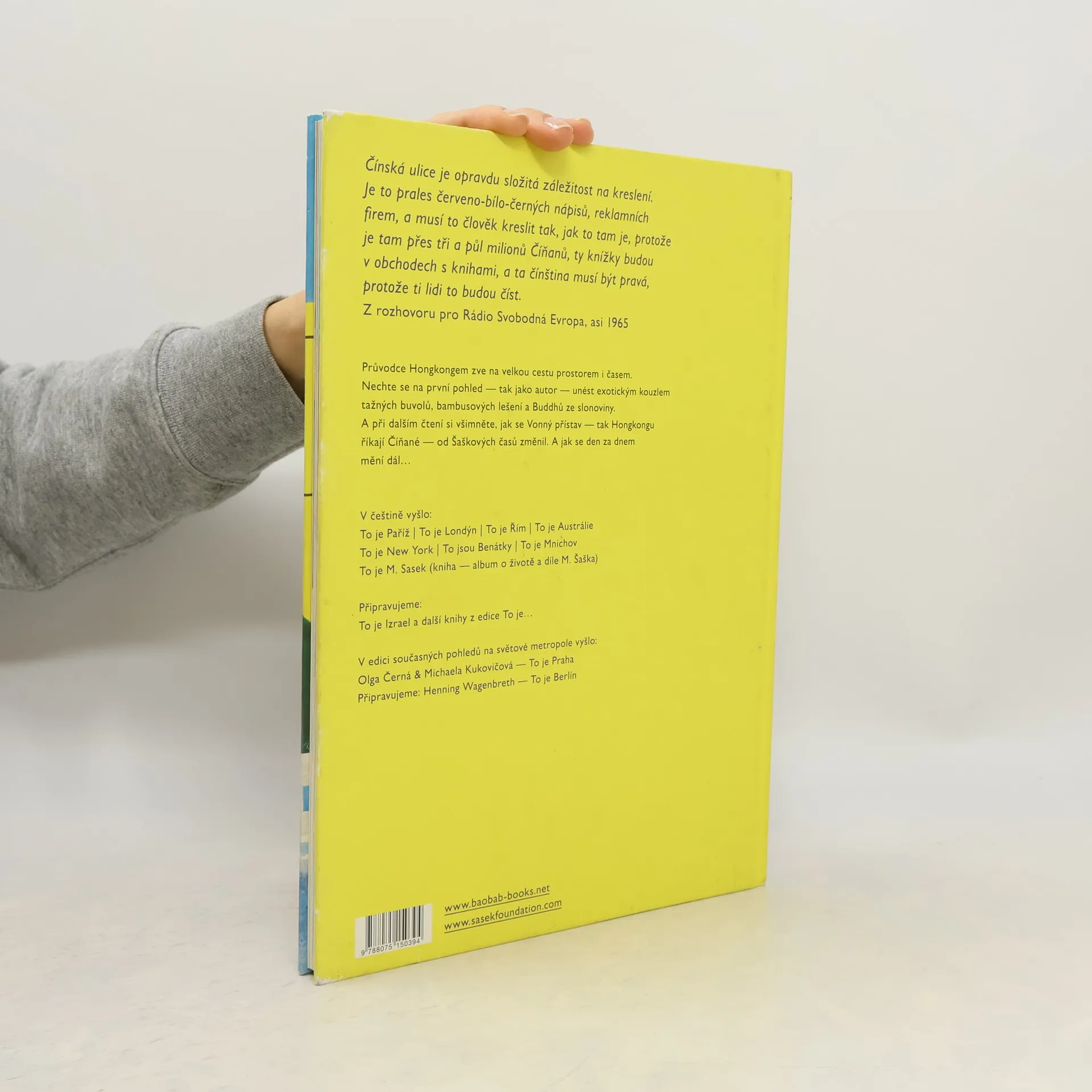 Hongkong – nejbarevnější a nejexotičtější z Šaškových měst. Město mrakodrapů a ulic s pralesem reklamních nápisů i rýžová políčka vysoko horách, bárky na moři, čínský Nový rok s vybuchujícími petardami i Dušičky s piknikem na hřbitově, obchůdky i hospůdky, pouliční prodavači úplně všeho, na co si vzpomenete, holčička s větrníky, zlatí Buddhové a pestrobarevní draci. Další z obrazových průvodců Miroslava Šaška zavádí čtenáře na Dálný východ a zve na velkou cestu prostorem i časem.