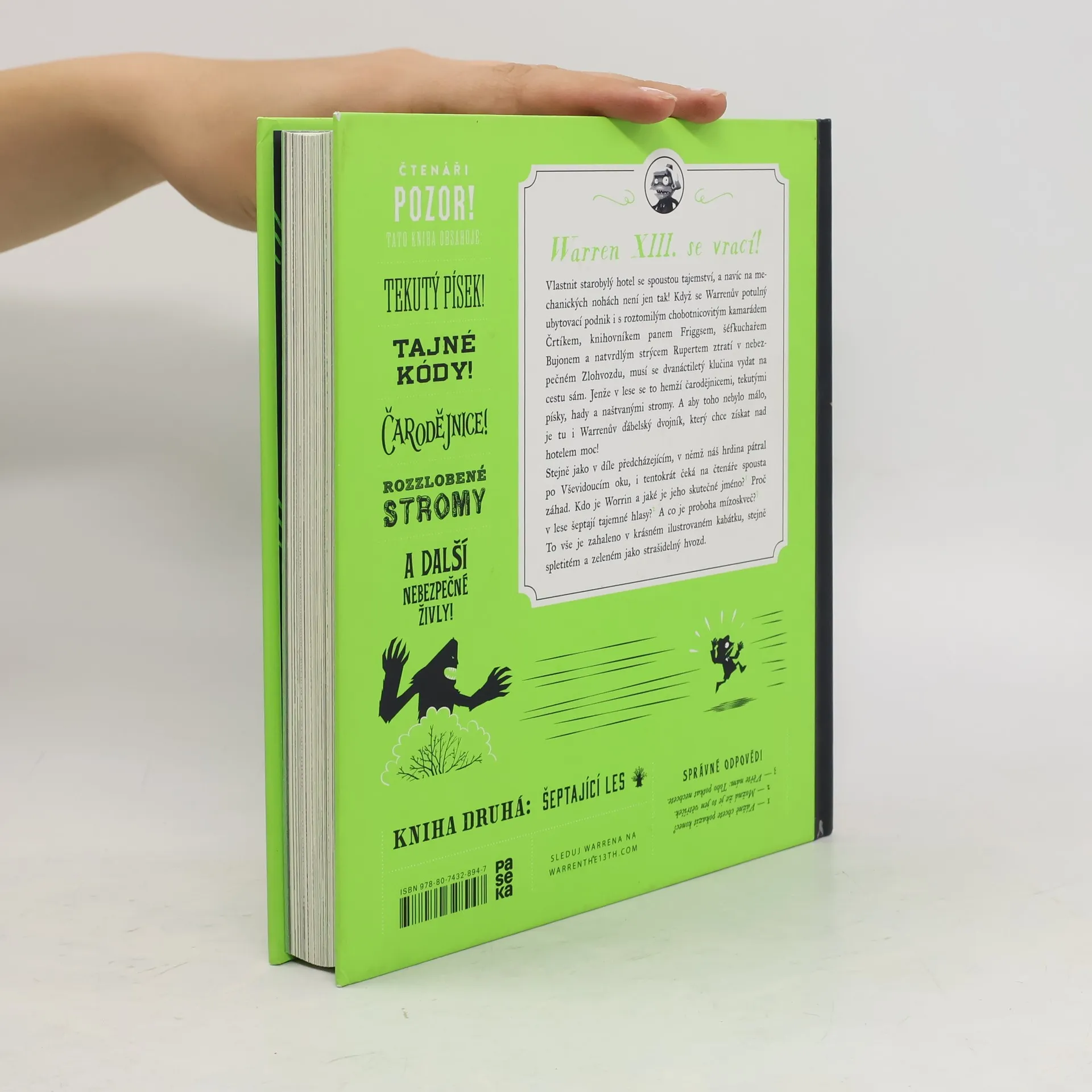 Warren XIII. vás přesvědčí, že vlastnit starobylý hotel se spoustou tajemství není jen tak! Když se jeho potulný ubytovací podnik i s roztomilým chobotnicovitým mazlíčkem Črtíkem, knihovníkem panem Friggsem, šéfkuchařem Bujonem a natvrdlým strýcem Rupertem ztratí v nebezpečném Zlohvozdu, musí se dvanáctiletý klučina vydat na cestu sám. Jenže v lese se to hemží čarodějnicemi, tekutými písky, hady a naštvanými stromy. A aby toho nebylo málo, je tu i Warrenův ďábelský dvojník, který chce získat nad hotelem moc! Stejně jako v díle předcházejícím, v němž náš hrdina pátral po Vševidoucím oku, i tentokrát čeká na čtenáře spousta záhad. Kdo je Worrin a jaké je jeho skutečné jméno? Proč v lese šeptají tajemné hlasy? A co je proboha mízoskveč? To vše je zahaleno v krásném ilustrovaném kabátku, stejně spletitém a zeleném jako strašidelný hvozd.