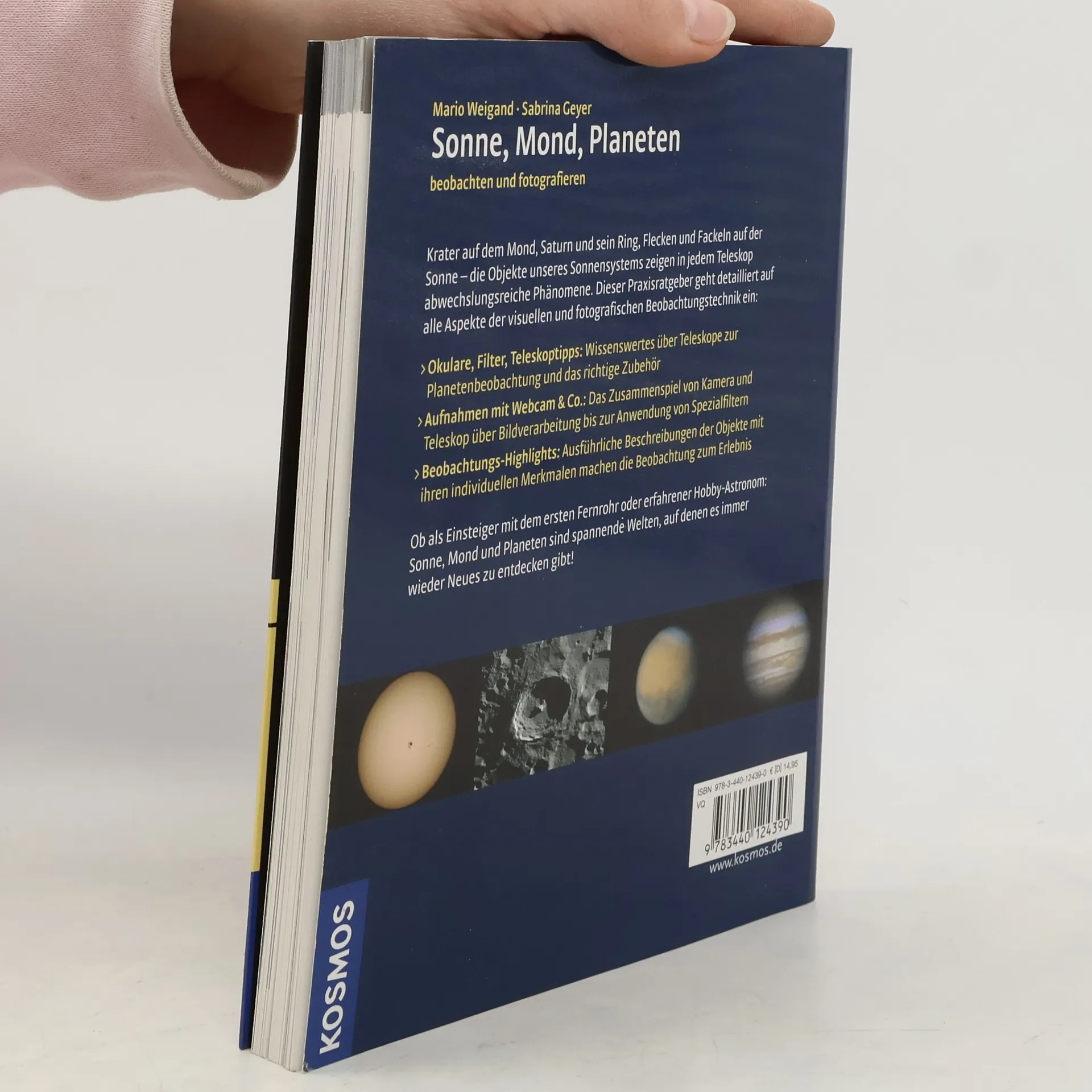 Eine große Umfrage unter Hobby-Astronomen hat es gezeigt: Sonne, Mond und Planeten sind die beliebtesten Ziele der Himmelsbeobachter. Selbst mit kleinen Fernrohren kann zum Beispiel der Ring des Saturn, Flecken auf der Sonne und Krater auf dem Mond beobachtet werden. Was genau es dort zu entdecken gibt, welche Beobachtungstechnik man am besten anwendet und mit welchen Tricks die Profis unter den Hobby-Astronomen arbeiten, verraten die Autoren in ihrem Praxisratgeber. Auch die Fotografie erfreut sich dank Webcams und Digitalkameras großer Beliebtheit. Freizeitastronomen können mit besonderen Tricks sogar schärfere Bilder als Profis machen!