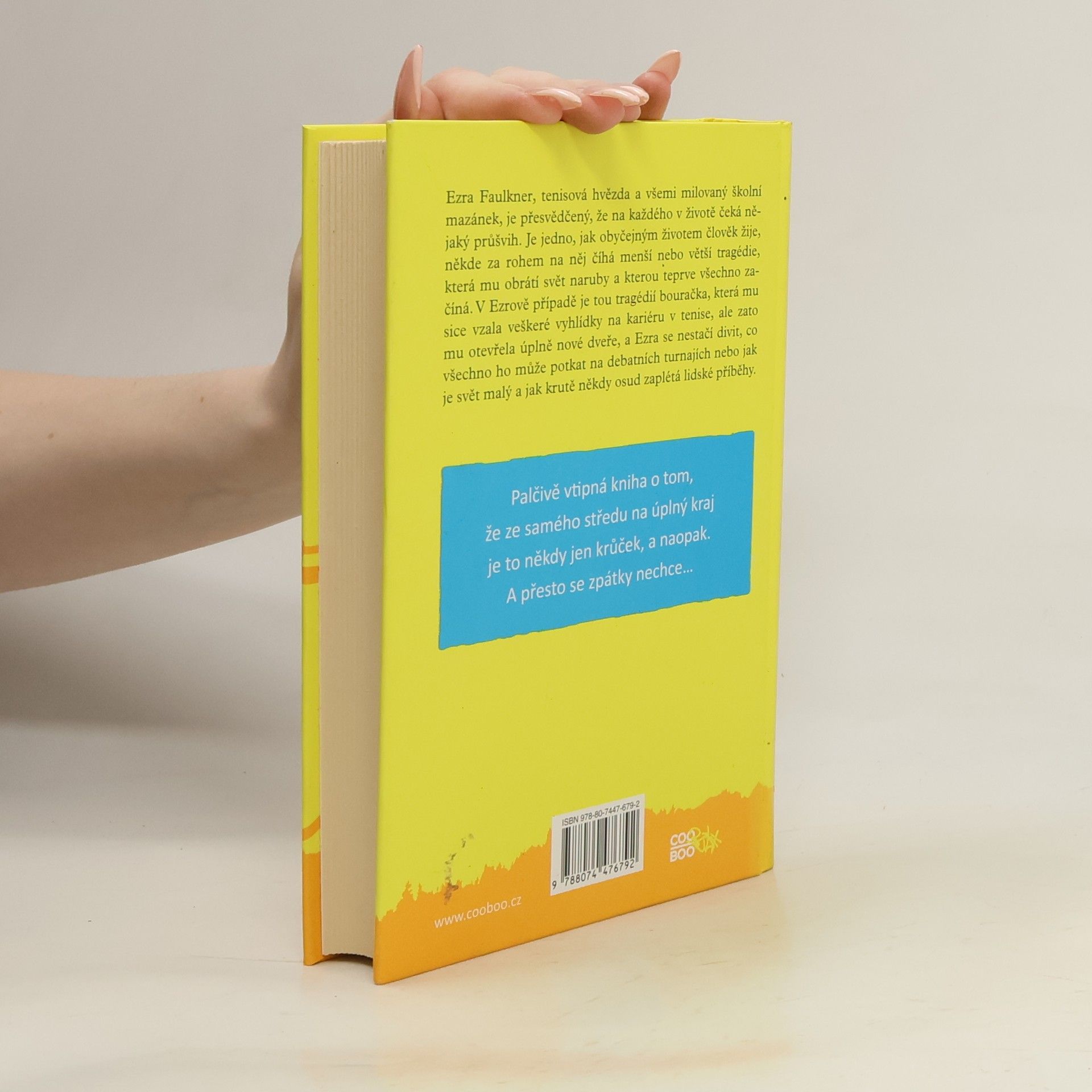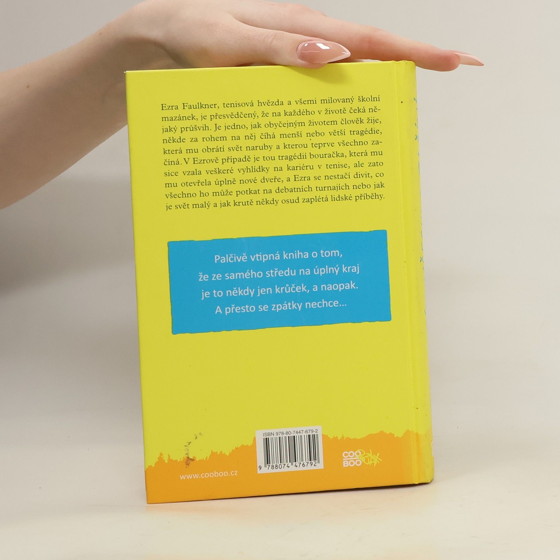 Ezra Faulkner, tenisová hvězda a všeobecný školní mazánek, je přesvědčený, že na každého v životě čeká nějaký průšvih. Je jedno, jak obyčejně člověk žije, někde za rohem na něj číhá menší nebo větší tragédie, která mu obrátí svět naruby a kterou teprve všechno začíná. V Ezrově případě je tou tragédií bouračka, která mu sice vzala veškeré vyhlídky na kariéru v tenise, ale zato mu otevřela úplně nové dveře a Ezra se nestačí divit, co všechno ho může potkat na debatních turnajích nebo jak je svět malý a jak krutě někdy osud zaplétá lidské příběhy. Palčivě vtipná kniha o tom, že ze samého středu na úplný kraj je to někdy jen krůček, a naopak. A přesto se zpátky nechce…