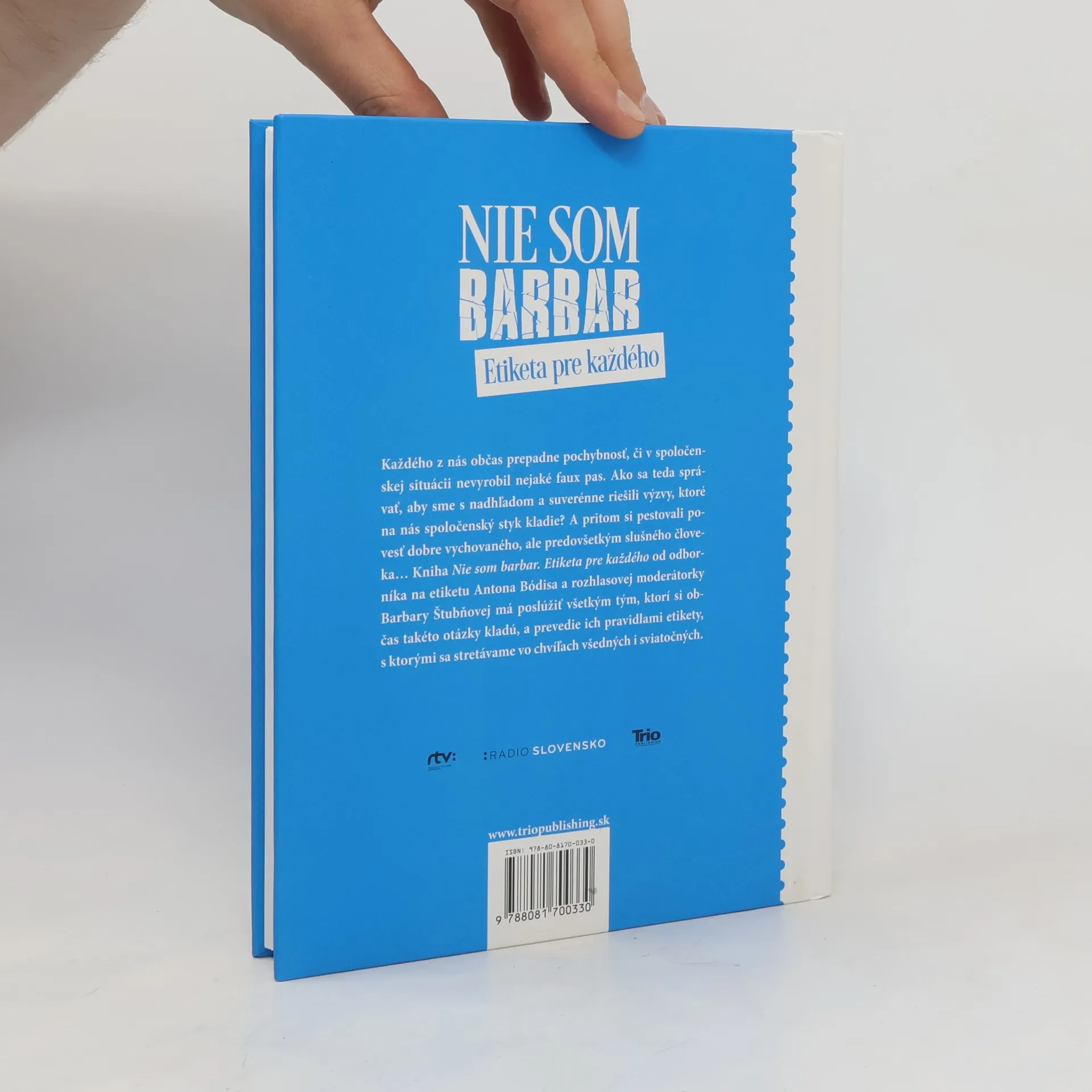 Etiketa pre každého. Každého z nás občas prepadne pochybnosť, či v spoločenskej situácii nevyrobil nejaké faux pas. Ako sa teda správať, aby sme s nadhľadom a suverénne riešili výzvy, ktoré na nás spoločenský styk kladie? A pritom si pestovali povesť dobre vychovaného, ale predovšetkým slušného človeka... Kniha Nie som barbar. Etiketa pre každého od odborníka na etiketu Antona Bódisa a rozhlasovej moderátorky Barbary Štubňovej má poslúžiť všetkým tým, ktorí si občas takéto otázky kladú, a prevedie ich pravidlami etikety, s ktorými sa stretávame vo chvíľach všedných i sviatočných.