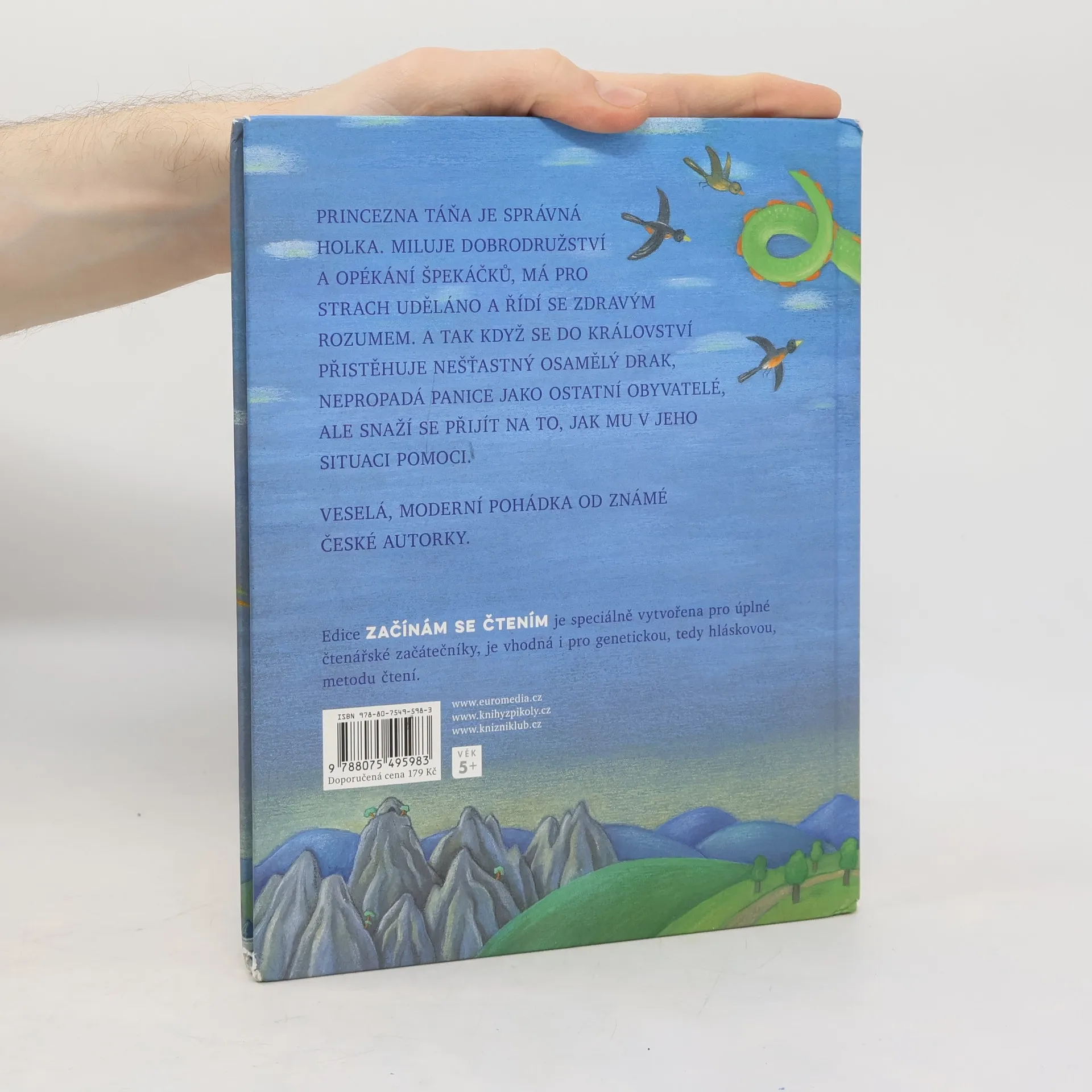 Veselá moderní pohádka od známé české autorky o neohrožené princezně, která vidí svět kolem sebe, jaký je, a při rozhodování se neřídí strachem a předsudky, ale svým zdravým rozumem. A tak když se do království přistěhuje nešťastný osamělý drak, nepropadá panice jako ostatní obyvatelé, ale snaží se přijít na to, jak mu v jeho situaci pomoci. Knížka je vhodná pro nácvik genetické metody prvního čtení, neboť je vysázená velkými písmeny.