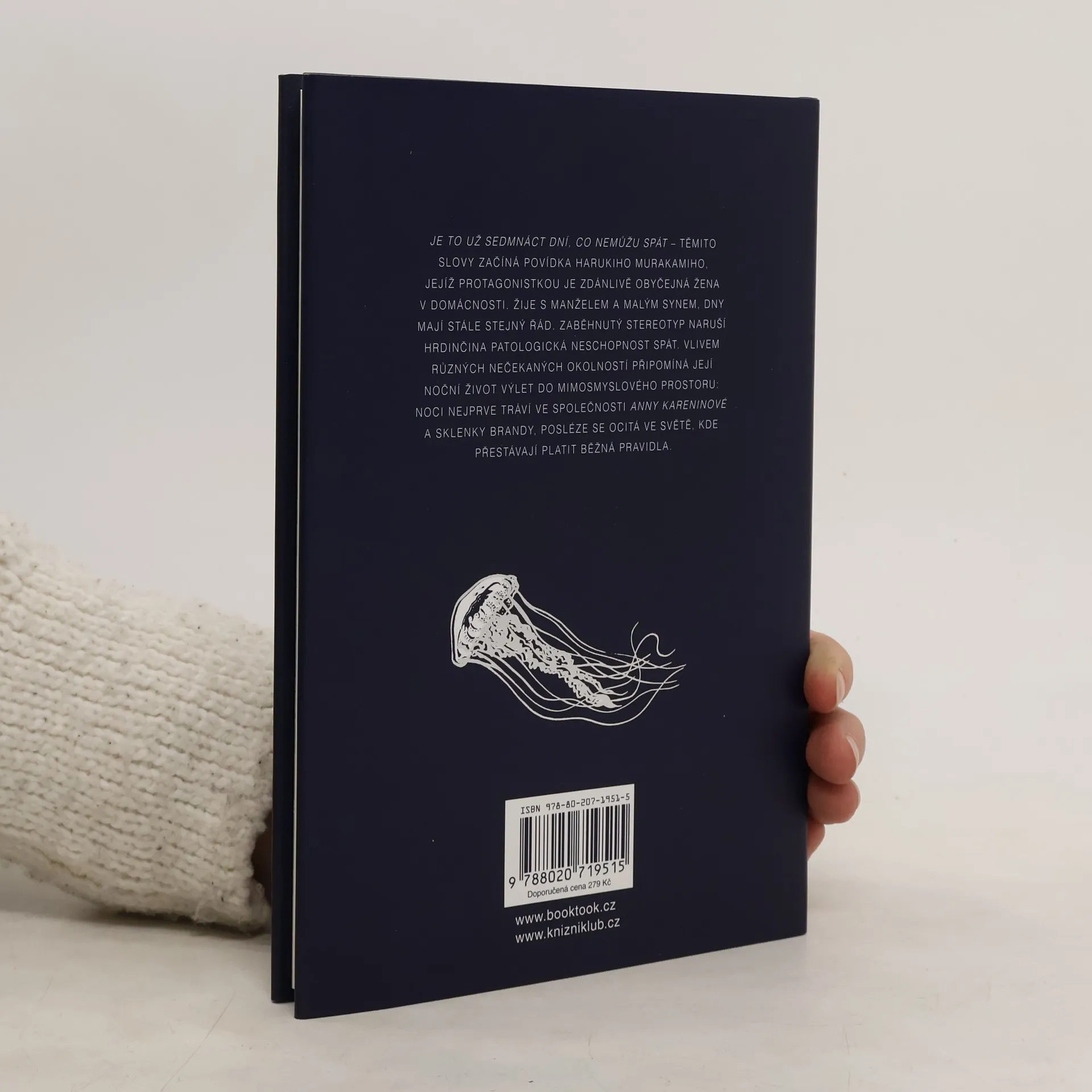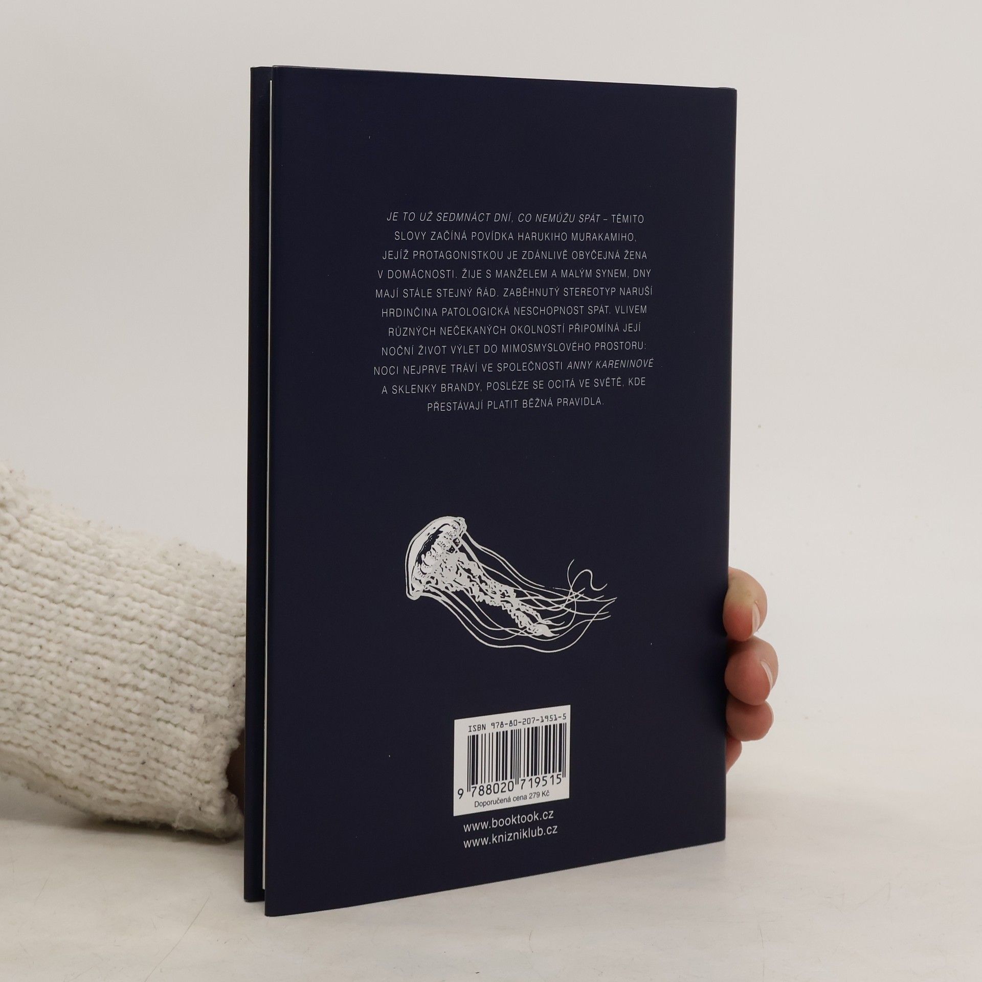 „Je to už sedmnáct dní, co nemůžu spát,“ tak začíná povídka Harukiho Murakamiho, jejíž protagonistkou je zdánlivě obyčejná žena v domácnosti. Vlivem různých nečekaných okolností připomíná její noční život výlet do mimosmyslového prostoru. Ve světě, který je naprosto odlišný od našeho, prozkoumává svou rodinu, sama sebe, i význam života a smrti. Ilustrační doprovod ke knize vytvořila známá německá grafička Kat Menschik.