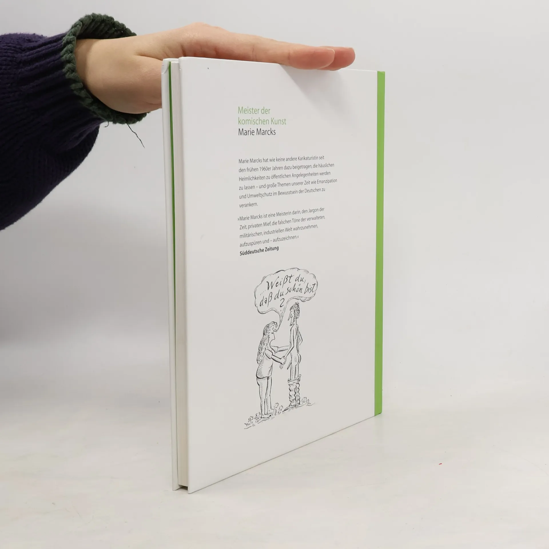 Marie Marcks (Jahrgang 1922) – die »grande dame« der Karikatur hat seit den frühen 1960er Jahren wesentlich dazu beigetragen, Themen wie Emanzipation und Umweltschutz im Bewusstsein der Deutschen zu verankern. Ihre Zeichnungen prägten darüber hinaus das Erscheinungsbild von Medien wie der Süddeutschen Zeitung, des SPIEGEL, des STERN und vieler anderer Blätter.