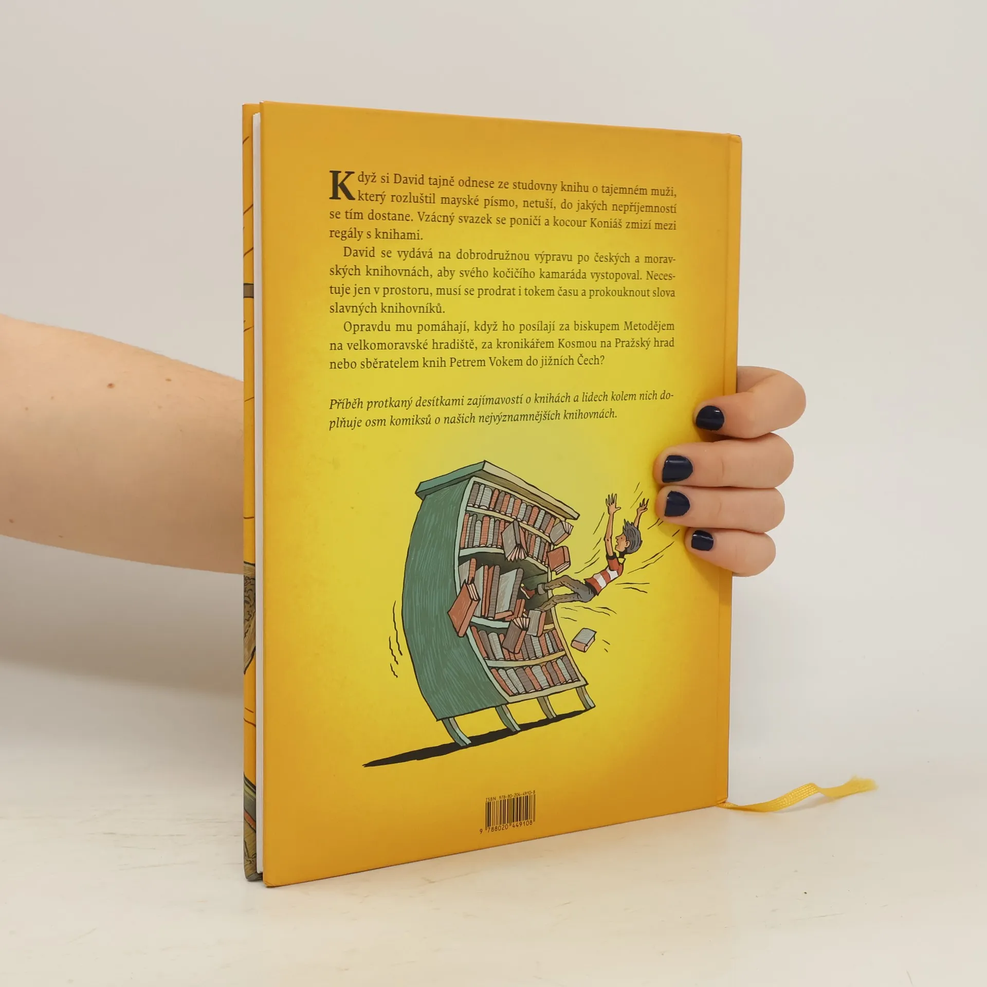David je náruživý čtenář a každý ví, že při čtení běží čas jinak. Zastavuje se, všelijak se kroutí a pak se klidně obrátí čelem vzad. Kocour Koniáš zálibu svého pána ve čtení zprvu s kočičím nezájmem přehlížel, jenže pak se sám mezi knihami ztratil. David stopuje kocoura a jeho stopy ho dovedou do mnoha českých a moravských knihoven. Jenže chlapec necestuje jen z Prahy do Brna, z Brna do Třeboně a z Třeboně do Podlažic, cestuje také časem, neboť knihovny jsou do sebe knihami zaklesnuté jako most, který spojuje přítomnost s minulostí. Na kocoura ztraceného mezi knihami se musí David vyptat těch nejpovolanějších – knihovníků. Pomůže mu snaživý knihovník Petra Voka či tajnůstkářský Václav Hanka z muzejní knihovny? A může vůbec věřit slovům uhrančivého Jiřího Mahena, knihovníka s černými kruhy pod očima?