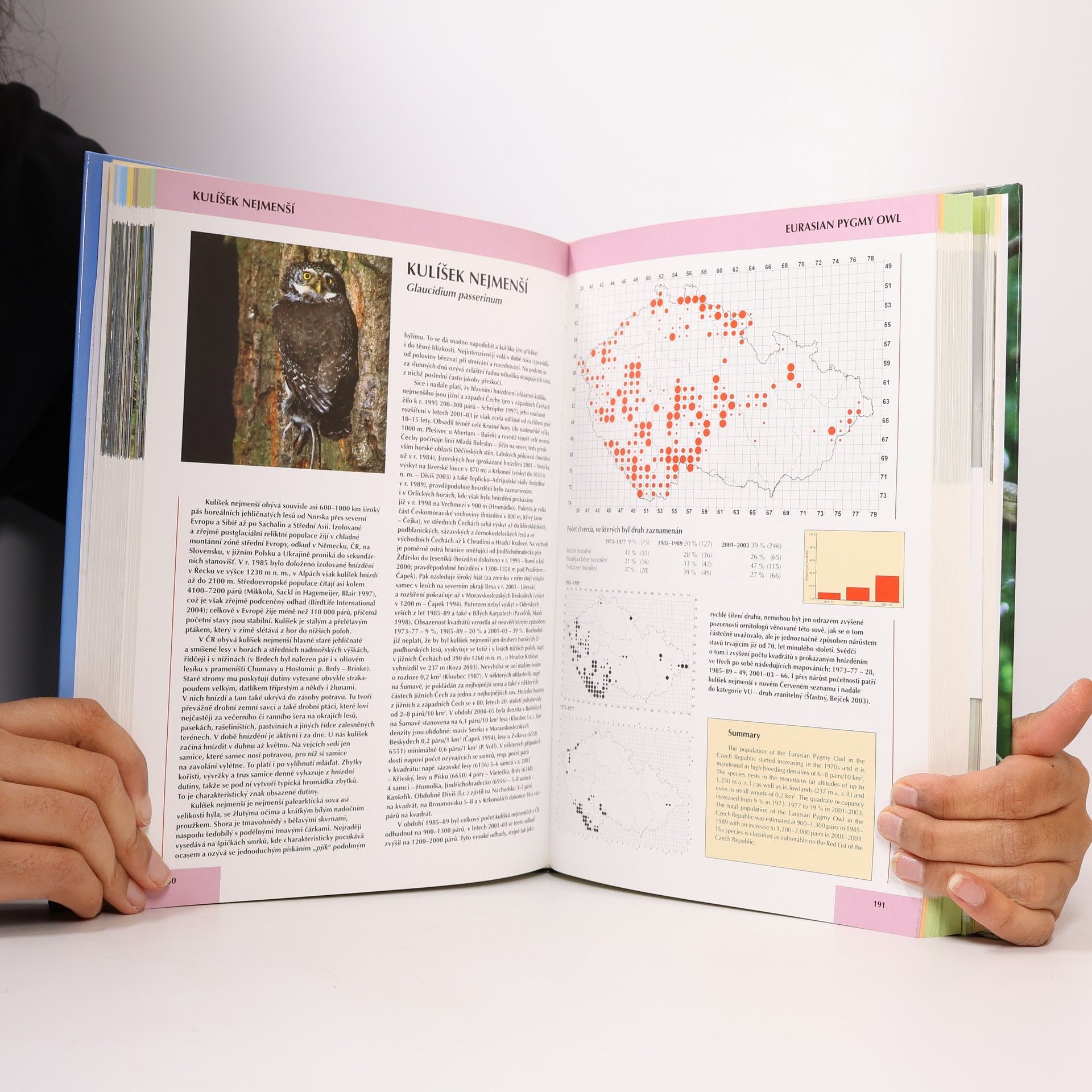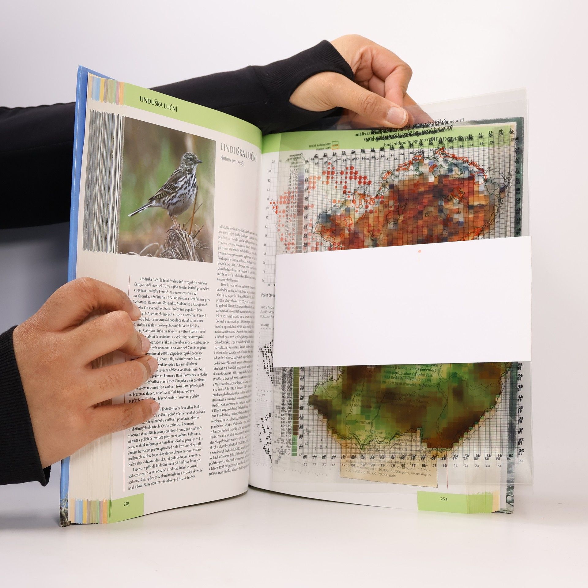 Úspěšná obsáhlá publikace, na které se kromě hlavních autorů podílelo přes 500 ornitologů a dalších spolupracovníků z řad milovníků ptáků a která by neměla chybět v žádné školní přírodovědné knihovně, podává vyčerpávajícím způsobem informace o hnízdním rozšíření ptáků podle jednotlivých zkoumaných oblastí naší republiky. Nechybí ani srovnání nových map s minulými pozorováními a je navíc doplněna průhlednými foliemi sloužícími k bližšímu určení ptačího životního prostředí. Ke každému ptáku je připojen také jeho anglický název a anglický souhrn. Barevný tisk na 135 g matovém křídovém papíře, pevná vazba, v knize jsou vloženy 4 ks folií s mapami.