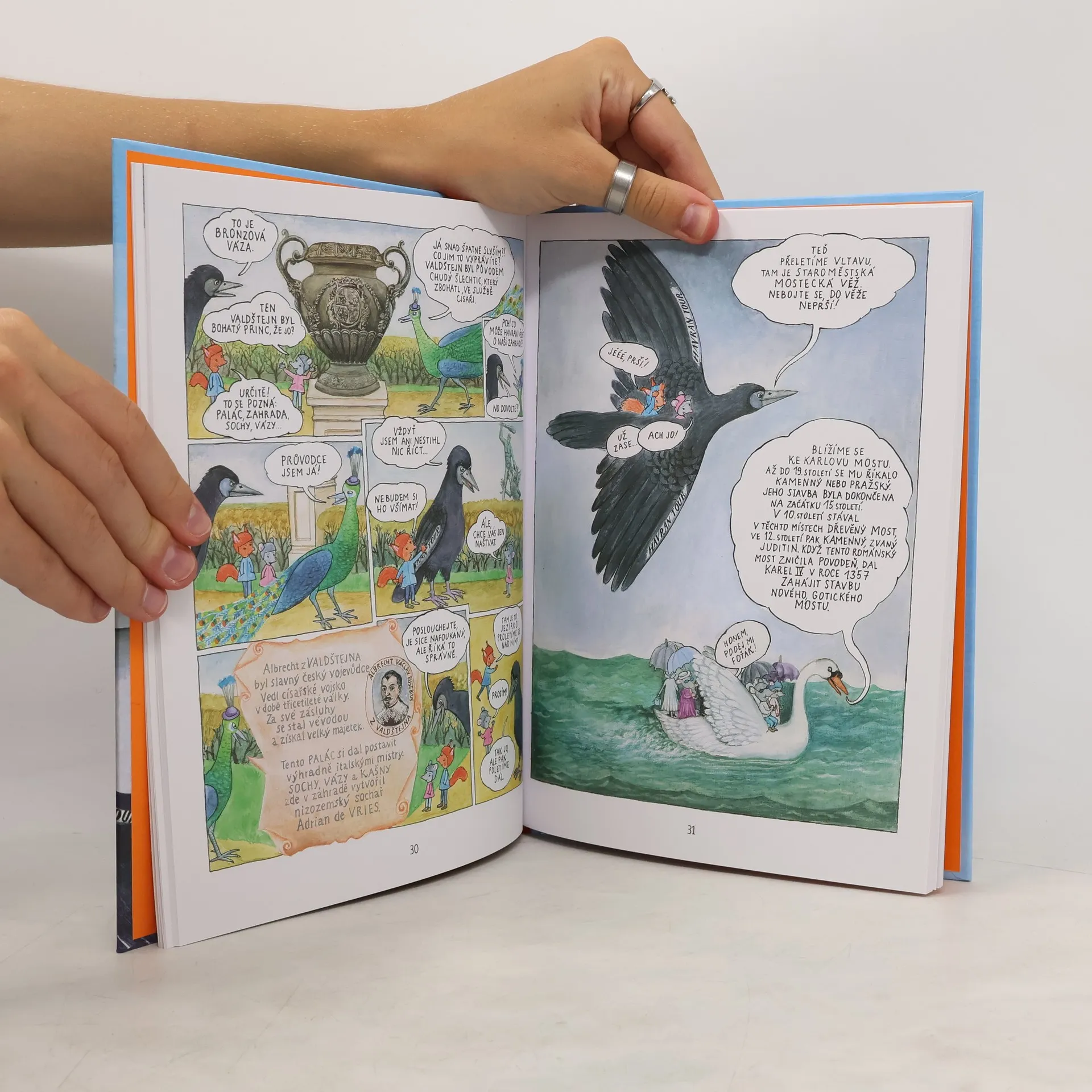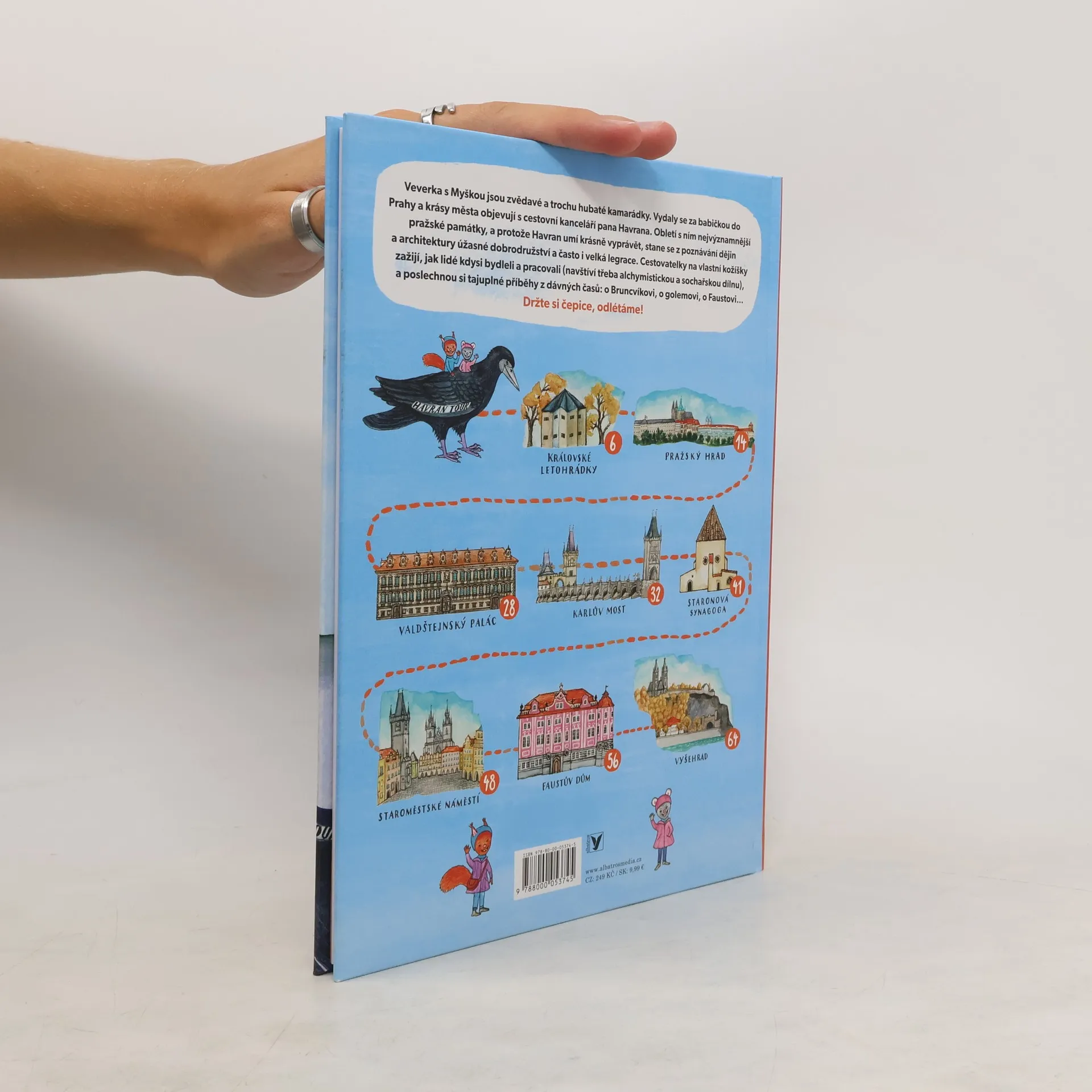 Komiksový průvodce Prahou Veverka s Myškou jsou zvědavé a trochu hubaté kamarádky. Vydaly se za babičkou do Prahy a krásy města objevují s cestovní kanceláří pana Havrana. Obletí s ním nejvýznamnější památky, a protože Havran umí krásně vyprávět, stane se z poznávání dějin úžasné dobrodružství a velká legrace. Cestovatelky na vlastní kožíšky poznají, jak lidé kdysi žili (navštíví třeba alchymistickou dílnu), a poslechnou si i tajuplné pražské legendy. Držte si čepice, odlétáme!