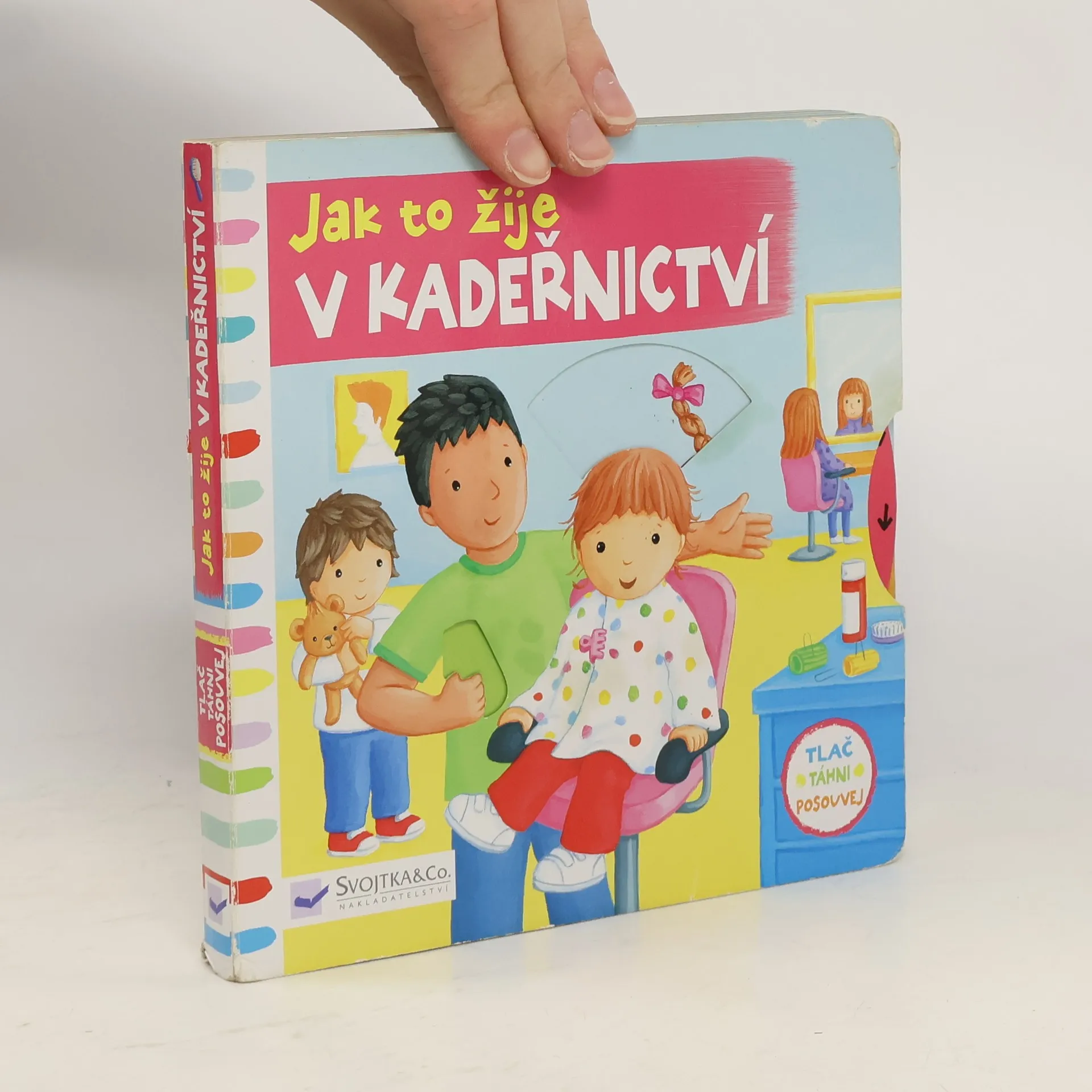 Leporelo je určeno dětem od jednoho roku. Má pevné stránky s posuvnými a otočnými prvky. Zjisti, jak to žije v kadeřnictví, a procvič si svou jemnou motoriku.Zajímá tě, jak to žije v kadeřnictví? Opláchni pánovi šampon z vlasů! Otoč kolečkem a zjisti, jak holčičkám sluší nové účesy. Zastřihni chlapečkovi vlásky, šup, stačí jeden pohyb! Toto dětské leporelo je určeno pro děti od jednoho roku. Má pevné stránky s posuvnými a otočnými prvky, a tak si dítě při prohlížení knížky současně procvičí jemnou motoriku - může na jednotlivých stránkách posouvat, tahat, otáčet. Objeví nové věci a můžete si o nich společně povídat! Tak honem, stříhat a česat je tak zajímavé!