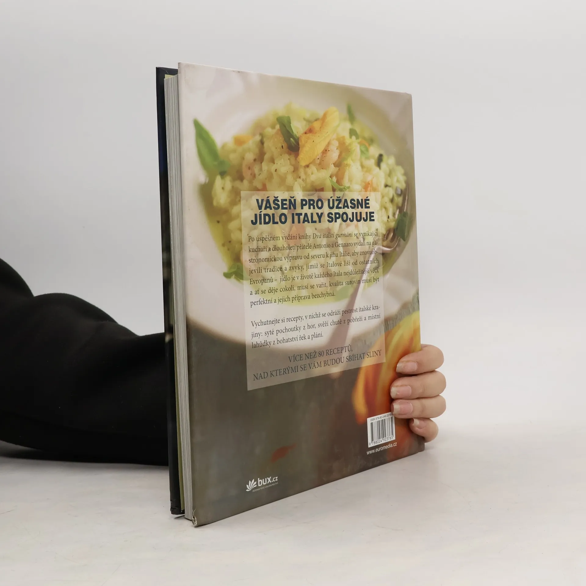 Vášeň pro úžasné jídlo Italy spojuje. Dva vynikající kuchaři Antonio a Gennaro se vydali na gastronomickou výpravu od severu k jihu Itálie, aby znovuobjevili tradice a zvyky, jimiž se Italové liší od ostatních Evropanů – jídlo je v jejich životě nejdůležitější věc. Ať se děje cokoliv, musí se vařit, suroviny musí být perfektní a jejich příprava bezchybná. Vychutnejte si více než 80 jídel, v nichž se odráží pestrost italské krajiny: syté pochoutky z hor, svěží chutě z pobřeží a místní lahůdky z bohatství řek a plání. Fotografie: Chris Terry.