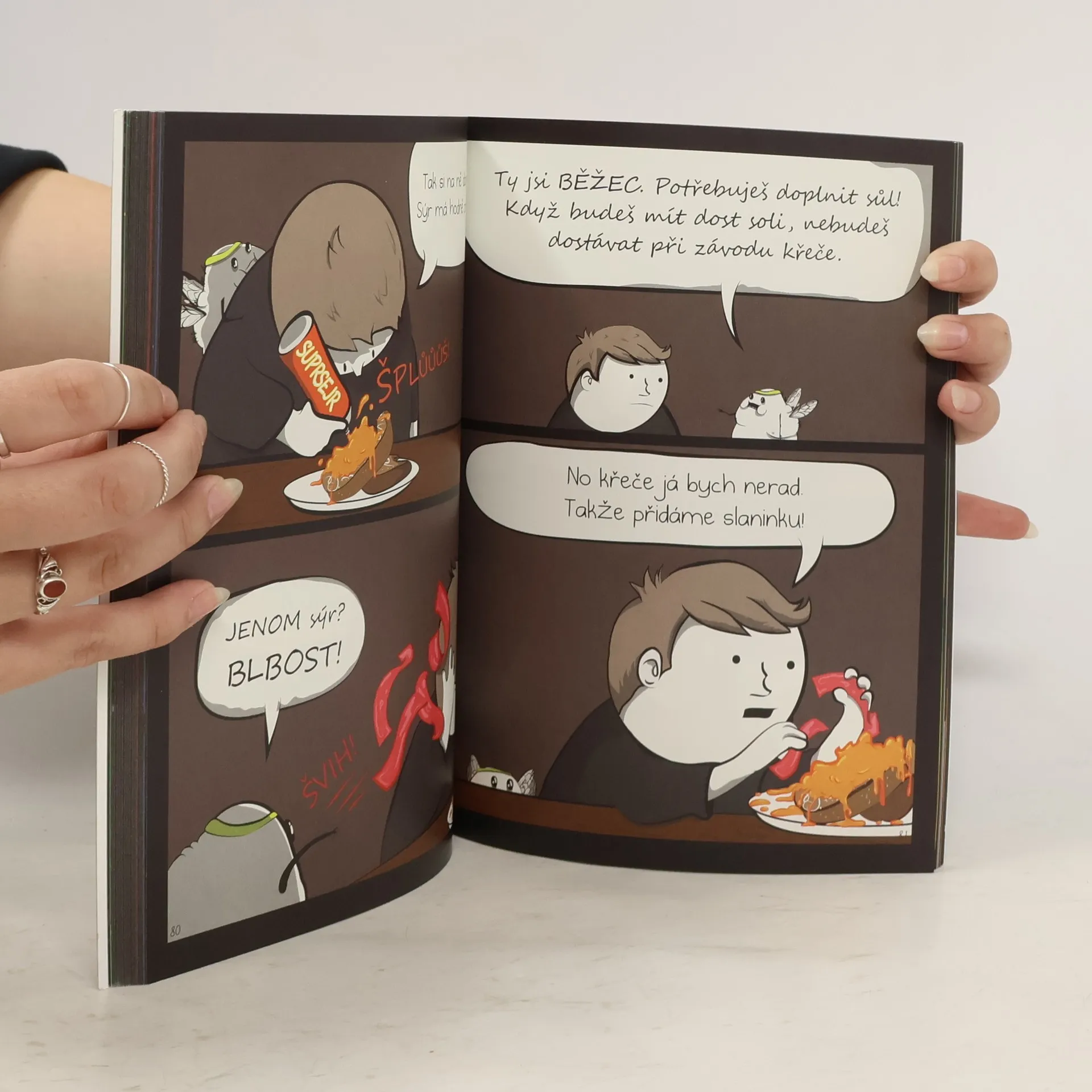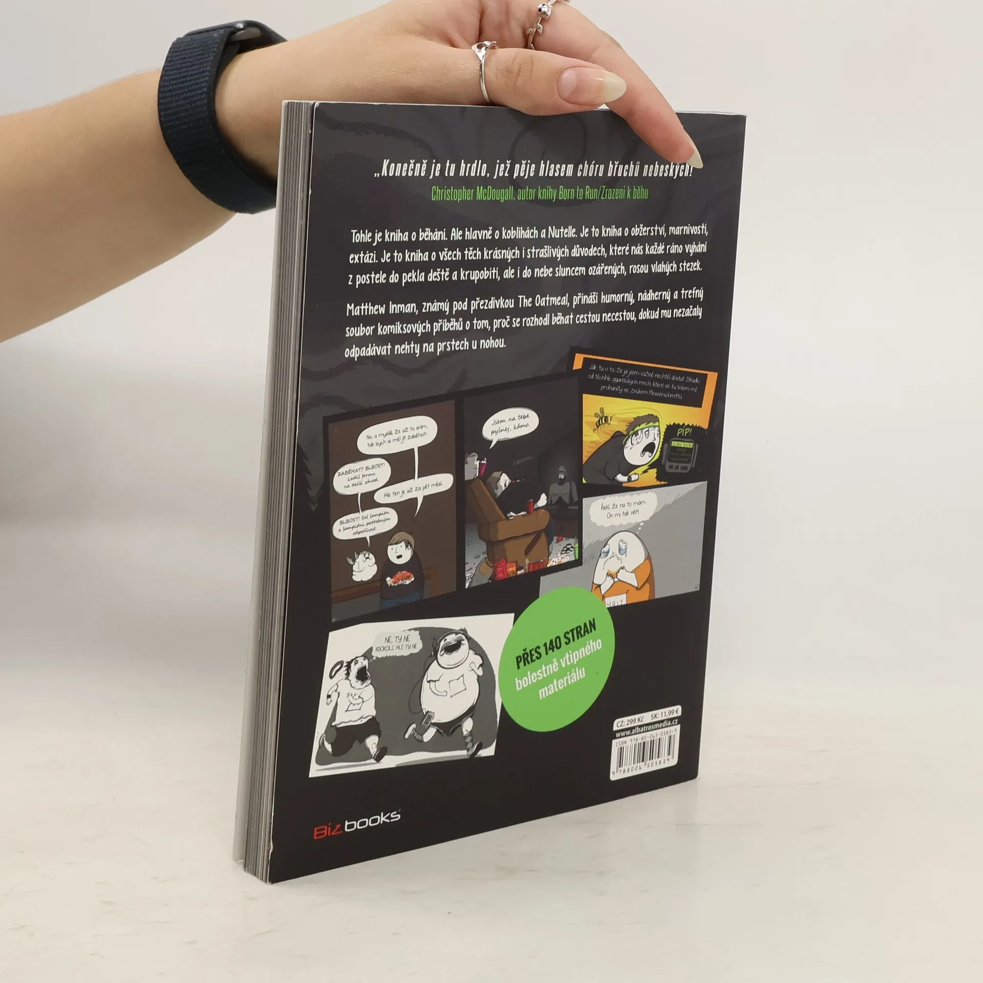 Tohle je kniha o běhání. Ale hlavně o koblihách a Nutelle. Je to kniha o obžerství, marnivosti, extázi. Je to kniha o všech těch krásných i strašlivých důvodech, které nás každé ráno vyhání z postele do pekla deště a krupobití, ale i do nebe sluncem ozářených, rosou vlahých stezek. Matthew Inman, známý pod přezdívkou The Oatmeal, přináší humorný, nádherný a trefný soubor komiksových příběhů o tom, proč se rozhodl běhat cestou necestou, dokud mu nezačaly odpadávat nehty na prstech u nohou. Přes 140 stran bolestně vtipného materiálu! „Konečně je tu hrdlo, jež pěje hlasem chóru břuchů nebeských!“ -Christopher McDougall, autor knihy Born to Run/Zrozeni k běhu „Všichni běžci si dříve nebo později začnou klást otázku, proč to vlastně dělají. Vysvětlení, které tu předkládá Matthew Inman je jedno z nejvýstižnějších, na které jsem kdy narazil. A také nejzábavnější. Zřejmě to bude tím, že je asi tak trochu duševně chorý.“ -Mark Remy, šéfredaktor magazínu Runner's World, autor knihy The Runner's Rule Book
