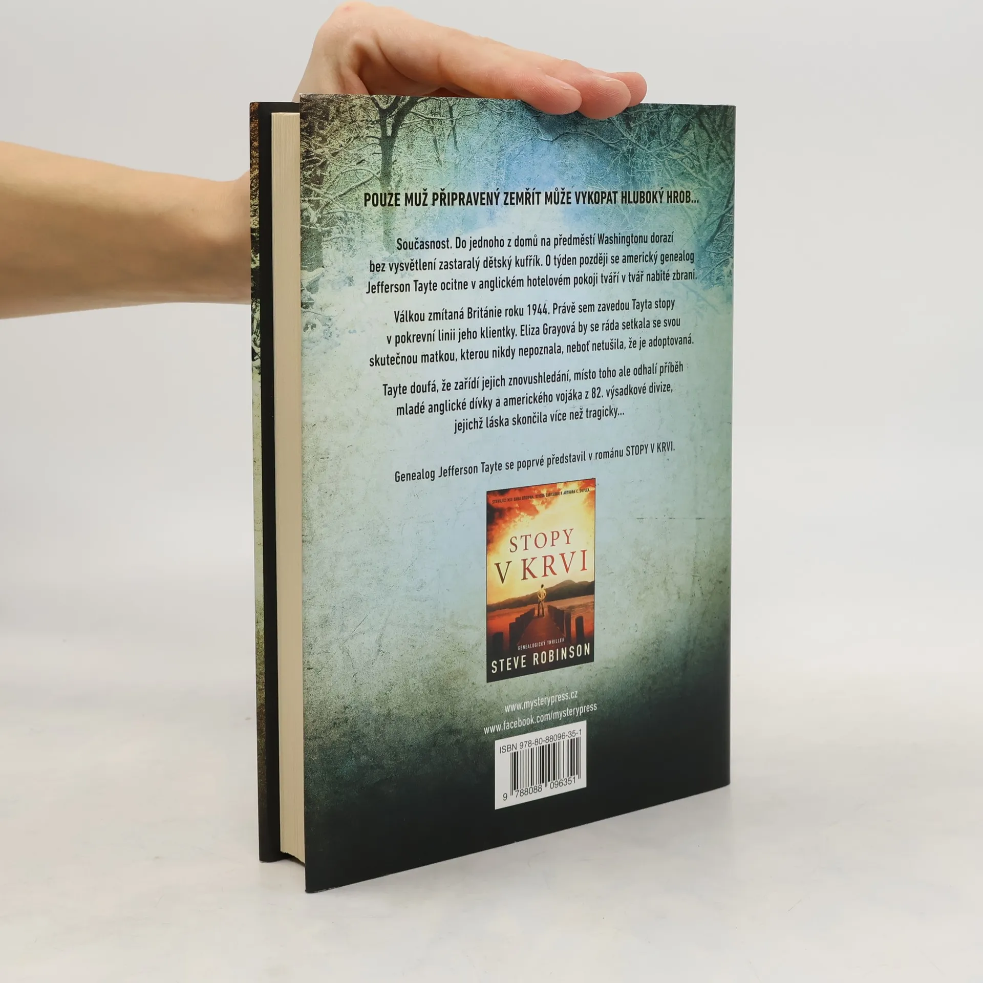 POUZE MUŽ PŘIPRAVENÝ ZEMŘÍT MŮŽE VYKOPAT HLUBOKÝ HROB… Současnost. Do jednoho z domů na předměstí Washingtonu dorazí bez vysvětlení zastaralý dětský kufřík. O týden později se americký genealog Jefferson Tayte ocitne v anglickém hotelovém pokoji tváří v tvář nabité zbrani. Válkou zmítaná Británie roku 1944. Právě sem zavedou Tayta stopy v pokrevní linii jeho klientky. Eliza Grayová by se ráda setkala se svou skutečnou matkou, kterou nikdy nepoznala, neboť netušila, že je adoptovaná. Tayte doufá, že zařídí jejich znovushledání, místo toho ale odhalí příběh mladé anglické dívky a amerického vojáka z 82. výsadkové divize, jejichž láska skončila více než tragicky…