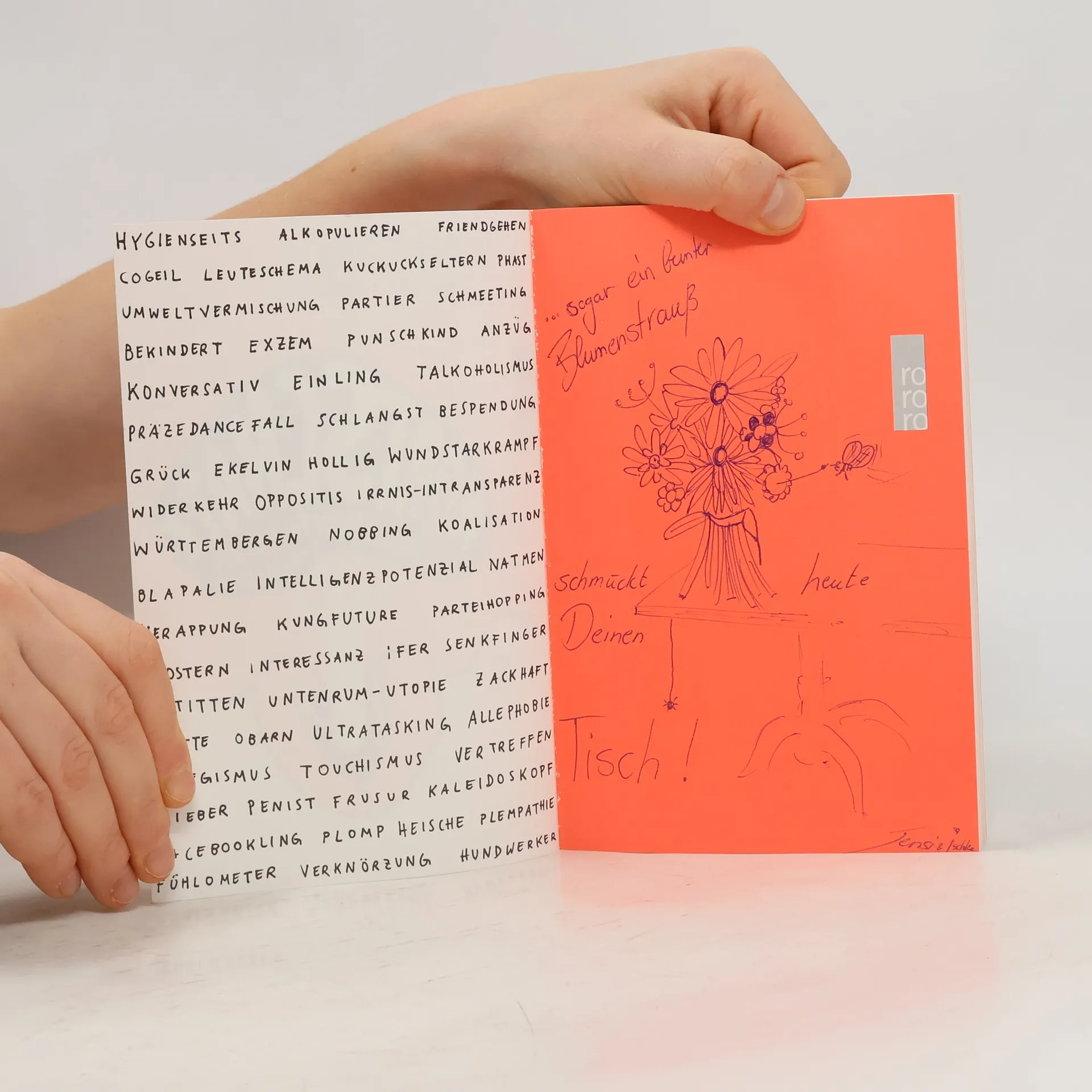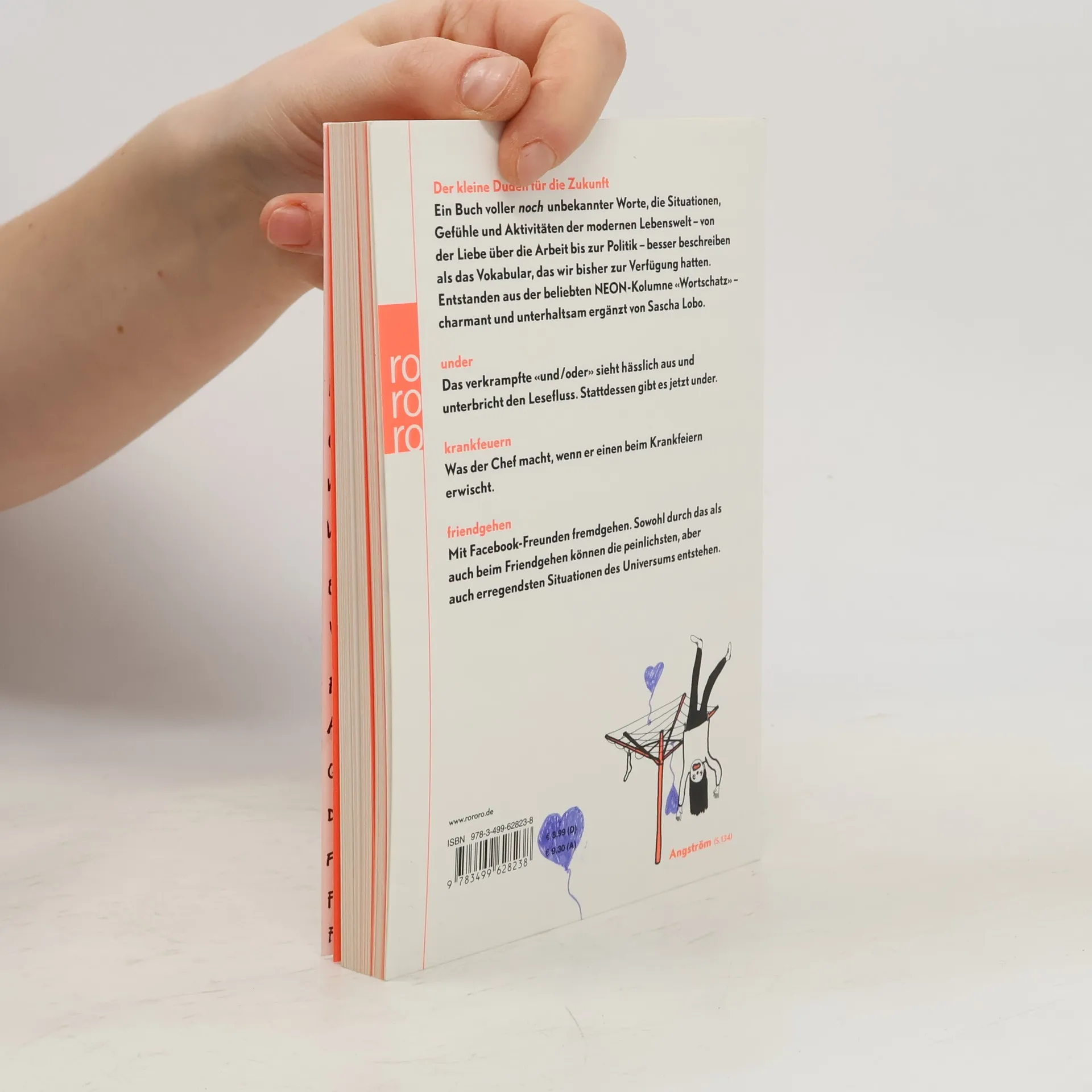 Der kleine Duden für die ZukunftEin Buch voller noch unbekannter Worte, die Situationen, -Gefühle und Aktivitäten der modernen Lebenswelt – von der Liebe über die Arbeit bis zur Politik – besser beschreiben als das Vokabular, das wir bisher zur Verfügung hatten. -Entstanden aus der beliebten NEON-Kolumne «Wortschatz» – charmant und unterhaltsam ergänzt von Sascha Lobo.underDas verkrampfte «und/oder» sieht hässlich aus und - unterbricht den Lesefluss. Stattdessen gibt es jetzt under.krankfeuernWas der Chef macht, wenn er einen beim Krankfeiern erwischt.friendgehenMit Facebook-Freunden fremdgehen. Sowohl durch das als auch beim Friendgehen können die peinlichsten, aber auch erregendsten Situationen des Universums entstehen.