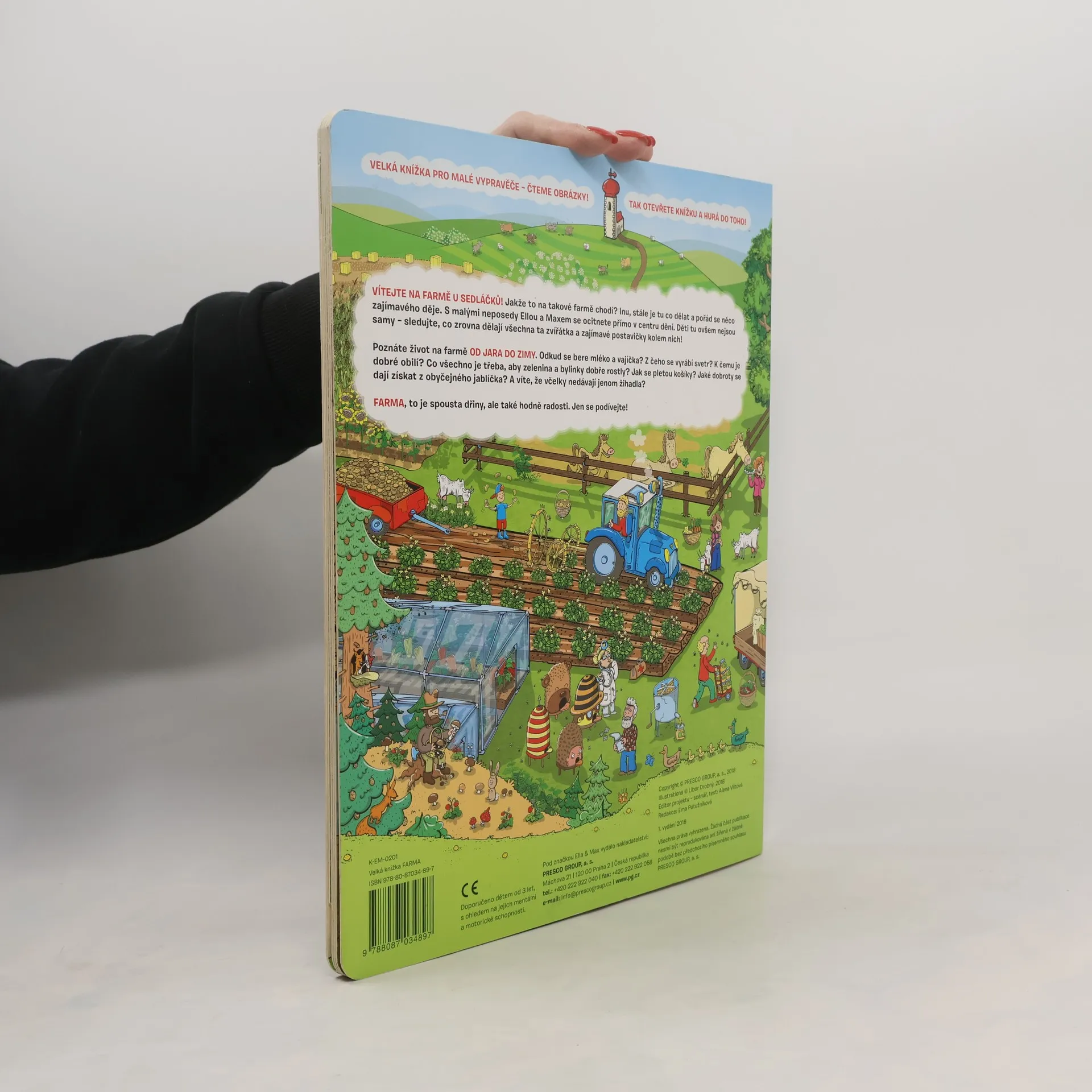 VÍTEJTE NA FARMĚ U SEDLÁČKŮ! Jakže to na takové farmě chodí? Inu, stále je tu co dělat a pořád se něco zajímavého děje. S malými neposedy Ellou a Maxem se ocitnete přímo v centru dění. Děti tu ovšem nejsou samy – sledujte, co zrovna dělají všechna ta zvířátka a zajímavé postavičky kolem nich! Poznáte život na farmě OD JARA DO ZIMY. Odkud se bere mléko a vajíčka? Z čeho se vyrábí svetr? K čemu je dobré obilí? Co všechno je třeba, aby zelenina a bylinky dobře rostly? Jak se pletou košíky? Jaké dobroty se dají získat z obyčejného jablíčka? A víte, že včelky nedávají jenom žihadla? Knihy ilustrátora Libora Drobného jsou charakteristické svou hravostí, vtipem a jedinečným, lehce rozpoznatelným stylem, utvářeným detailními pestrobarevnými ilustracemi. Toto původní české dílo bude základním kamenem každé dětské knihovničky. FARMA, to je spousta dřiny, ale také hodně radosti. Jen se podívejte!