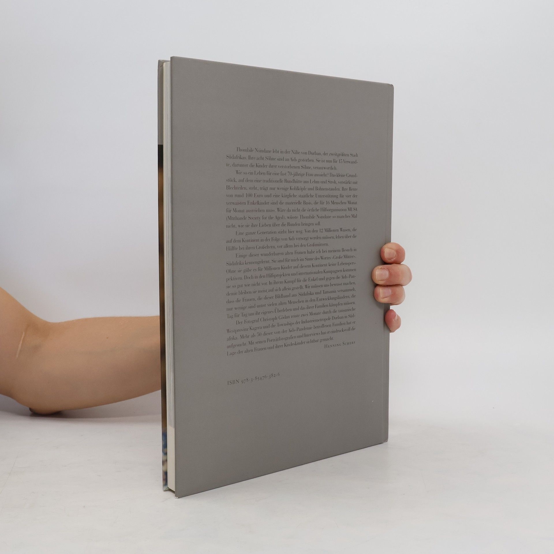 'Thombile Nsindane lebt in der Nähe von Durban, der zweitgrößten Stadt Südafrikas. Ihre acht Söhne sind an Aids gestorben. Sie ist nun für 15 Verwandte, darunter die Kinder ihrer verstorbenen Söhne, verantwortlich', schreibt Henning Scherf in seinem Vorwort zu diesem Buch über eine von vielen 'Großen Müttern'. In weiten Teilen Afrikas pflegen sie ihre schwerkranken Töchter und Söhne. Sind diese gestorben, so ziehen sie ihre Enkelkinder auf. 30 Prozent aller Haushalte in Subsahara-Afrika werden inzwischen von alten Menschen gemanagt, obwohl sie selbst zu den Ärmsten der Armen gehören. Organisationen wie 'Help Age', 'Kwa Wazee' und 'Kindernothilfe' unterstützen insbesondere die in diesem Buch porträtierte ältere Generation und deren Enkelkinder. Der Fotograf Christoph Gödan war zwei Monate in der tansanischen Provinz Kagera und in den Townships der Industriemetropole Durban in Südafrika unterwegs. Dort besuchte er von Aids betroffene Familien. Neben Porträtfotografien entstanden dabei Interviews mit alten Frauen, die erzählten, wie die Immunschwächekrankheit das Leben ihrer Familie verändert hat und von welchen Schwierigkeiten ihr alltäglicher Überlebenskampf geprägt ist.