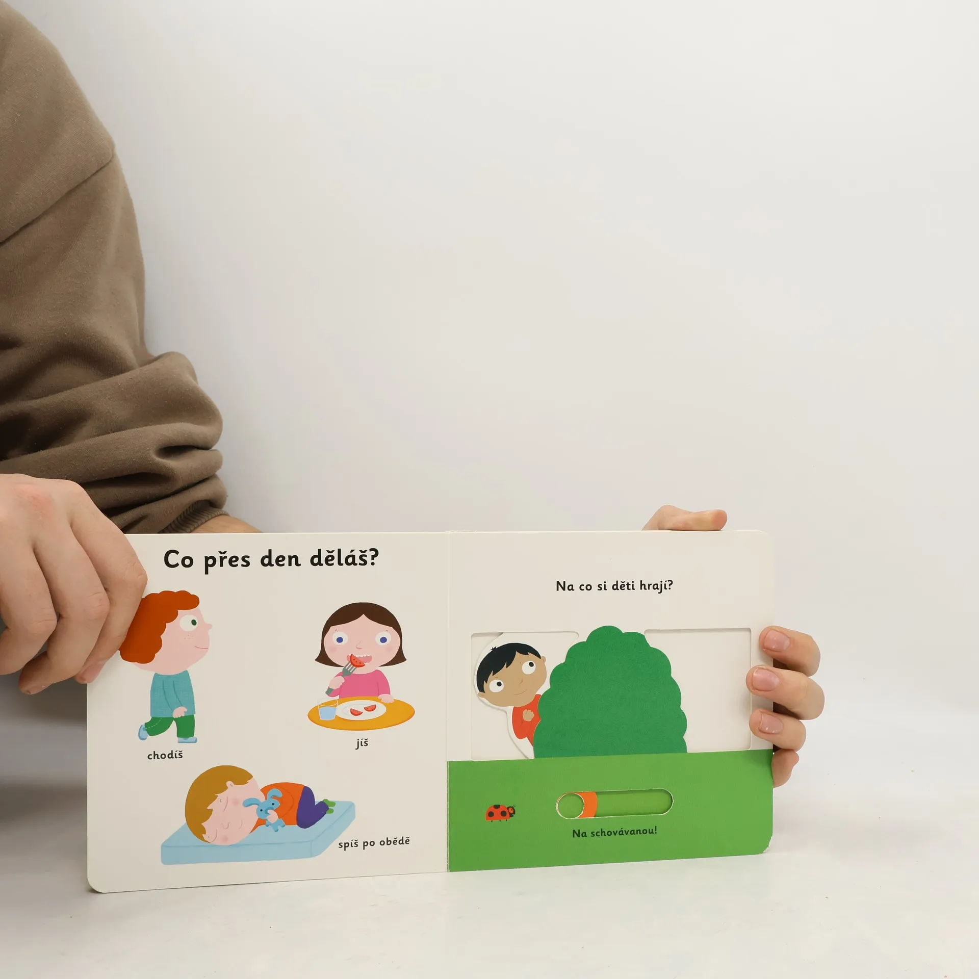 Objevovat svět lidského těla s tímto leporelem je tak zábavné! Co všechno přes den děláš? Kdo si hraje na dětském hřišti? Komu dává chlapeček pusinku? Stačí jen vložit prstík do správného otvoru a lehce vysunout, zatáhnout nebo otočit ve směru šipky a hned bude váš malý objevitel znát odpovědi. Leporelo je určeno pro nejmenší děti od jednoho roku a má pevné stránky s posuvnými a otočnými prvky, a tak si naši nejmenší mohou při prohlížení a učení jednotlivých částí těla, pojmenovávání pocitů a mnoha dalšího procvičit i jemnou motoriku.