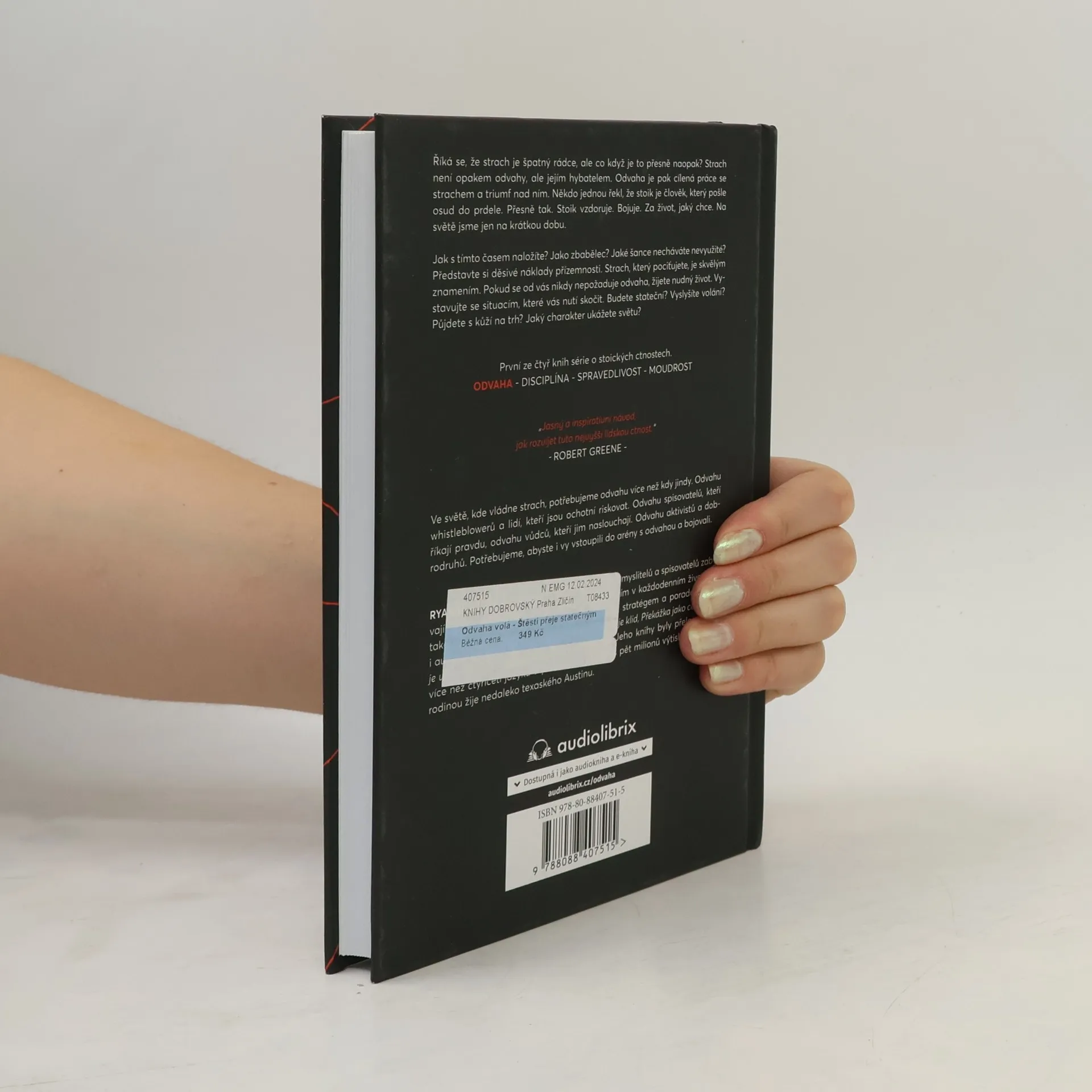 Říká se, že strach je špatný rádce, ale co když je to přesně naopak? Možná bychom mu měli bedlivě naslouchat, a pak udělat přesný opak toho, co nám radí. Strach není opakem odvahy, ale jejím hybatelem. Odvaha je pak cílená práce se strachem a triumf nad ním. Okamžik pravdy.Někdo jednou řekl, že stoik je člověk, který pošle osud do prdele. Přesně tak. Stoik vzdoruje. Bojuje. Musí si vyvzdorovat život, jaký chce. Jsme tady na velmi krátkou dobu.„Jak s tímto časem naložíte? Jako zbabělec? Jaké šance necháváte nevyužité? Představte si děsivé náklady přízemnosti. Strach, který pociťujete, je skvělým znamením. Pokud se od vás nikdy nepožaduje odvaha, žijete nudný život. Vystavujte se situacím, které vás nutí skočit. Budete stateční? Vyslyšíte volání? Půjdete s kůží na trh? Jaký charakter ukážete světu?“Takto úsečně, provokativně a apelativně promlouvá Ryan Holiday v první ze čtyř knih série o stoických ctnostech.ODVAHA - DISCIPLINA - SPRAVEDLIVOST - MOUDROST