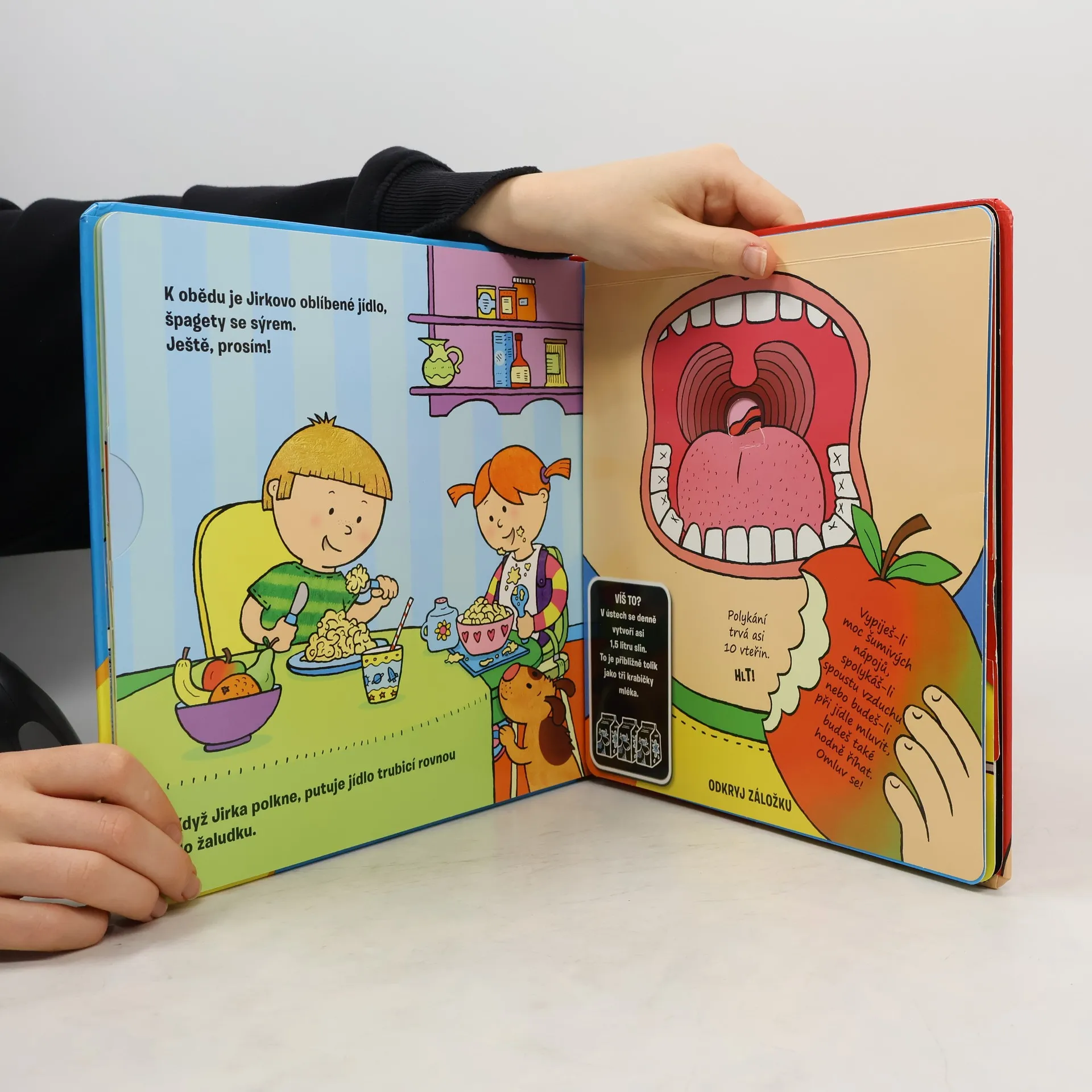 Tato interaktivní knížka se může stát prvním průvodcem lidským tělem. Stránku po stránce sleduje, co se děje po celý den uvnitř těla malého Jiříka. S prvními fakty o těle seznamuje děti zábavným a srozumitelným způsobem. Je totiž plná překvapení: odklápěcích záložek, otáčecích koleček a děti v ní najdou i skládací kostru! Co vlastně dělá mozek? A jak tělo zpracuje potravu? I na takové otázky tady děti najdou odpovědi. A ještě na mnoho dalších...