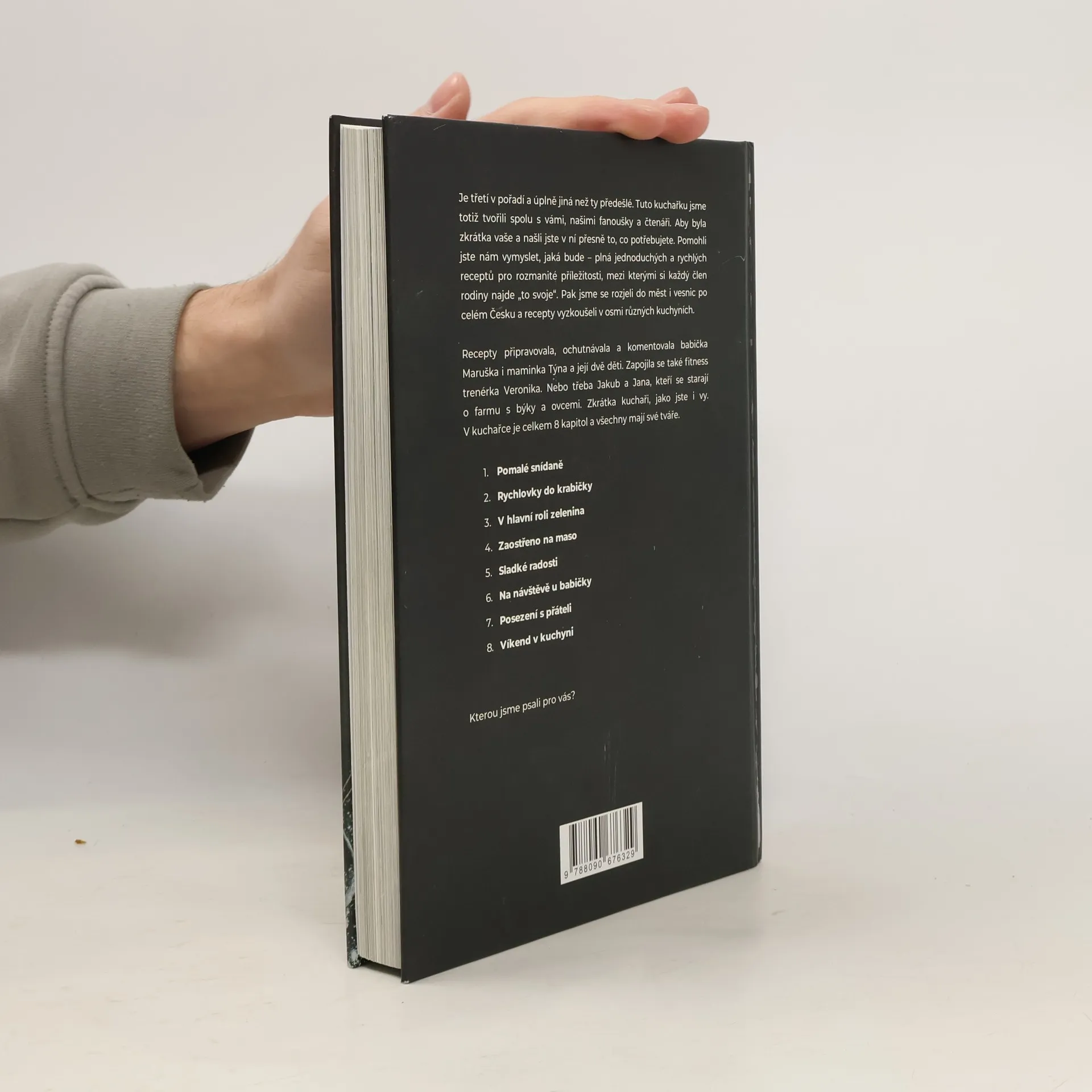 Máme za sebou pěkný kus cesty. Slíbili jsme, že připravíme kuchařku podle vašich přání. Tak jsme pracovali 8 měsíců, ujeli 1 438 kilometrů, vařili v osmi kuchyních po různých koutech Česka – a nezapomněli se radit s vámi. Děkujeme vám za pomoc a podporu! V kuchařce najdete od každého něco – péct budete s mámou Týnou a jejími dětmi. S babičkou Maruškou a její vnučkou ochutnáte tradiční recepty v netradiční podobě. A s fitness trenérkou Verčou se podíváte na to, jaké recepty si můžete zabalit s sebou do krabičky. V celkem 8 kapitolách najdete 110 receptů pro různé příležitosti.