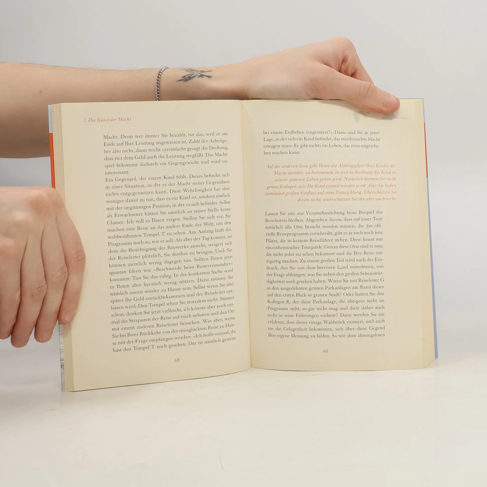 „Kinder werden zu Tyrannen“, weil sie der Spiegel derer sind, die sie ins Leben begleiten. Dieser Denkansatz ist für den Bestseller-Autor Bernhard Moestl der Ausgangspunkt für eine spannende Gedankenreise in die Welt der Erziehung. Für ihn haben Eltern die Funktion von Reiseleitern, die ihre Kinder ins Leben begleiten. Und wie alle guten Reiseleiter, sollten Eltern sich für ihre verantwortungsvolle Aufgabe wappnen und vorerst selbst drei Wege beschreiten: Der erste Weg ist „der Weg zum Selbst“. Nach asiatischer Einsicht setzt Führungsstärke die Fähigkeit zur Selbstführung voraus. Ohne Reflexion der eigenen Wurzeln und dem kritischen Hinterfragen der eigenen Kindheit ist ein verantwortungsvolles Denken und Führen von Kindern nicht möglich. Der zweite Weg ist der „Weg zum Kind“. Es ist eine Kunst das eigene Kind mit Respekt zu behandeln, es aber auch in seine Grenzen zu weisen, ähnlich einem Reiseleiter, der vor Gefahren warnt, die sich auf dem Weg befinden. An dritter Stelle steht der „Weg ins Leben“. Hier lernen Eltern, ihr Kind vertrauensvoll loszulassen, d. h. sie gewinnen die Erkenntnis, dass Kinder sich in ihrer Welt selbständig bewegen müssen, auch in Krisensituationen. Wenn Erziehende diese drei Wege beschritten haben und sich ihrer Reiseleiterfunktionen bewusst geworden sind, werden aus Kindern glückliche Menschen und später auch gute Eltern.