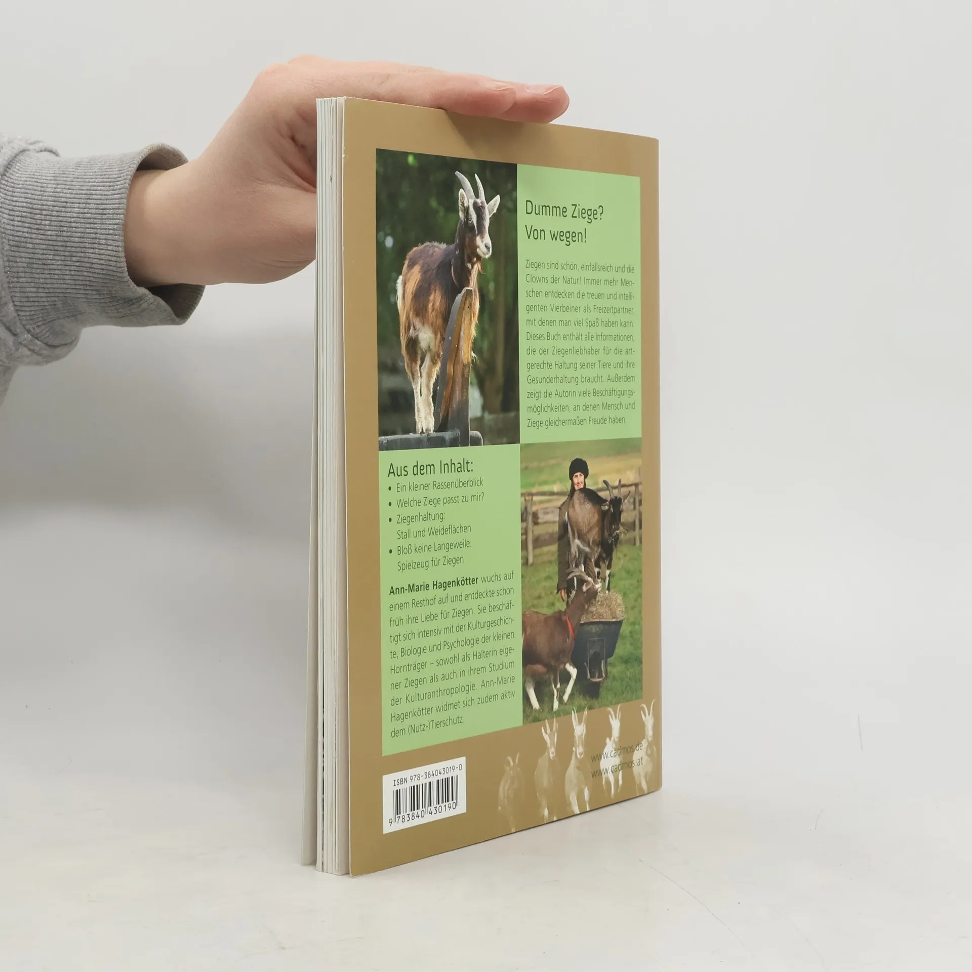 Ziegen sind schön, einfallsreich und die Clowns der Natur–alles andere also als dumme Haustiere, als die sie manchmal gelten. Mit ein wenig Grundlagenwissen lassen sich Ziegen auch auf kleineren Flächen artgerecht halten, und der Ziegenbesitzer kann sehr viel Freude an seinen besonderen Schützlingen haben. Ann-Marie Hagenkötter, die selbst viele Jahre Erfahrung in der Ziegenhaltung mitbringt, stellt in diesem Buch alles Wissenswerte rund um die Bedürfnisse der Ziegen hinsichtlich Haltung, Fütterung und Beschäftigung zusammen. Wer sich auf die sensiblen tierischen Partner einstellt, kann sich einer harmonischen Beziehung zu einem treuen Freund sicher sein. Neben wichtigen Informationen zur Anschaffung, artgerechten Unterbringung, Versorgung und Pflege gibt das Buch viele Tipps zur gemeinsamen Freizeitgestaltung, die von kleinen Spielen über ausgedehnte Wandertouren bis hin zum Gespannfahren mit Ziegen reichen.